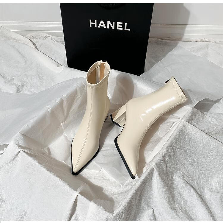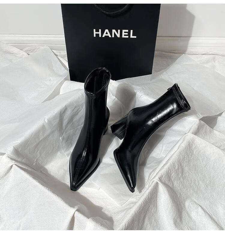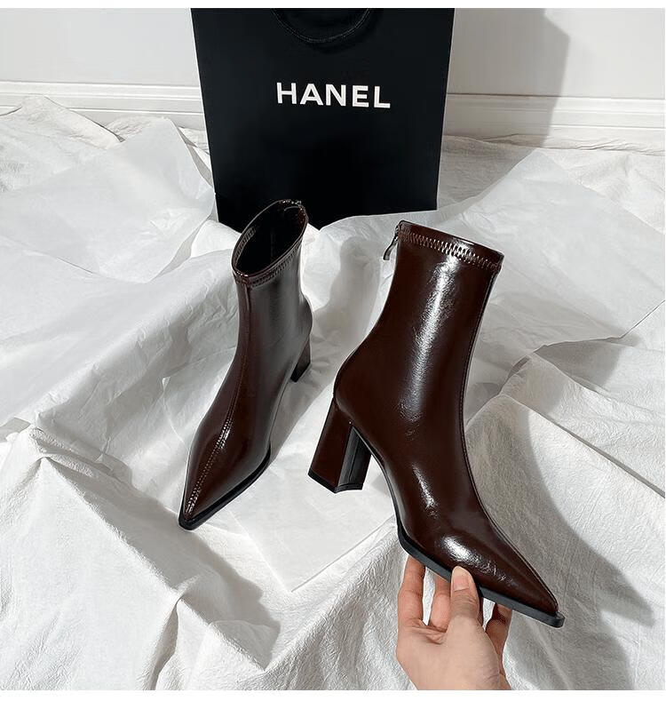 Mac Jabags Brown Short Boots Women's High Heels Autumn and Winter New French Small Ankle Boots Back Zipper Elastic Pointed Thick Heel Slim Boots Black Heel Height 7cm Velvet Lining 34