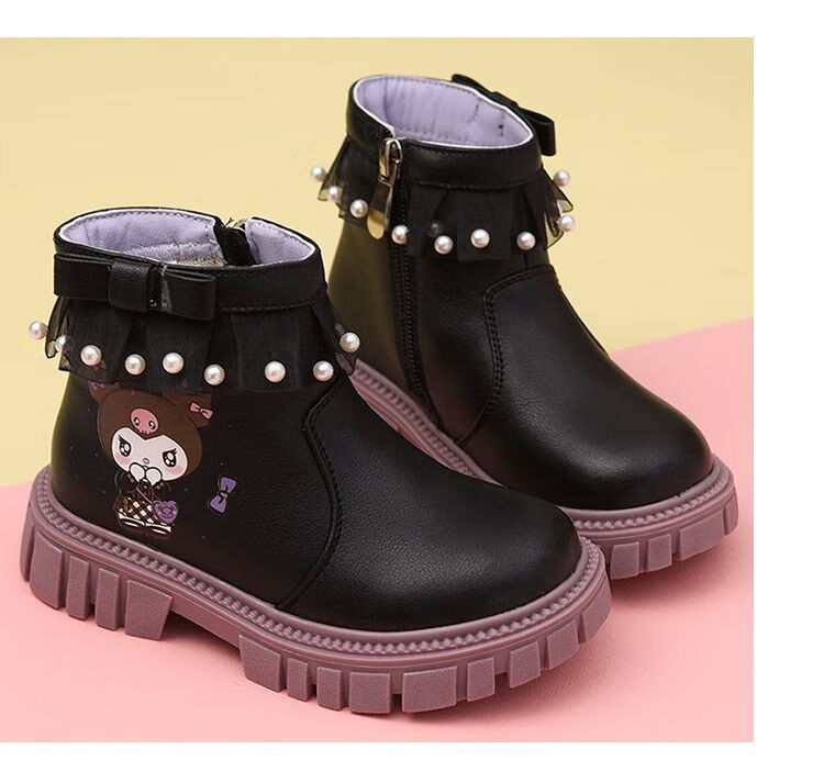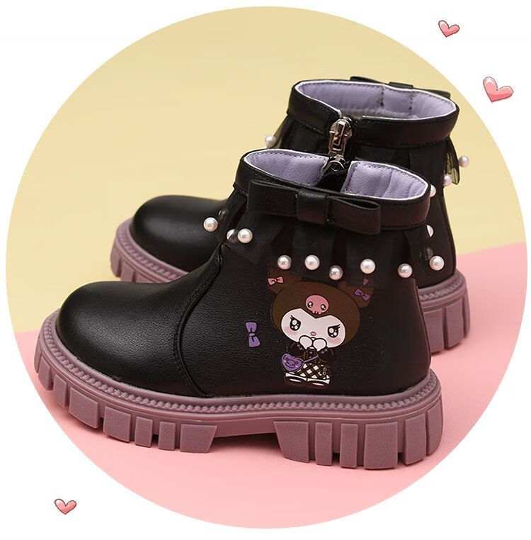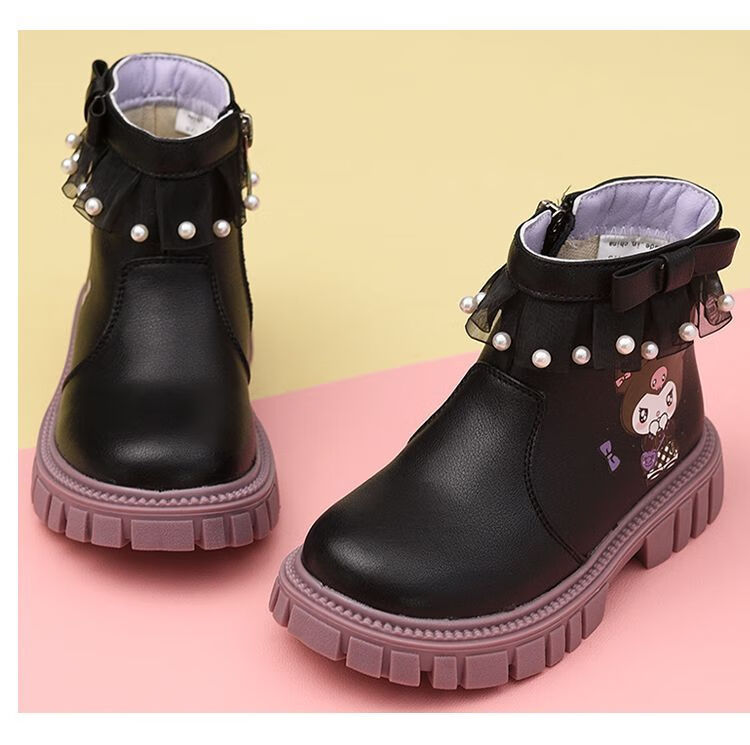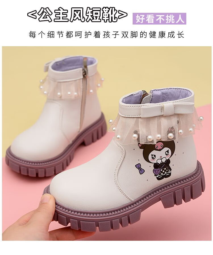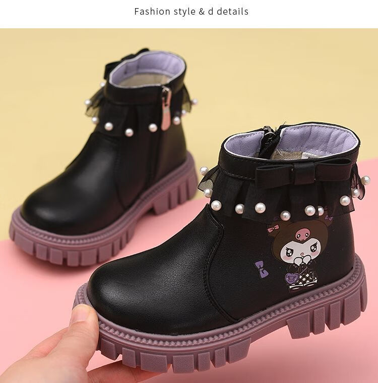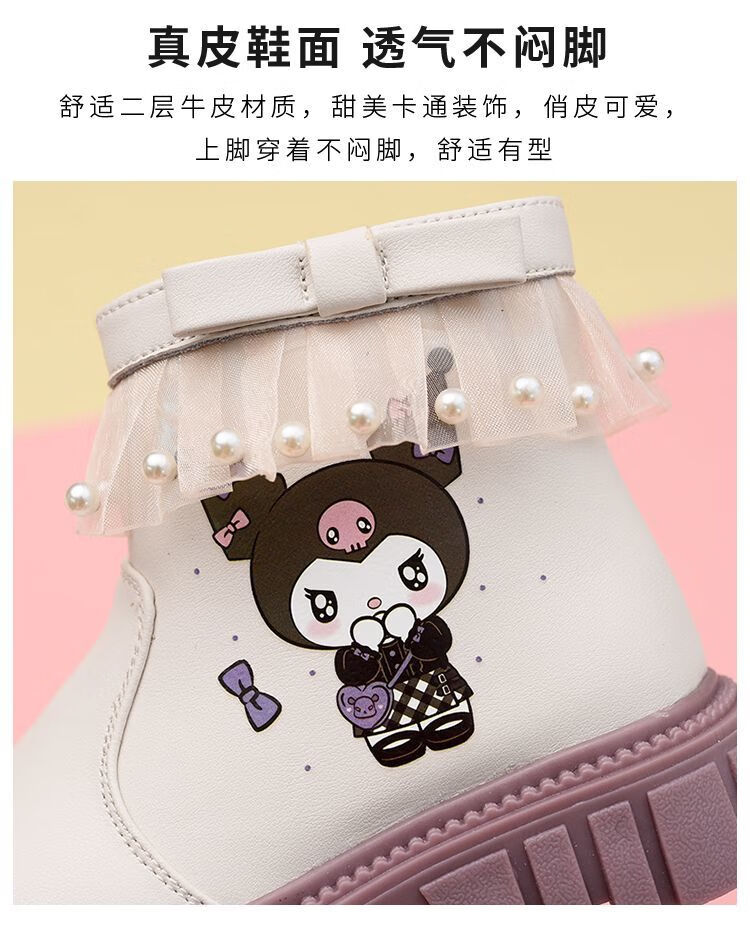 G.duck Little Yellow Duck Girls Short Boots Genuine Leather Children's Martin Boots 2025 Autumn and Winter New Kuromi Children's Shoes Plus Velvet Second Cotton Boots Black Single Boot + Soft Genuine Leather + Light Soft Sole + Kuromi Bow 33 Inner Length Approximately 21.1cm