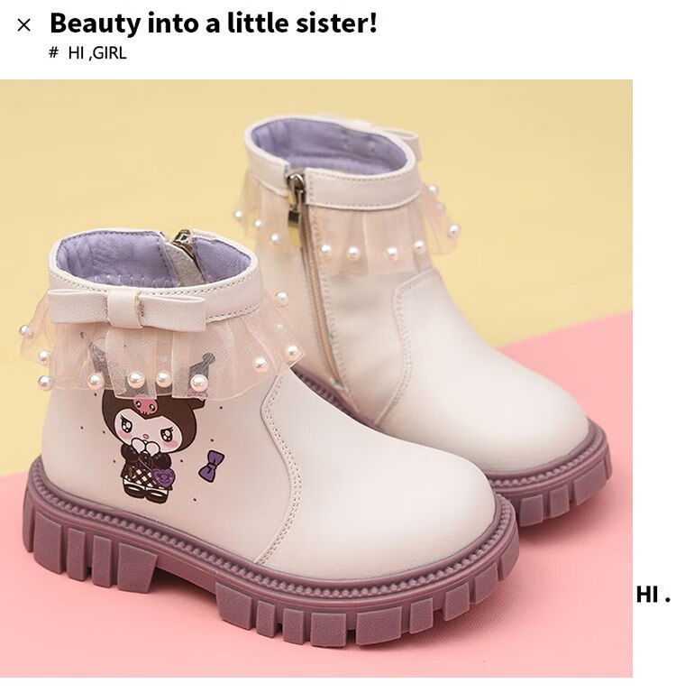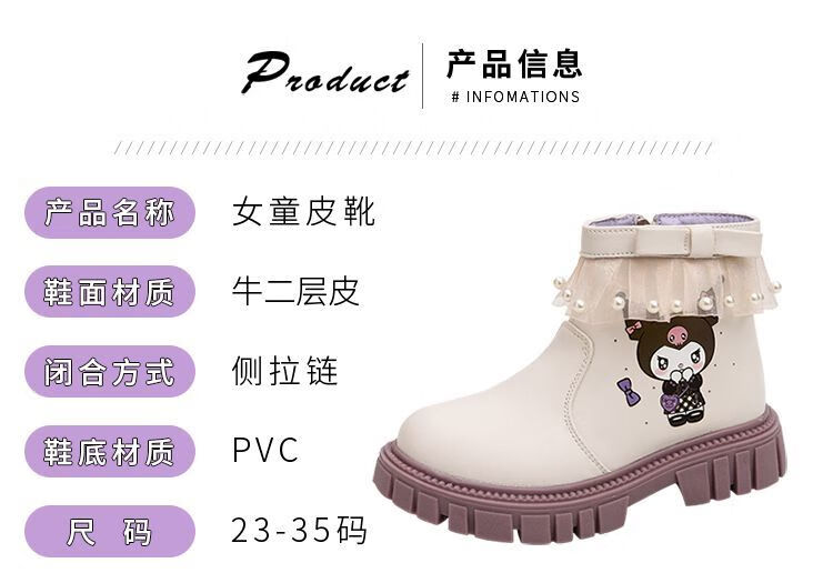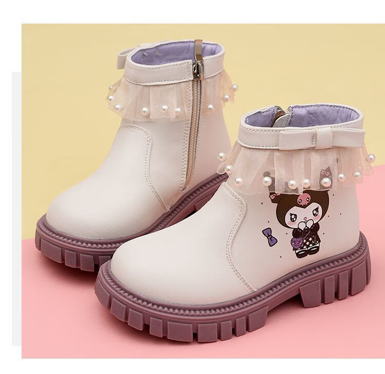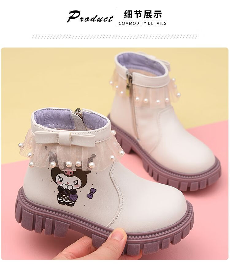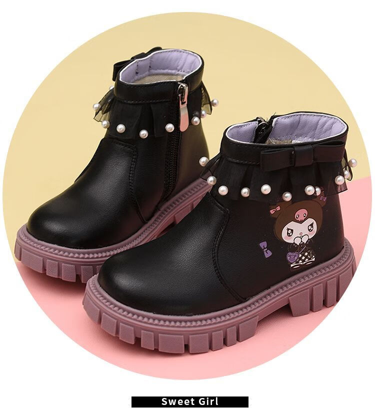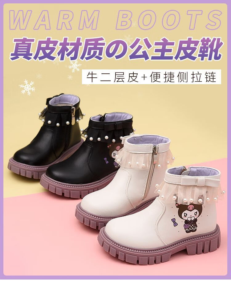 G.duck Little Yellow Duck Girls Short Boots Genuine Leather Children's Martin Boots 2025 Autumn and Winter New Kuromi Children's Shoes Plus Velvet Second Cotton Boots Black Single Boot + Soft Genuine Leather + Light Soft Sole + Kuromi Bow 33 Inner Length Approximately 21.1cm