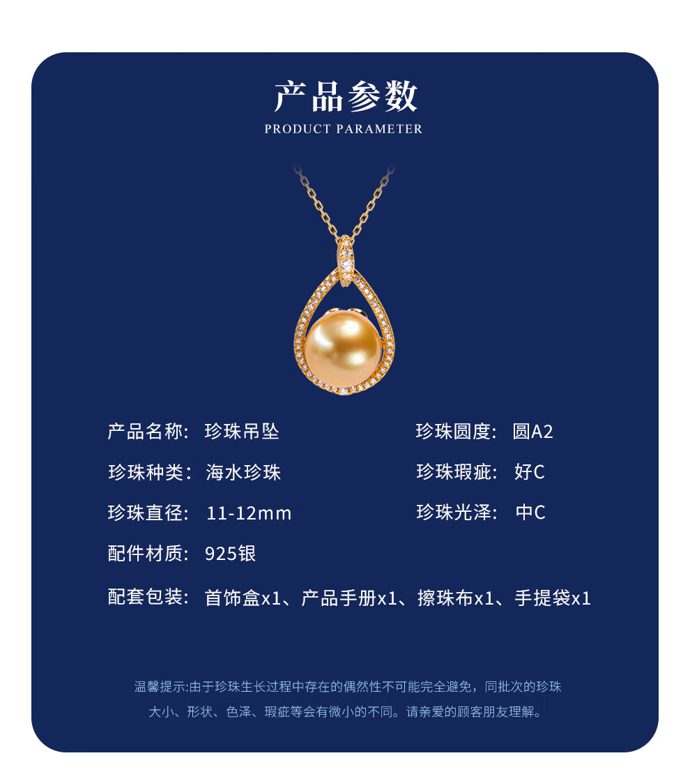 Nanzhu Palace Tahitian Black Pearl South Sea Gold Pearl Seawater Pearl Pendant Elegant and Versatile Gift for Girlfriend C-CJD098SN-J Gold Pearl Pendant 11.0-12.0mm