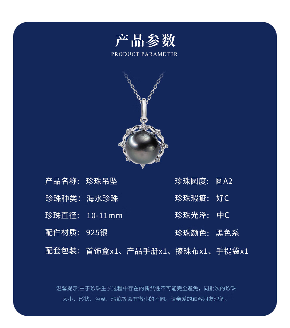 Nanzhu Palace 925 silver seawater pearl pendant black pearl pearl necklace for girlfriend and mother C-HJD100SN-Y 10.0-11.0mm