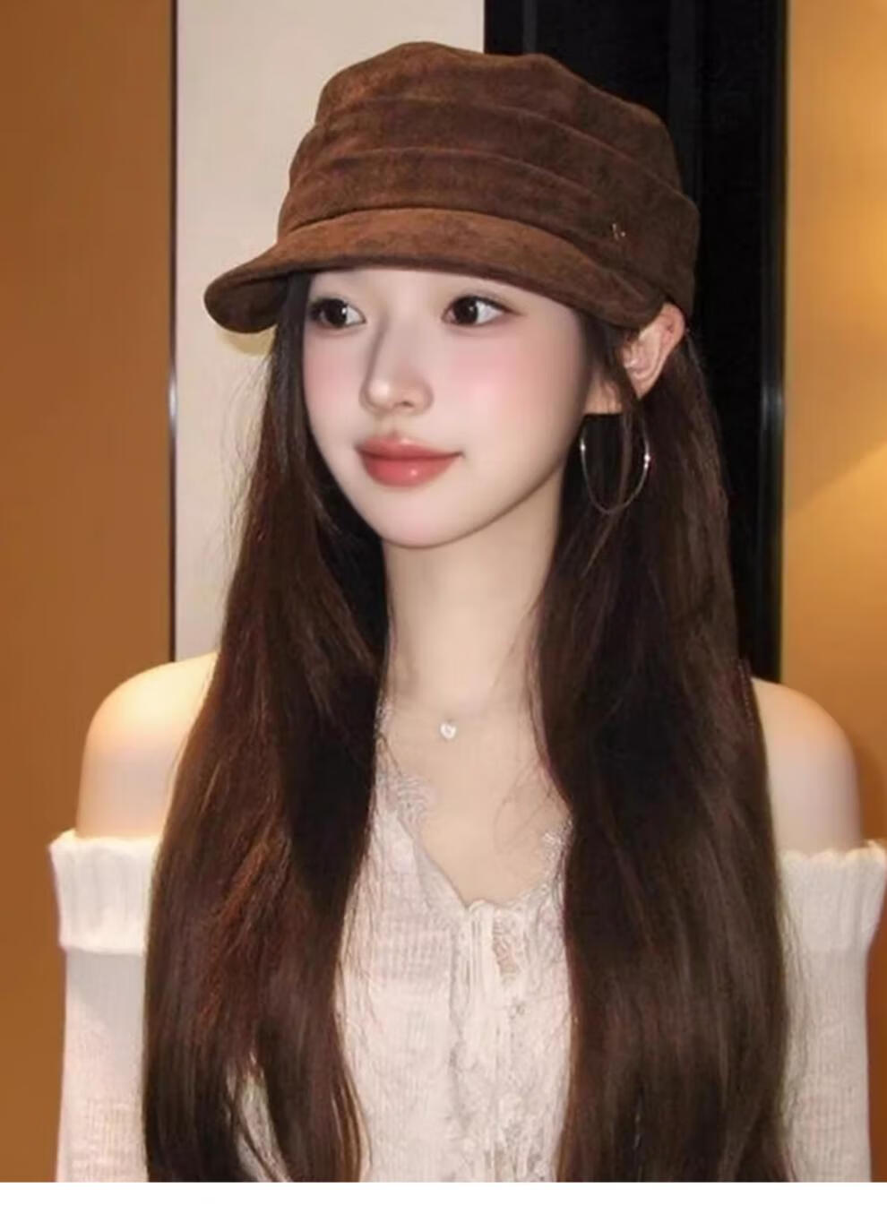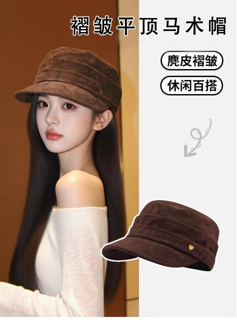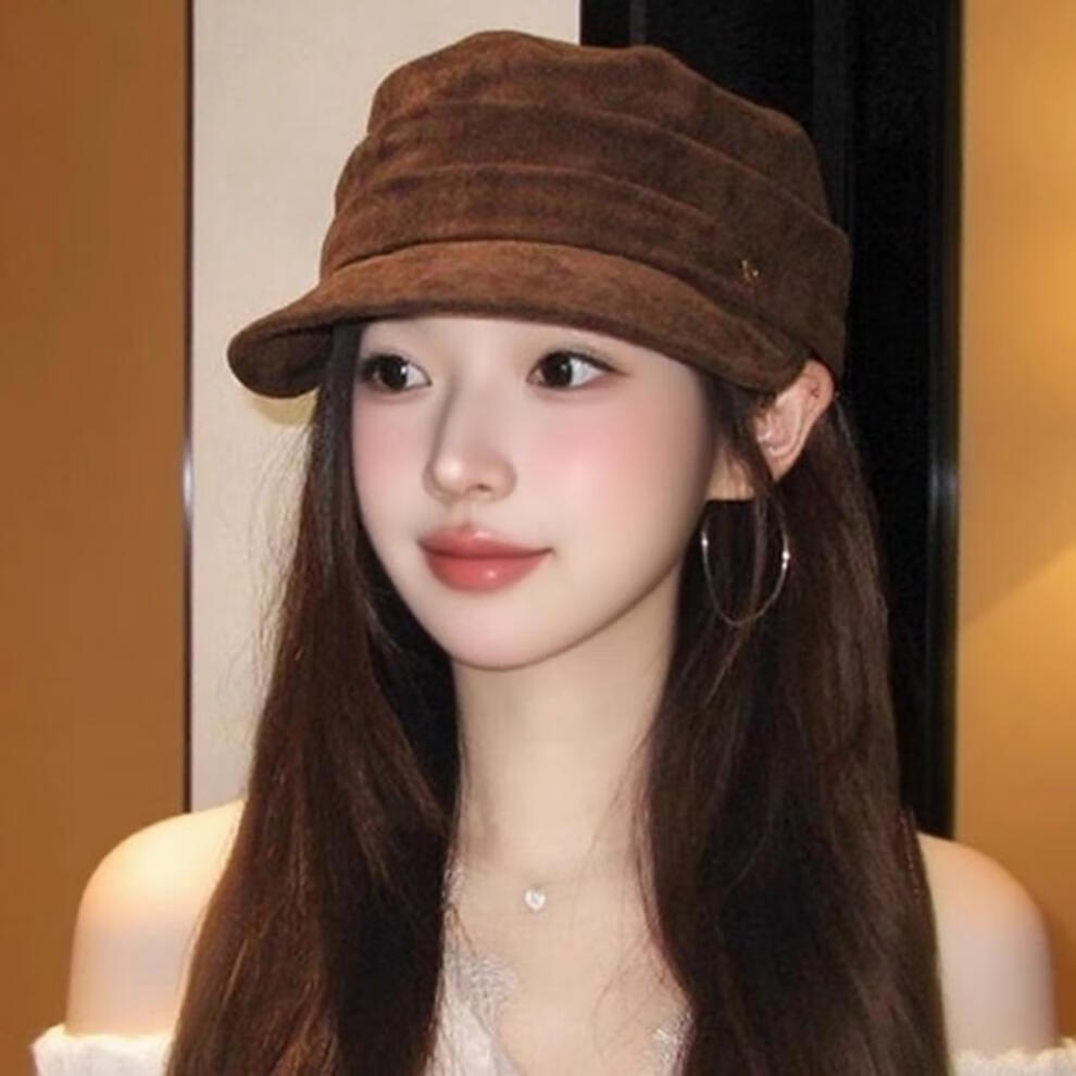 Woodpecker suede pleated flat-top equestrian hat for women 2025 new autumn and winter Maillard retro all-match painter hat trendy off-white suede & equestrian hat one size (56-58cm)
