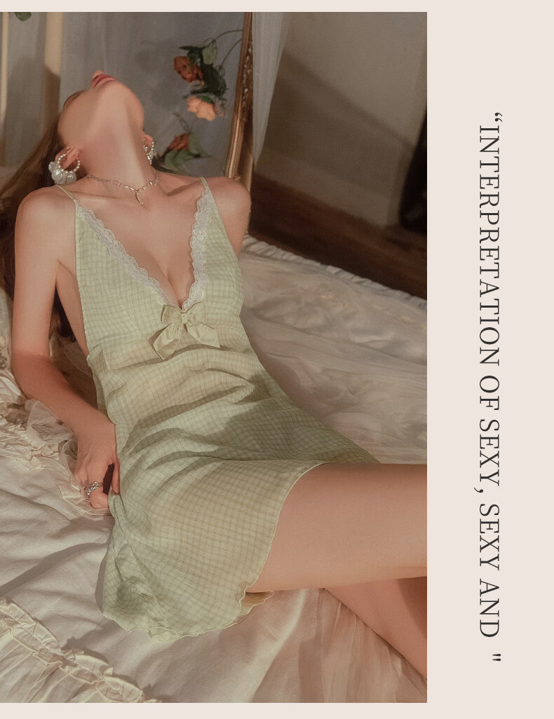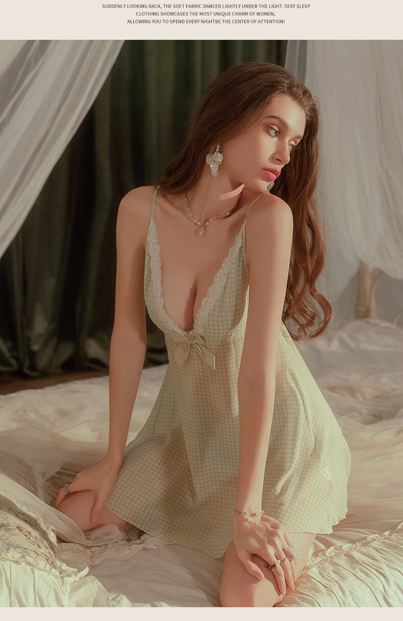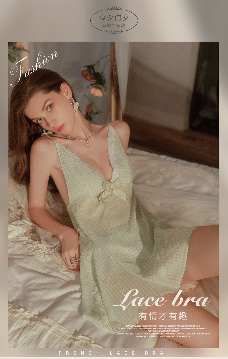 Today and evening sexy pajamas for women 2025 new ice silk plaid bow fun pajamas lace home clothes green plaid (nightgown + shorts) M