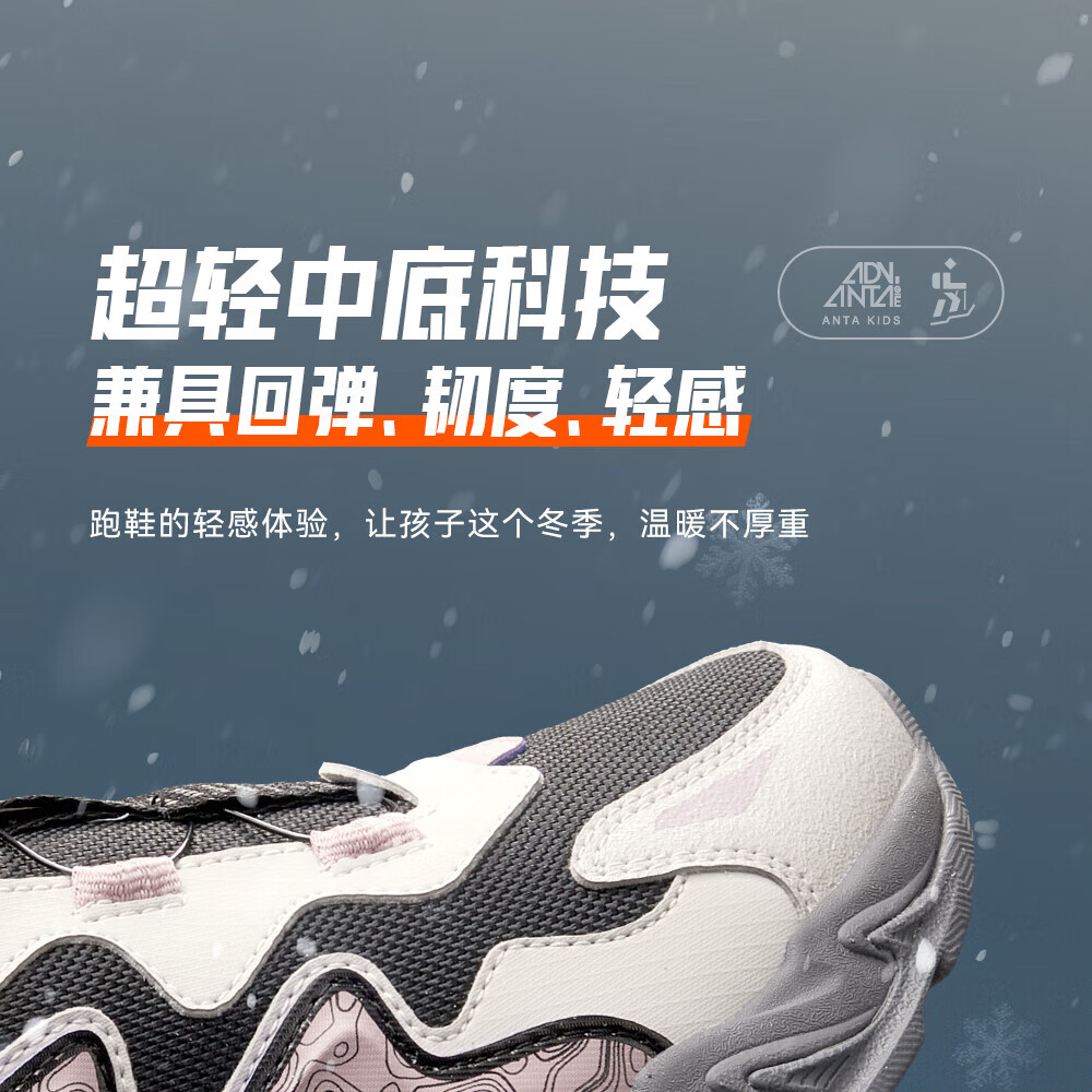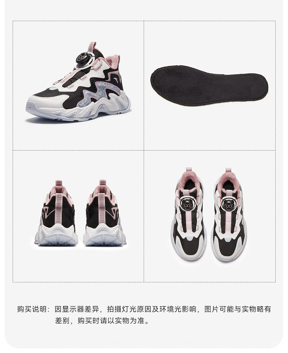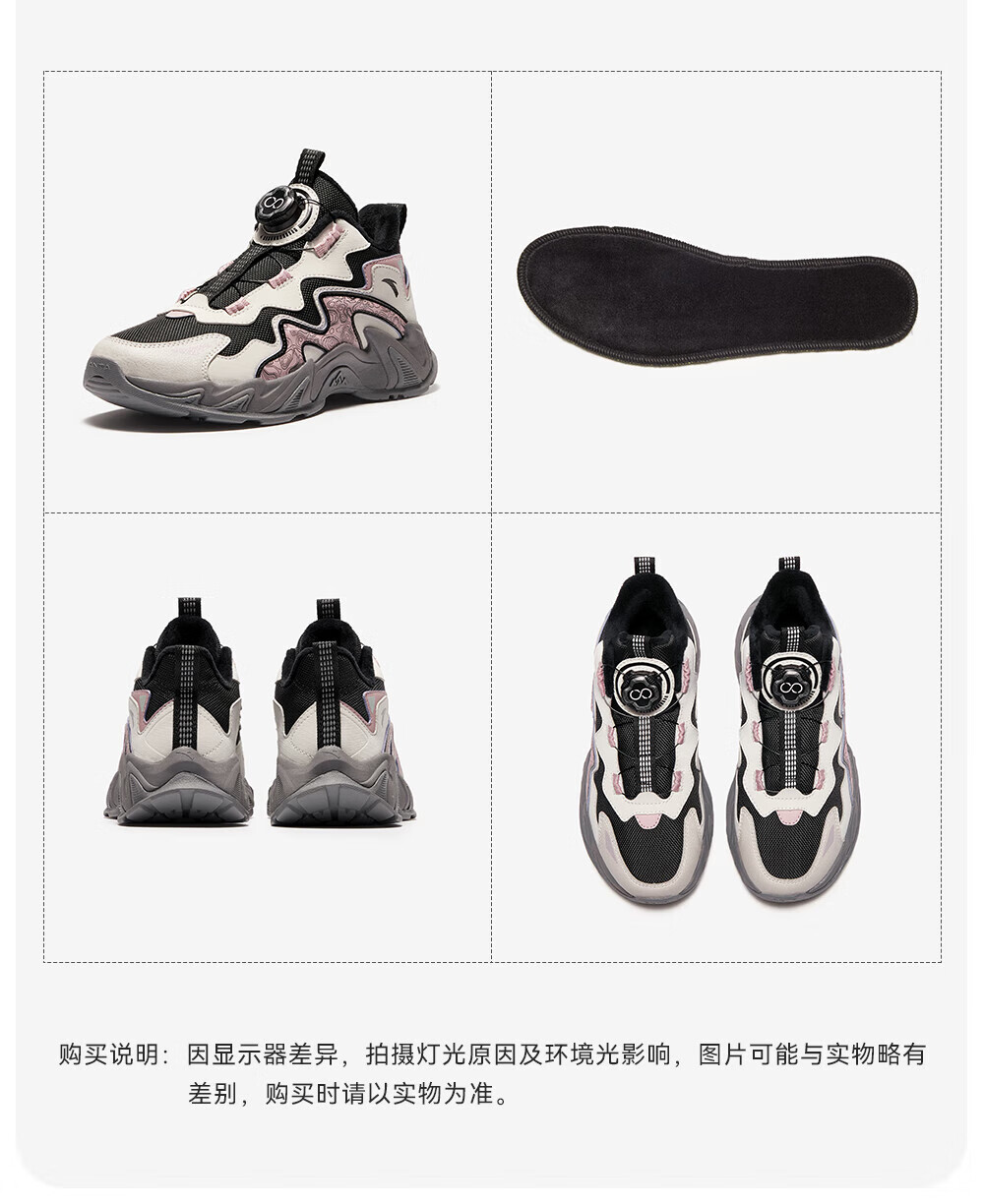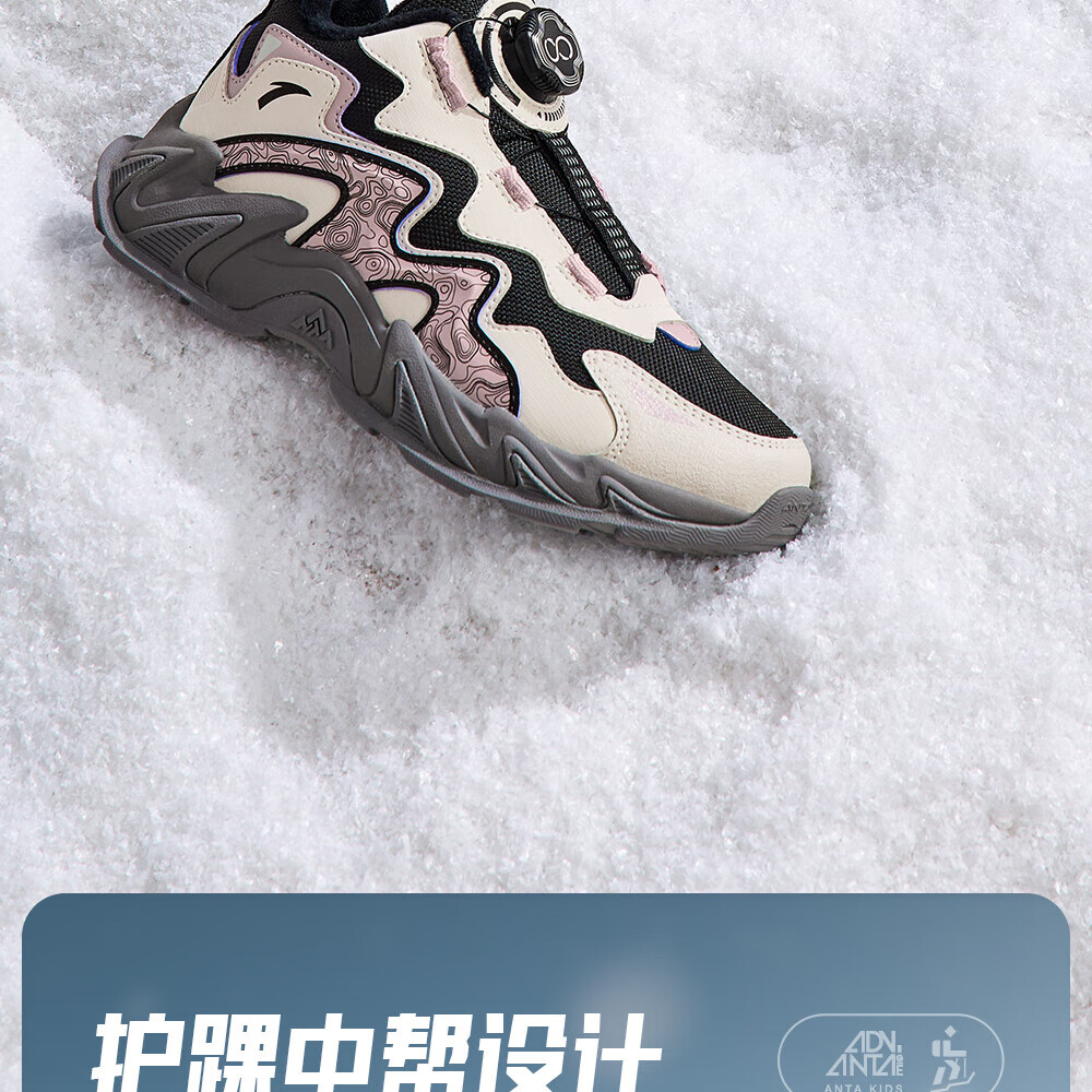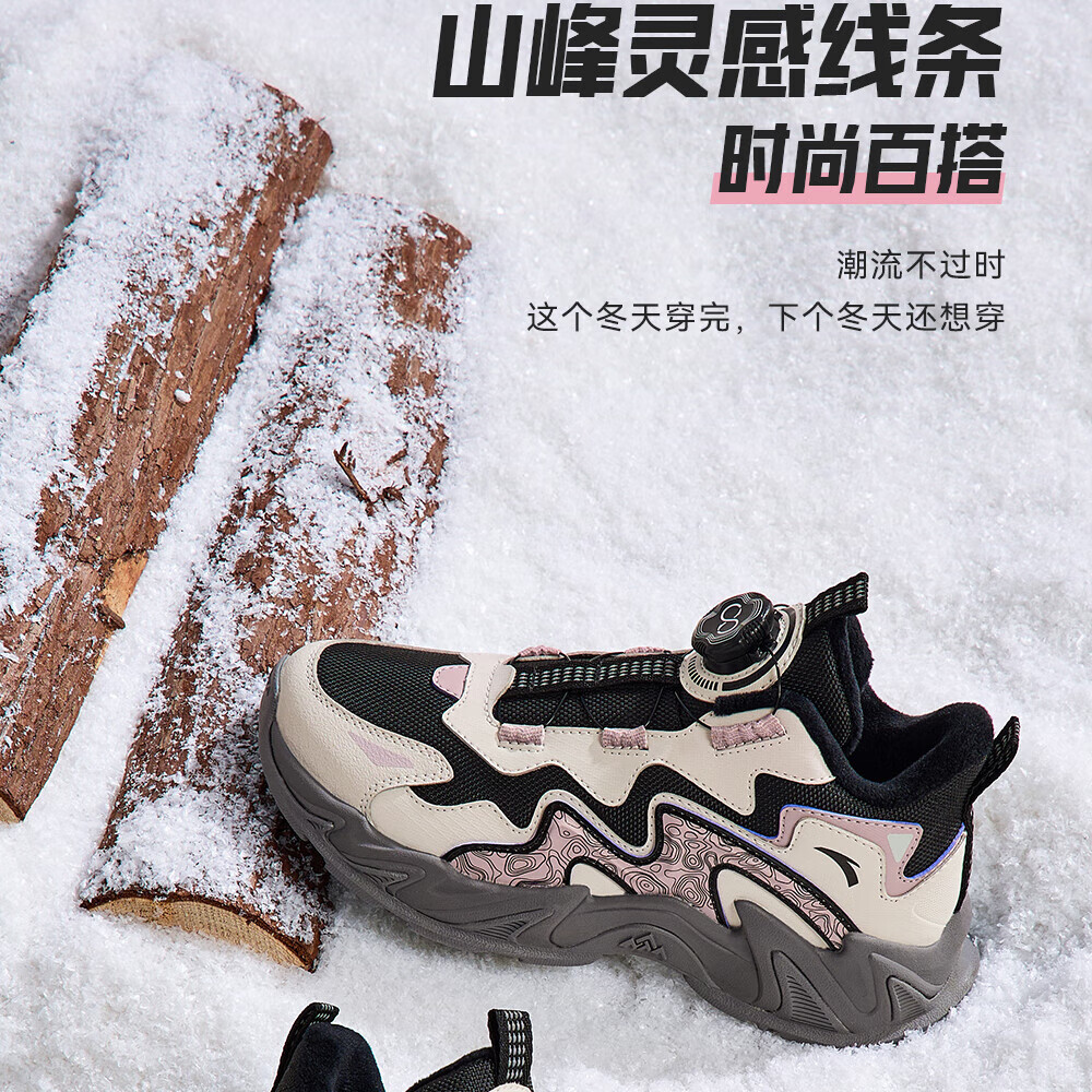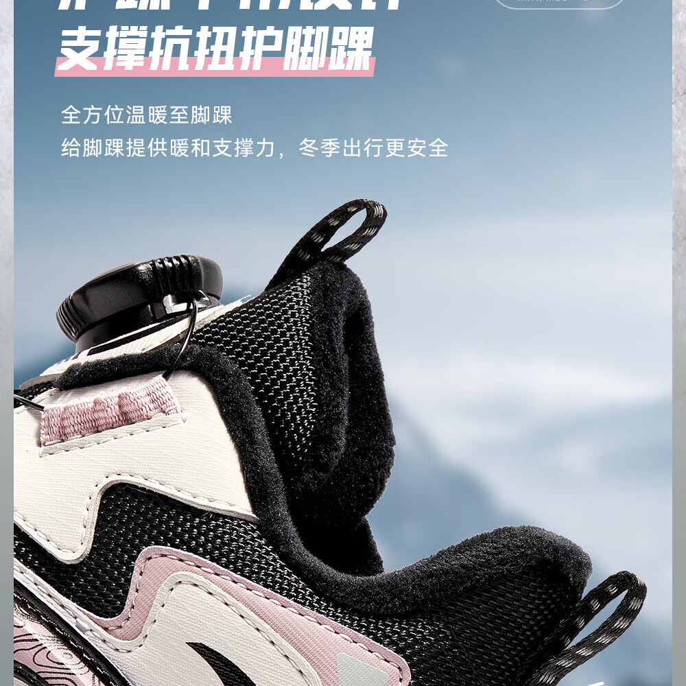 ANTA Children's Cotton Shoes for Girls and Big Kids Ridge Autumn and Winter New Product Plus Velvet Warm Leather Mesh Splicing Knob Button High Top Snow Boots Black/First Degree Gray-3 34