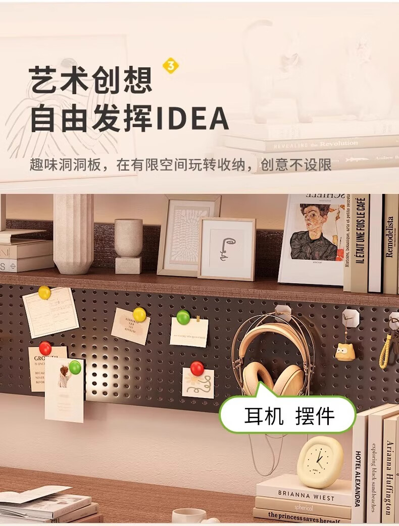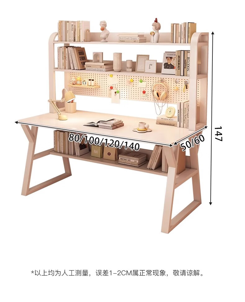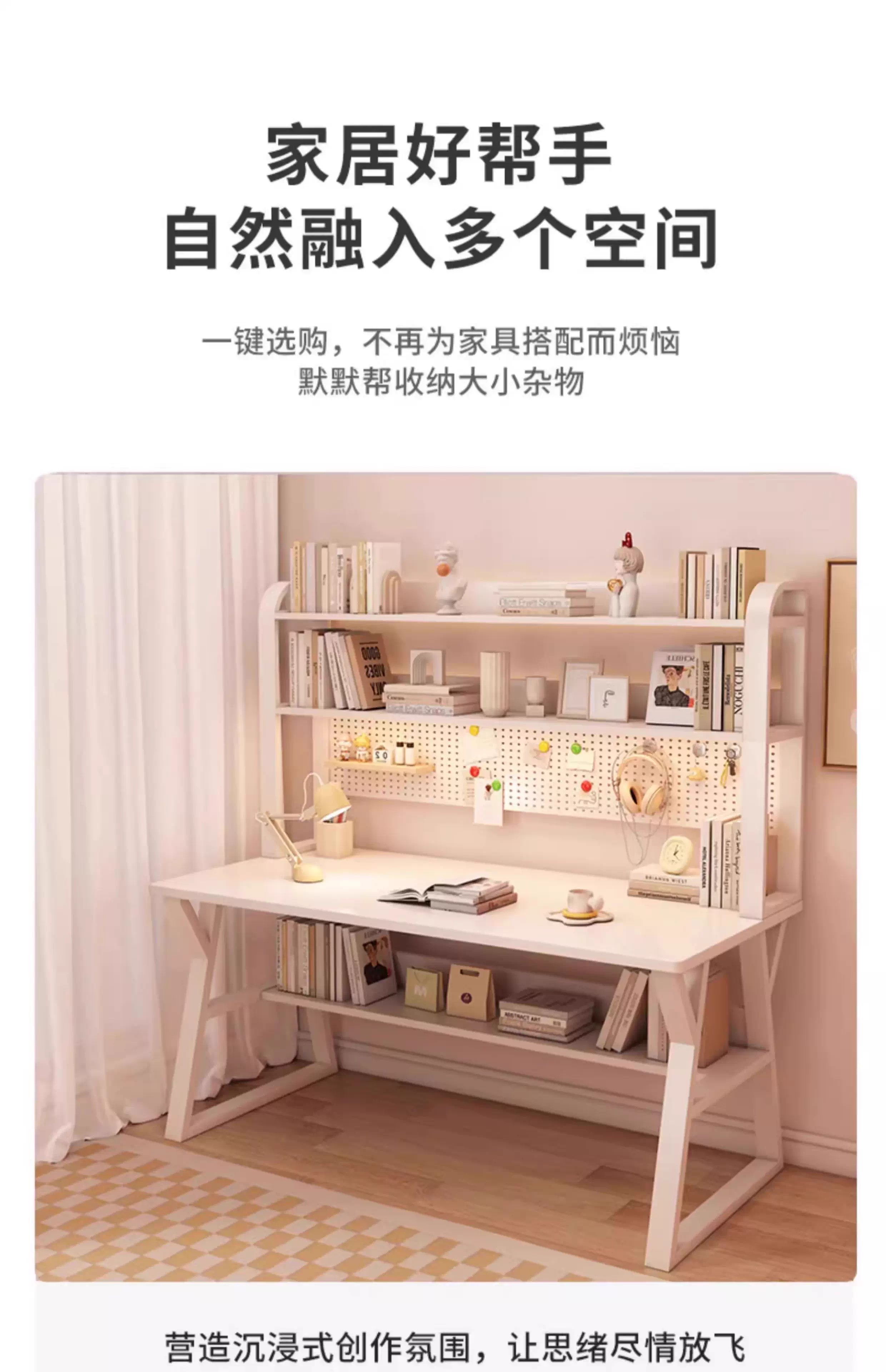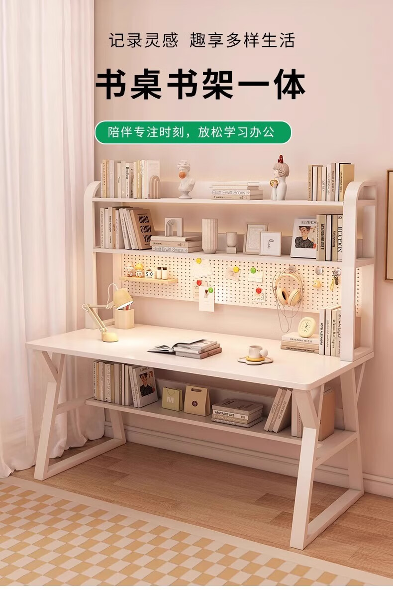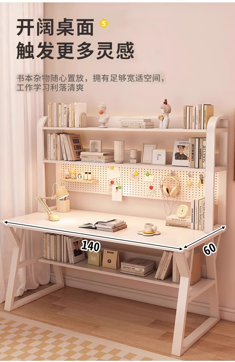 Computer desk desktop home study table with perforated board bedroom desk bookshelf integrated small table simple desk with perforated board 140*60x147CM milk white + magnet 6 + hook 3