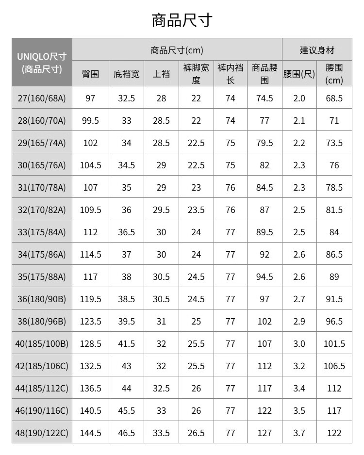 China (cm) 160-165/84-86 165-170 / 88-90 167-172 / 92-96 168-173 / 98-102 170-176 / 106-110