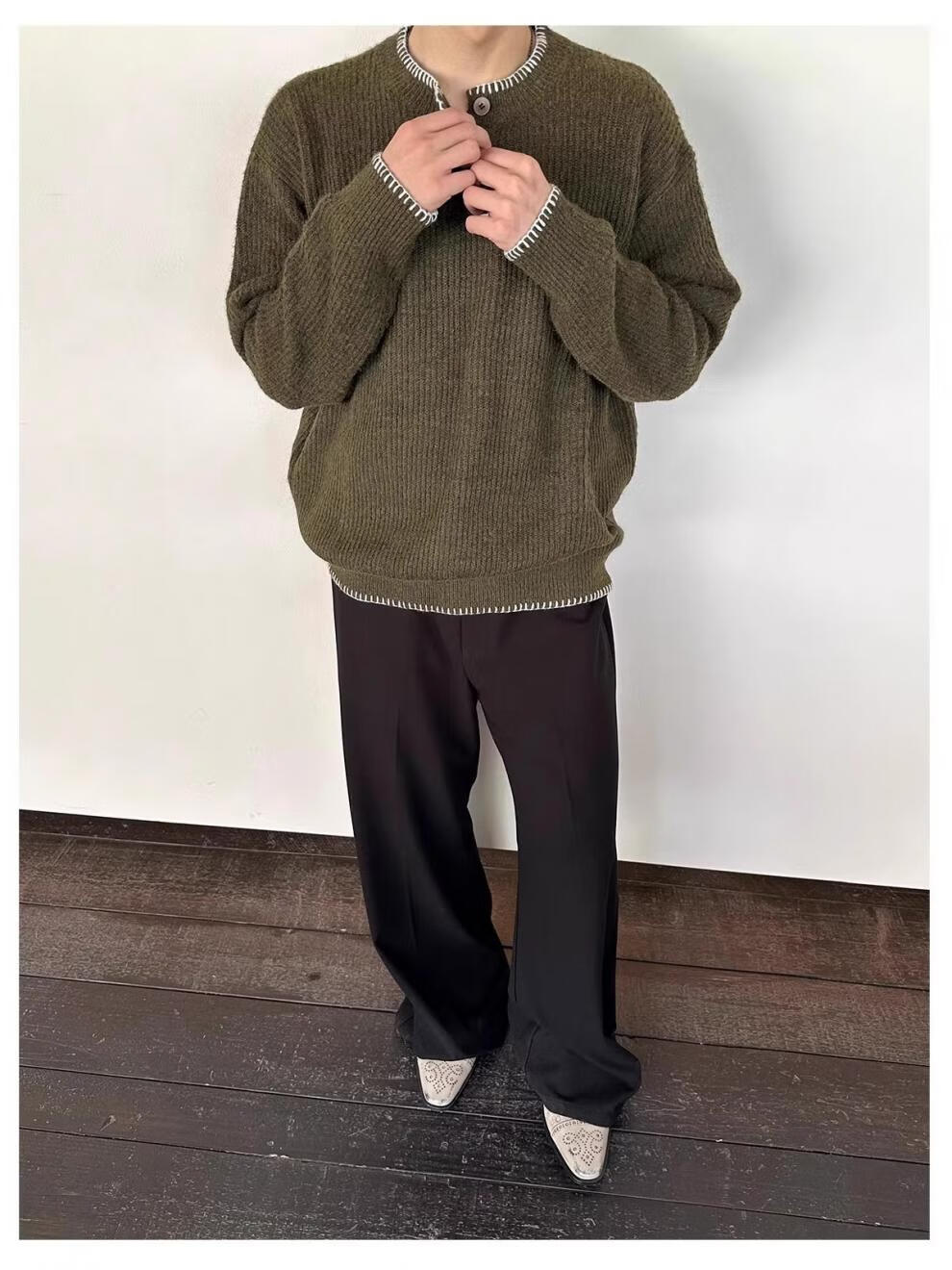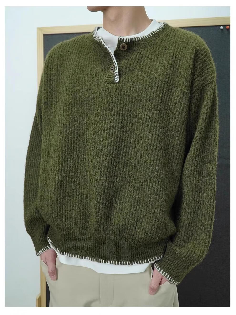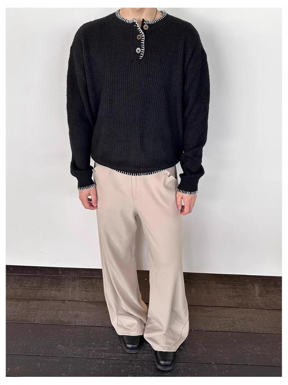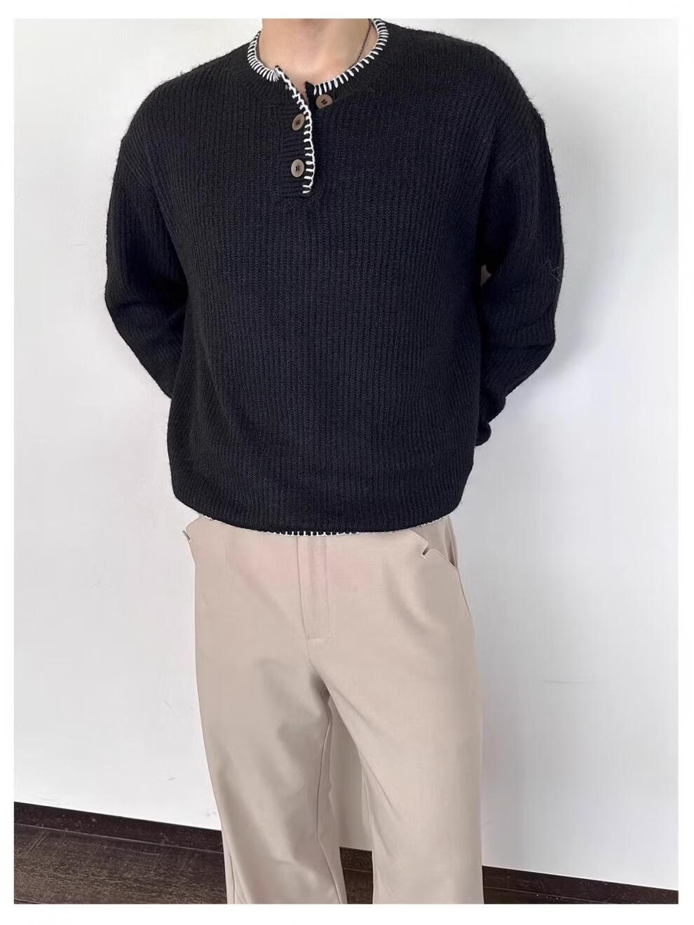 Zhi Sheng Ji Henley collar sweater men's autumn and winter American retro lazy style Korean style loose knitted sweater casual top black M