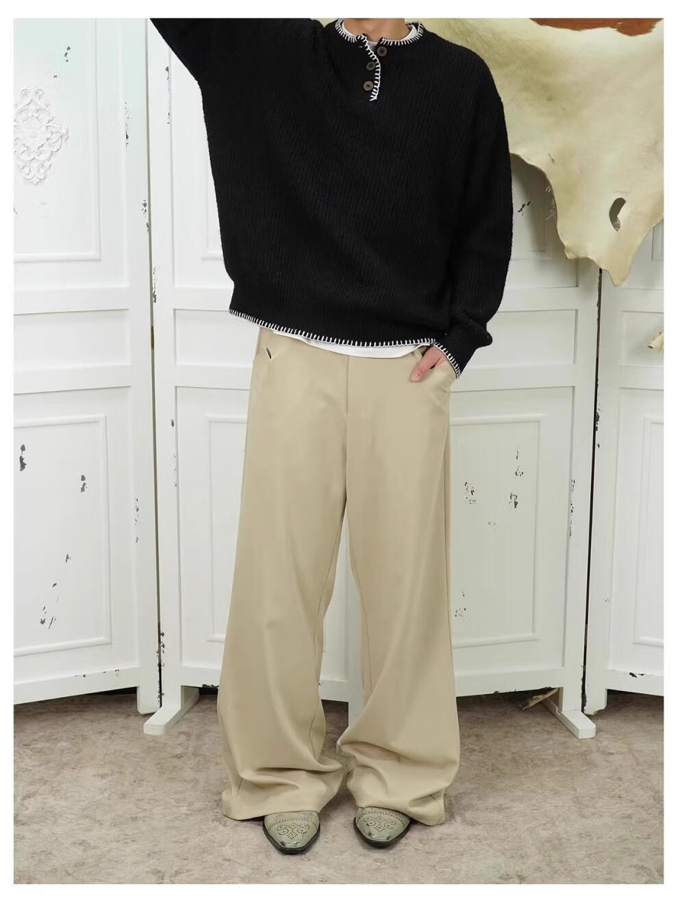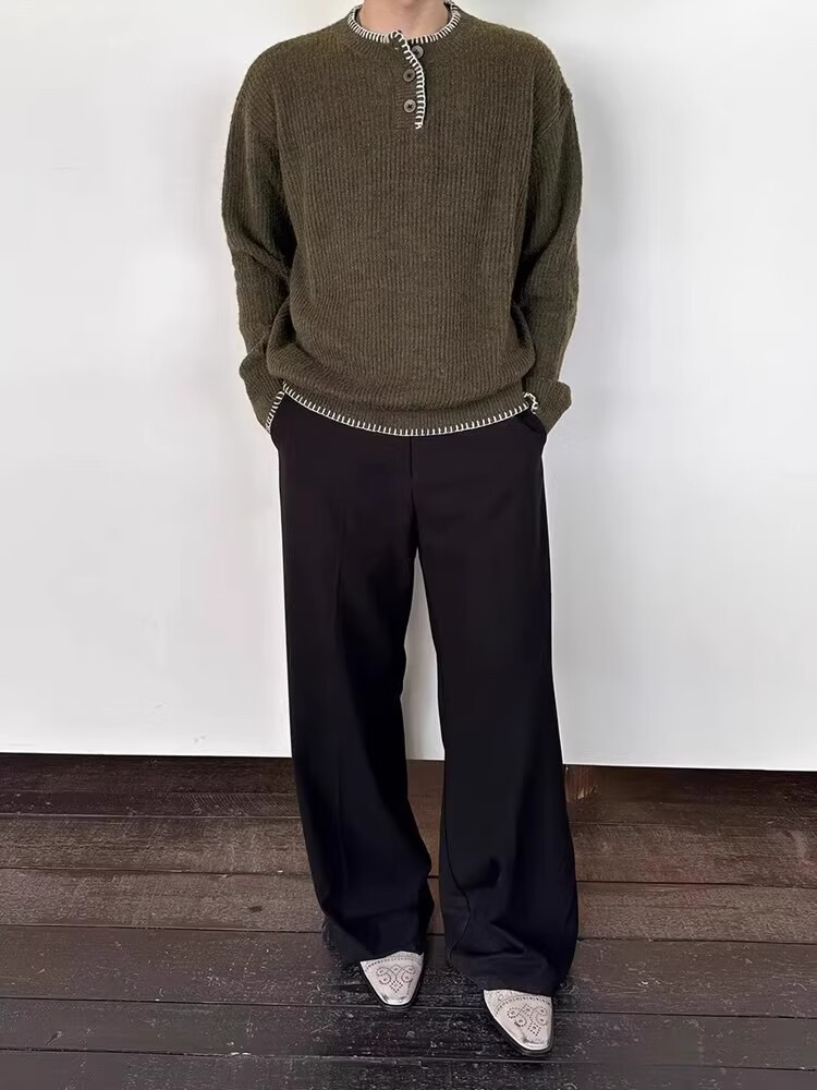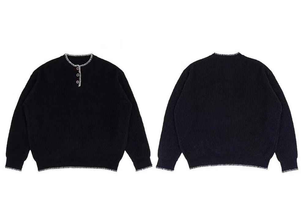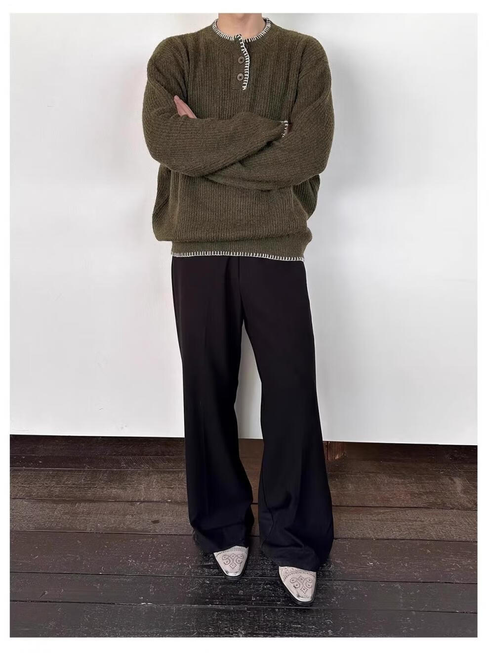 Zhi Sheng Ji Henley collar sweater men's autumn and winter American retro lazy style Korean style loose knitted sweater casual top black M