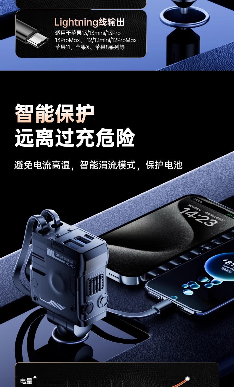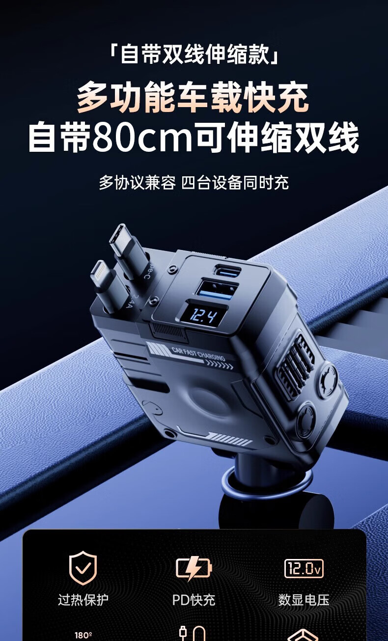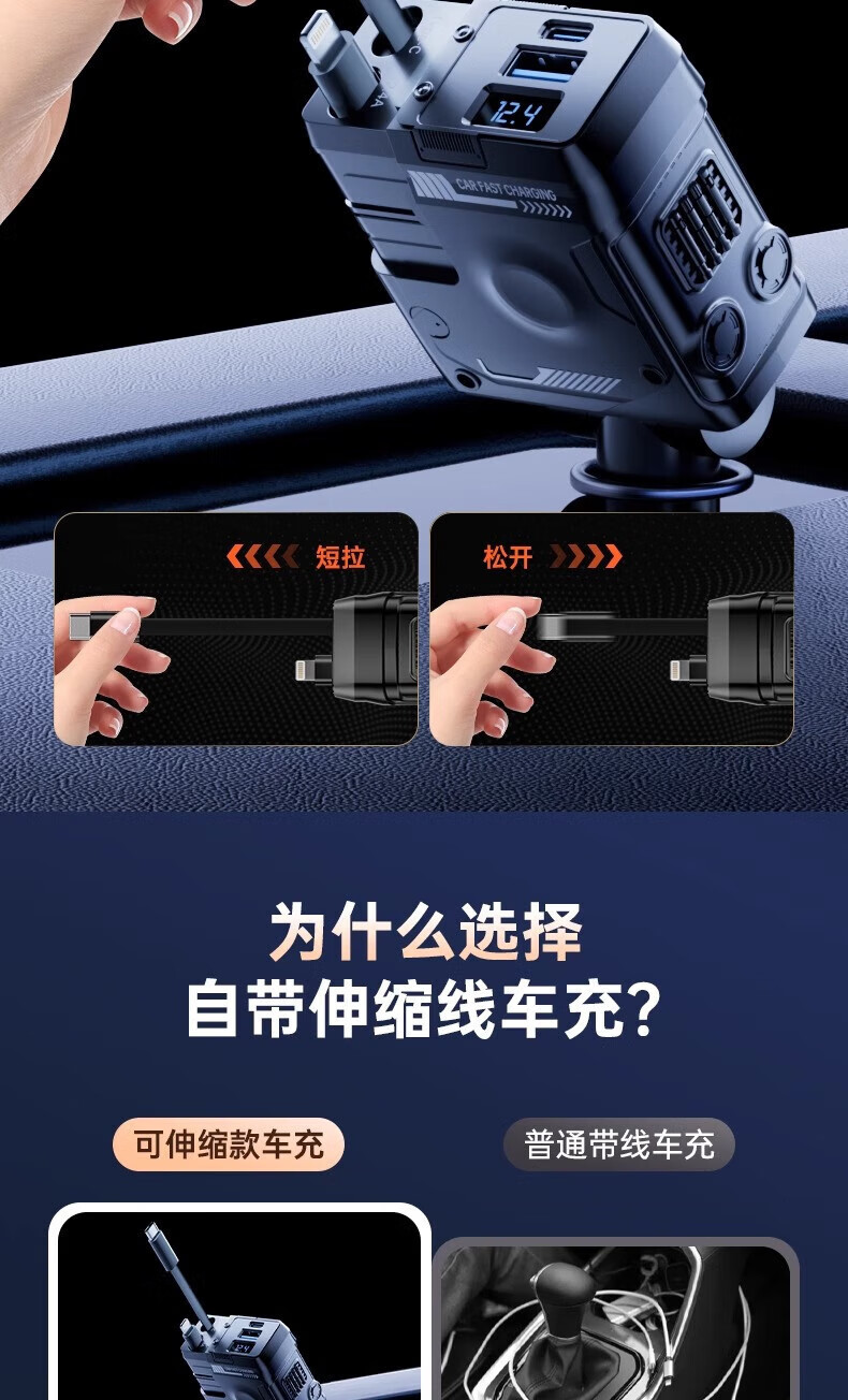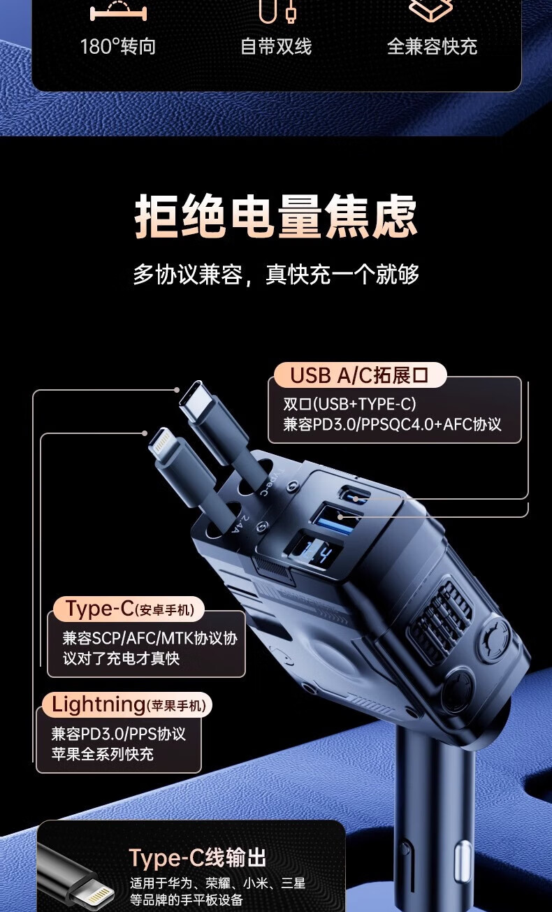 Mecha Retractable Cable Car Charger Car 120W Super Fast Charging One to Three Car Cigarette Lighter Flash Charging Car Charger Black 120W Fast Charging TYPE-C+ Apple Universal