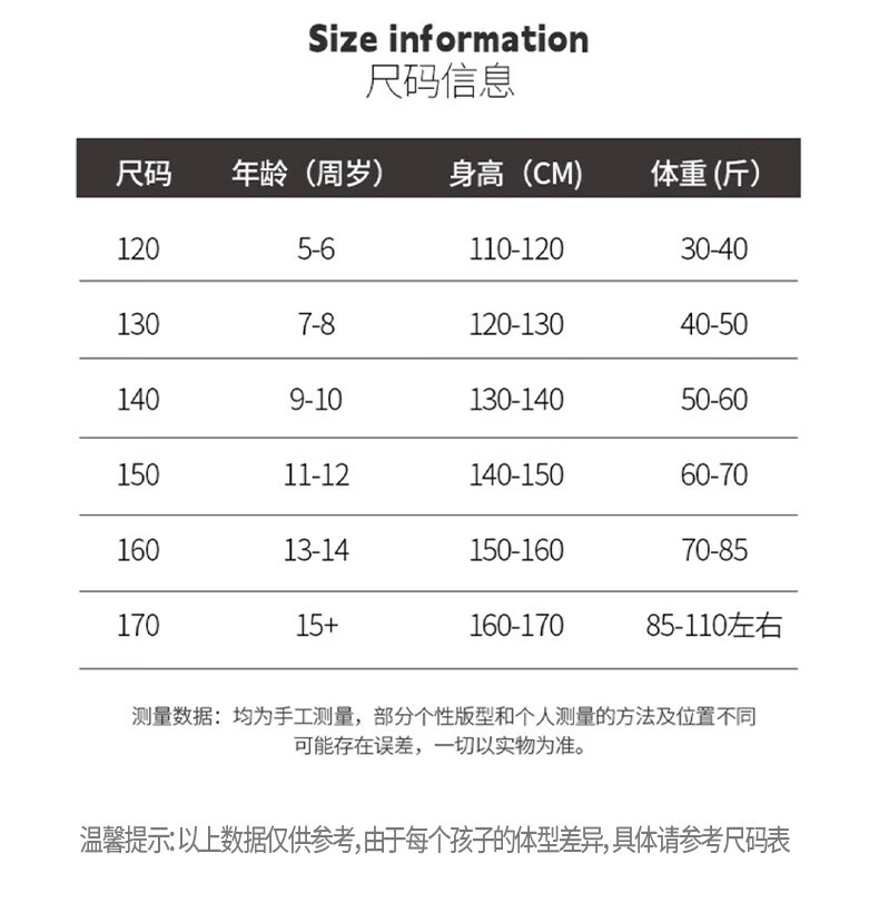 China (cm) 165 / 88-90 170 / 96-98 175 / 108-110 180 / 118-122 185 / 126-130