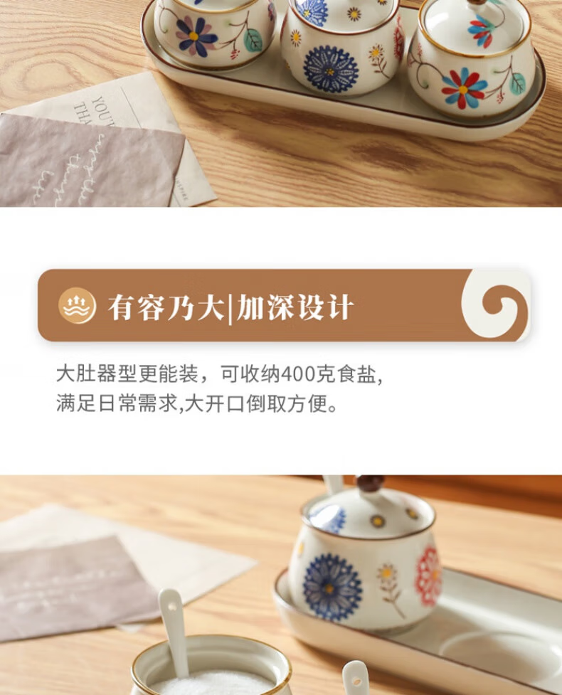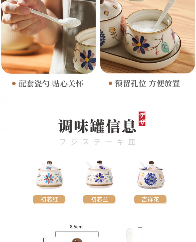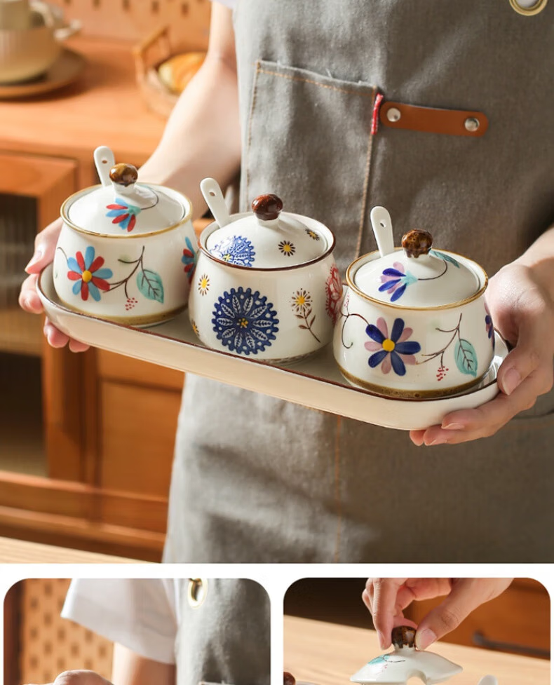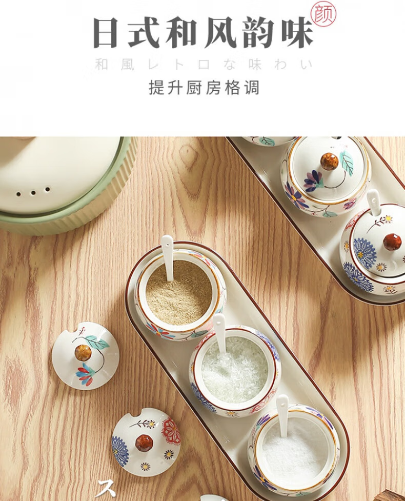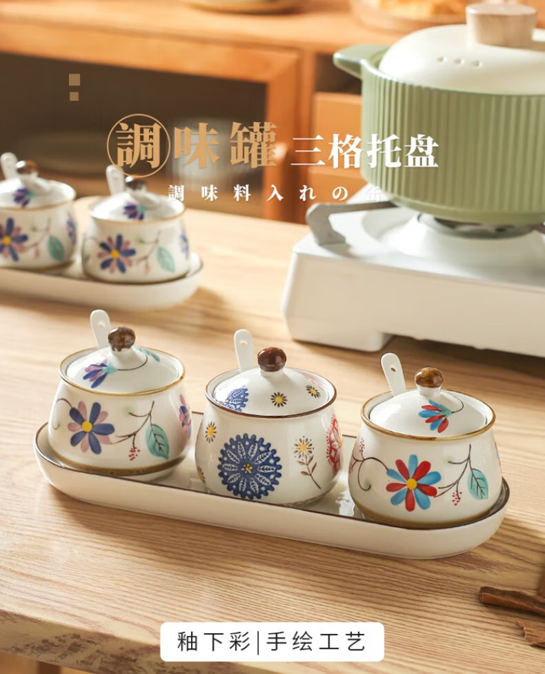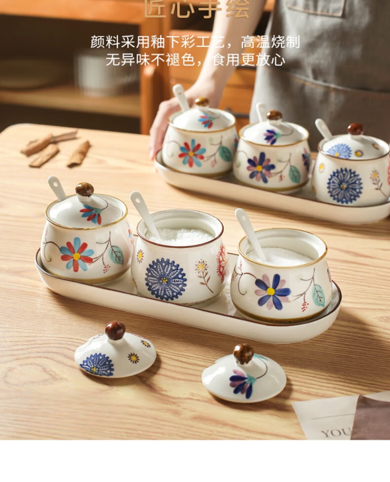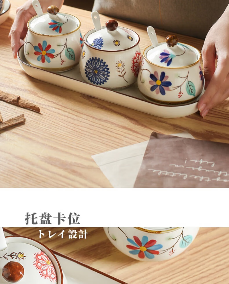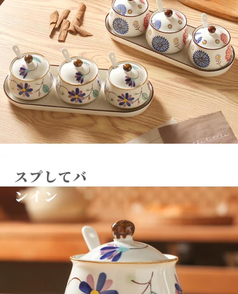 GPHF Japanese ceramic seasoning jar three-piece combination seasoning jar salt shaker home kitchen seasoning box combination set mixed three-piece set + spoon tray