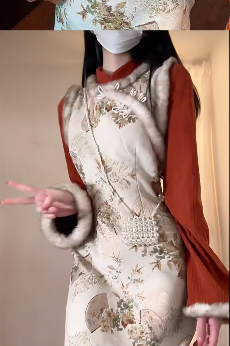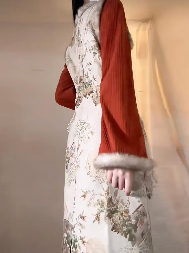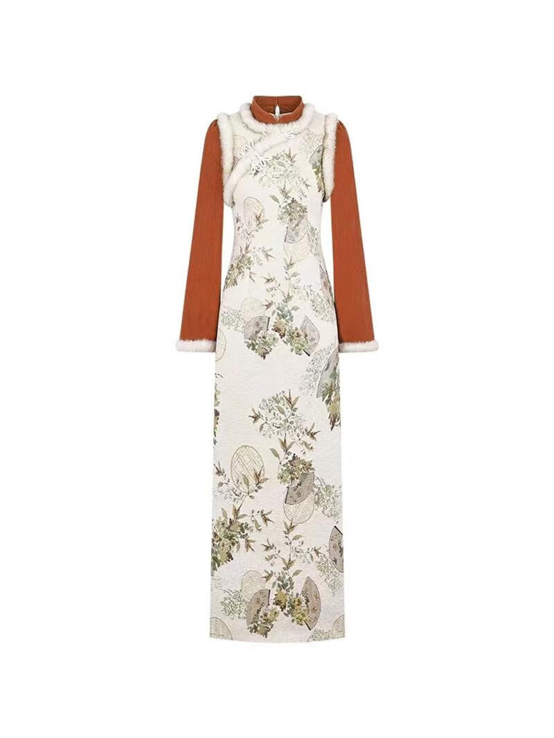 Pierre Cardin New Chinese Style Chinese Style Cheongsam Young Women's Autumn and Winter New Retro Design Temperament Group Pattern Jacquard Long Skirt Orange - Velvet M