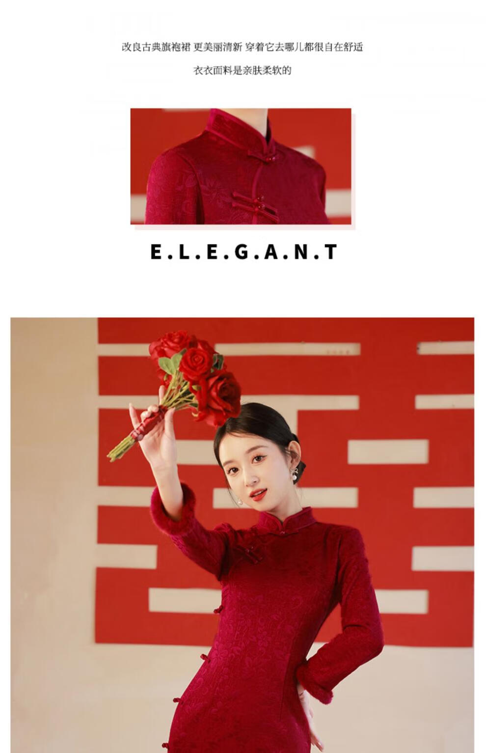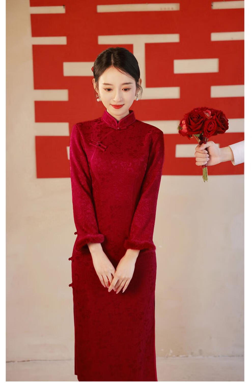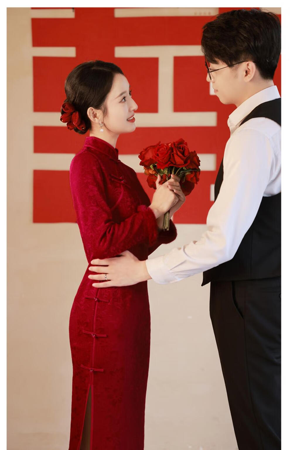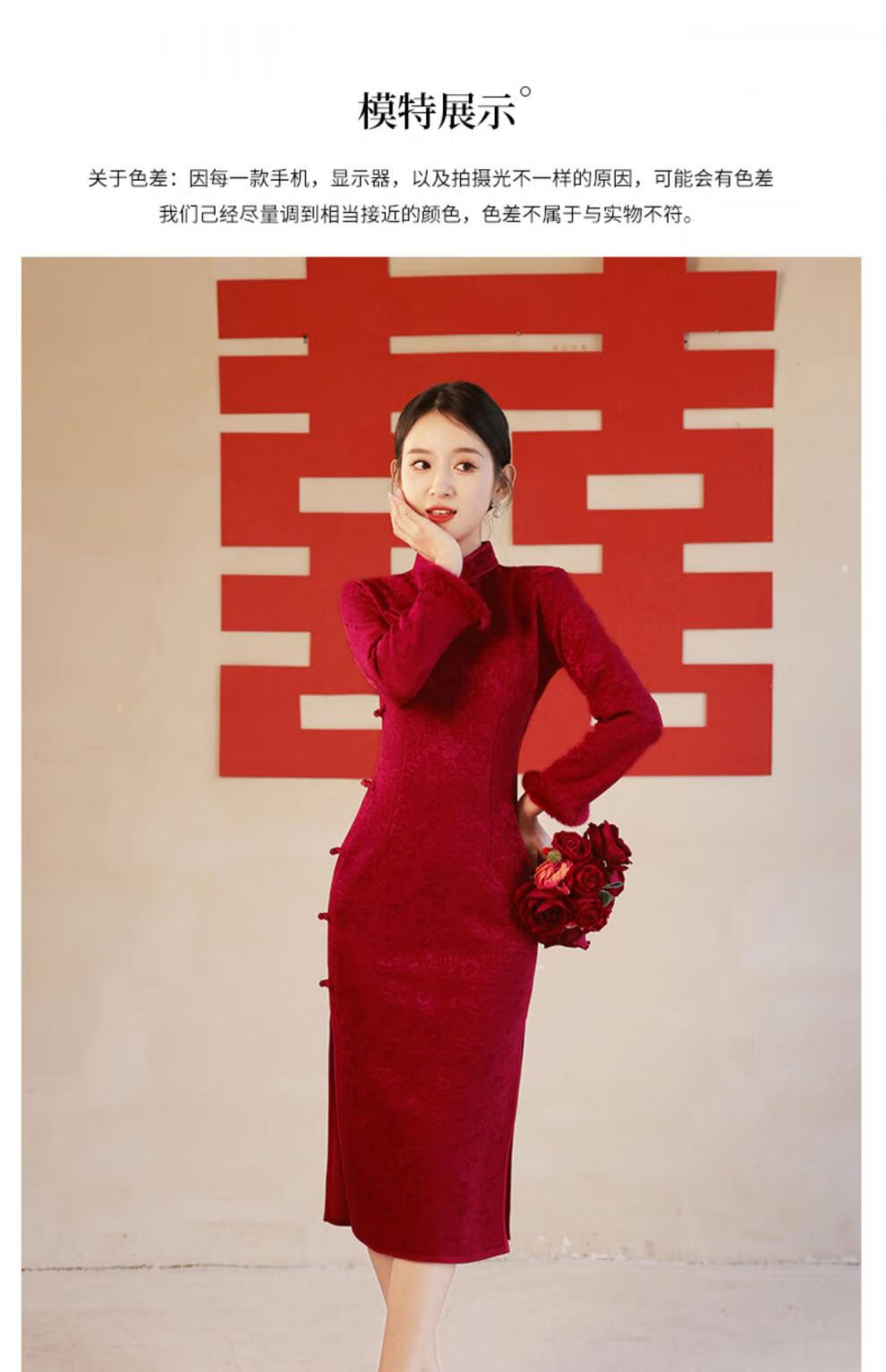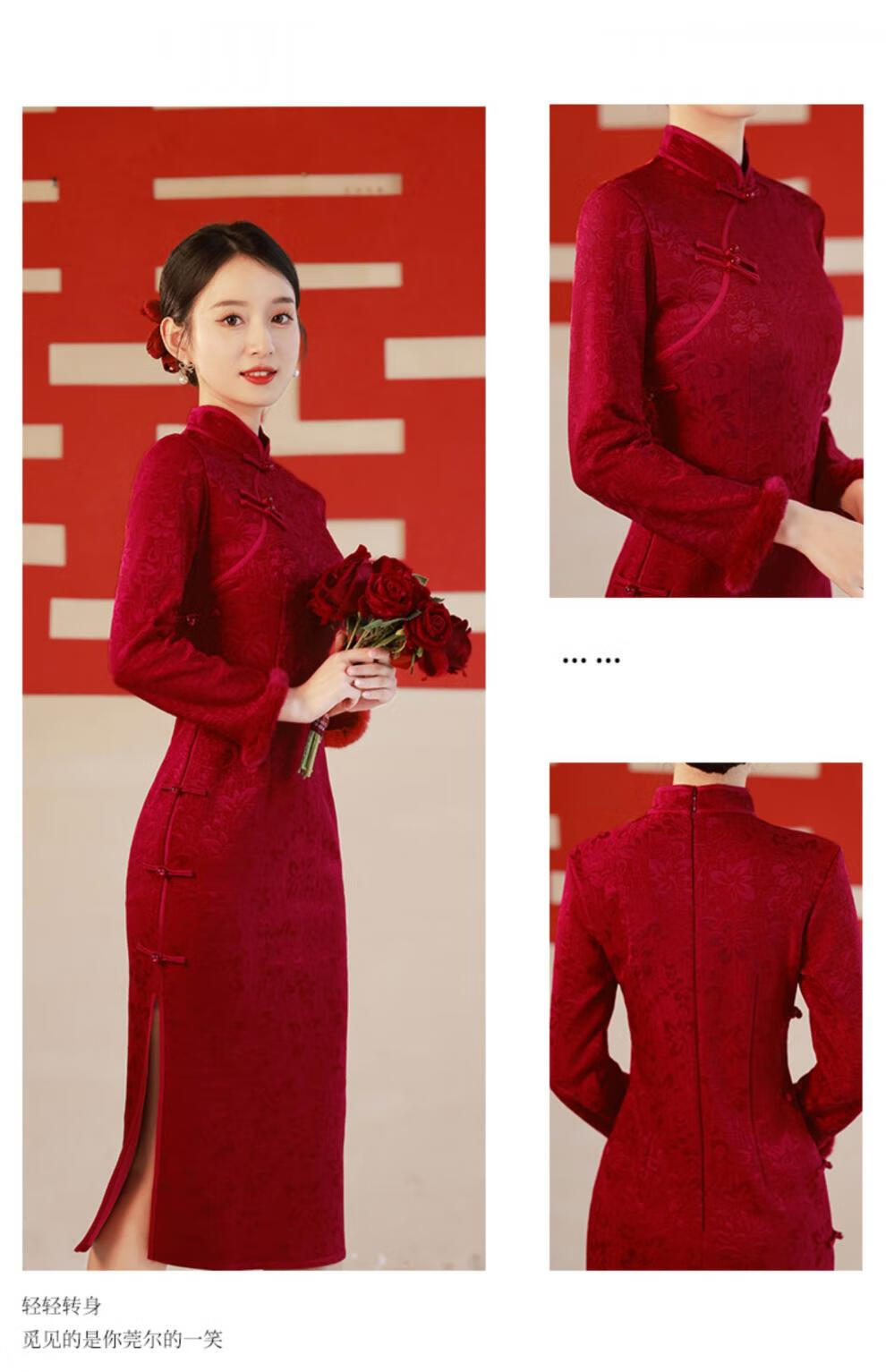 Pierre Cardin red dress skirt winter plus velvet autumn and winter cheongsam bride wedding casual toast dress winter 2025 new engagement burgundy main picture plus velvet XL