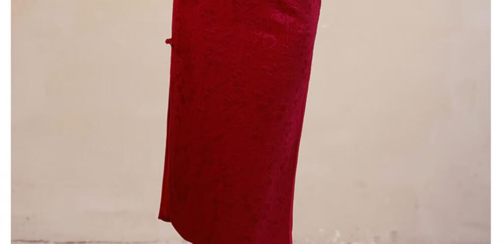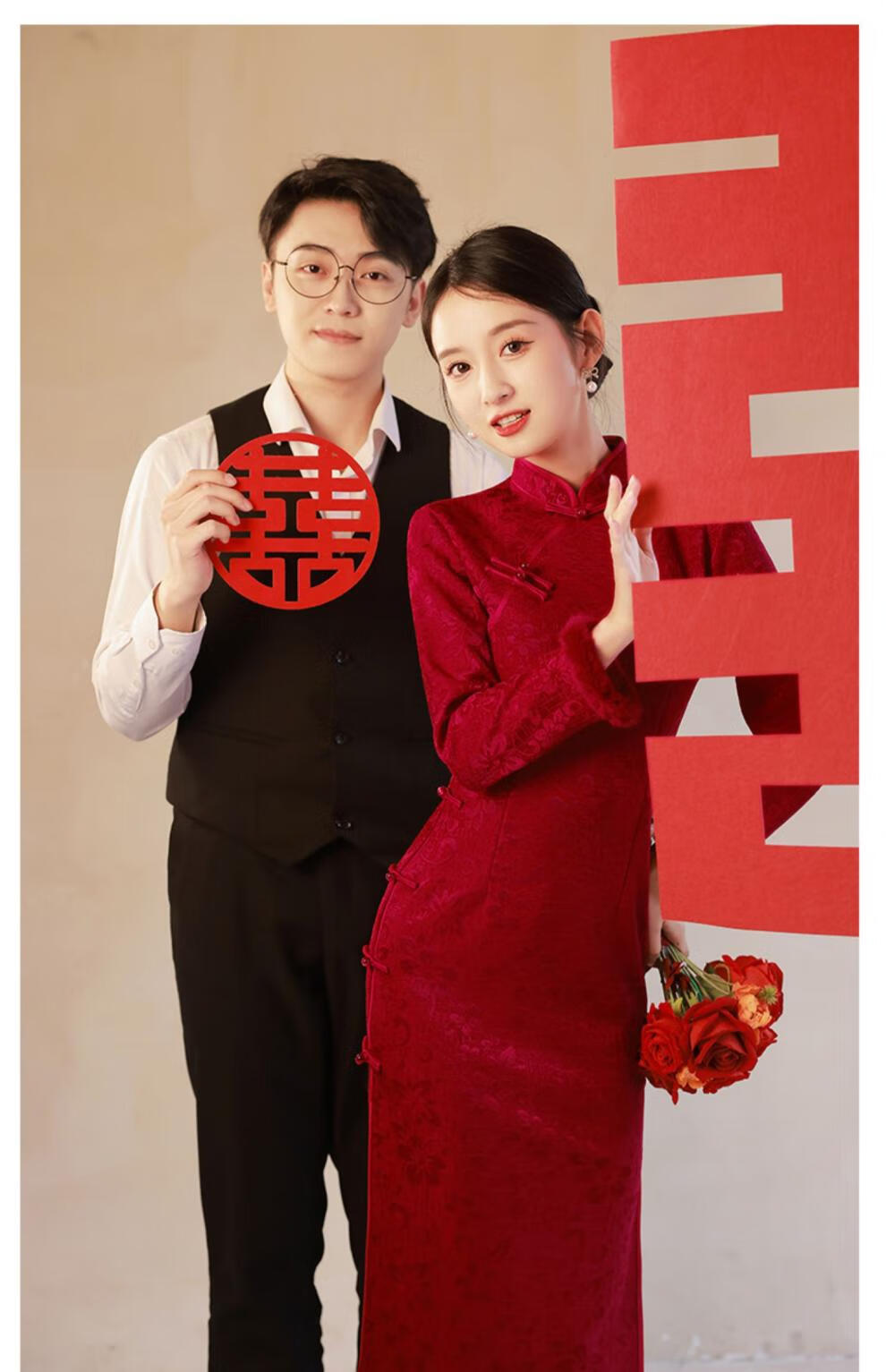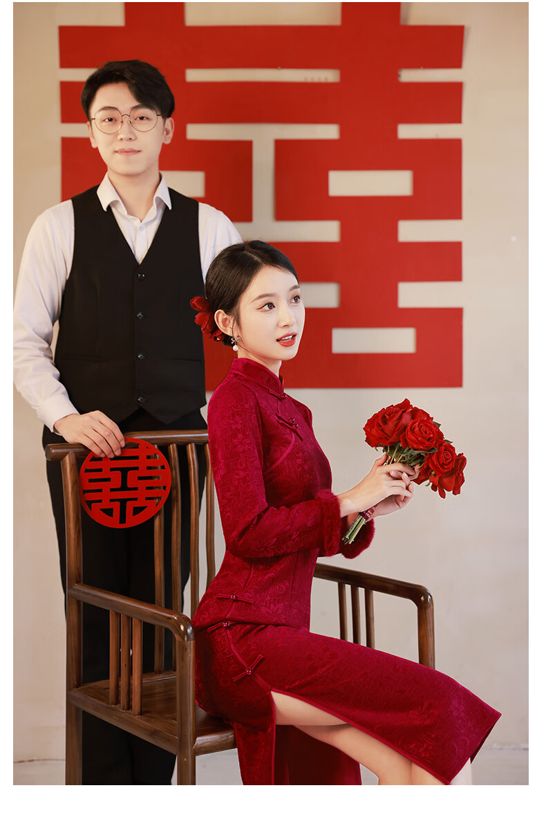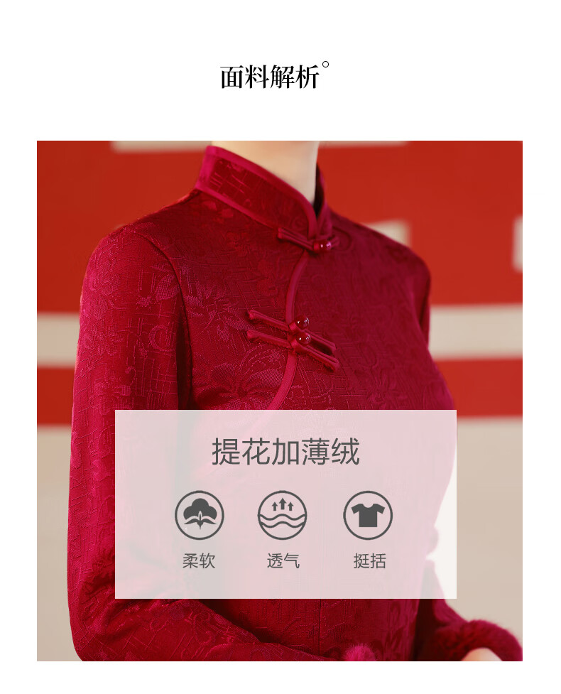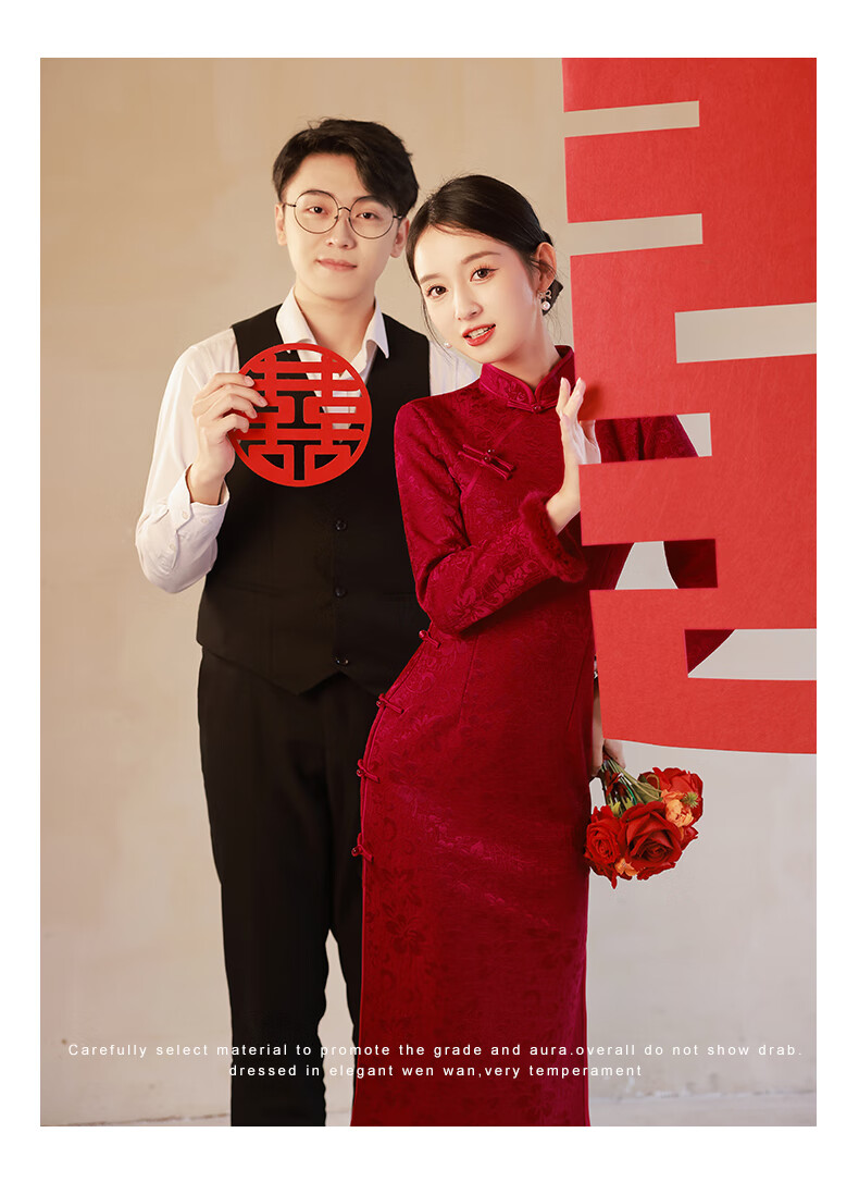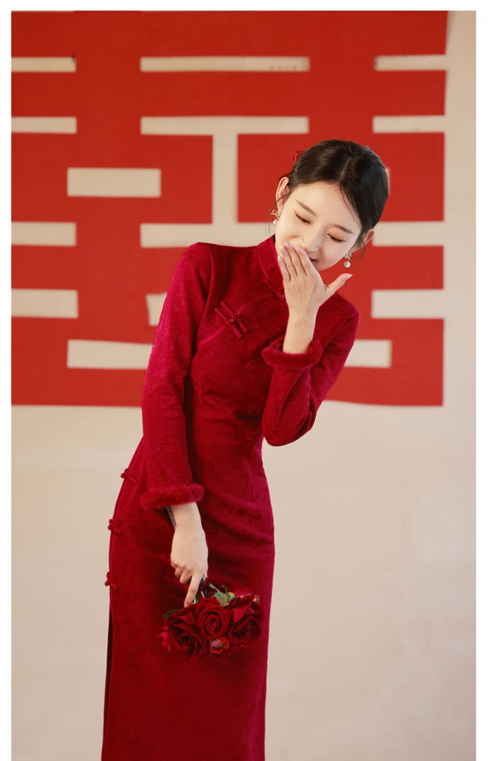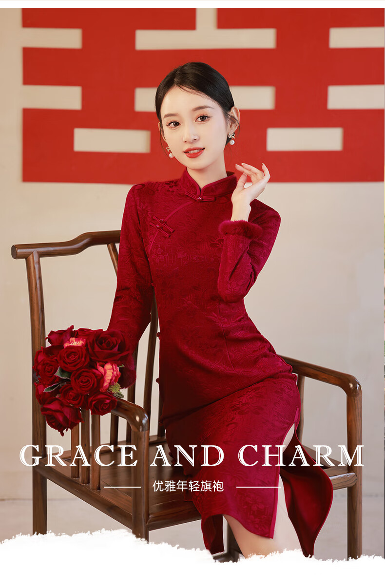 Pierre Cardin red dress skirt winter plus velvet autumn and winter cheongsam bride wedding casual toast dress winter 2025 new engagement burgundy main picture plus velvet XL