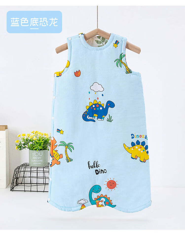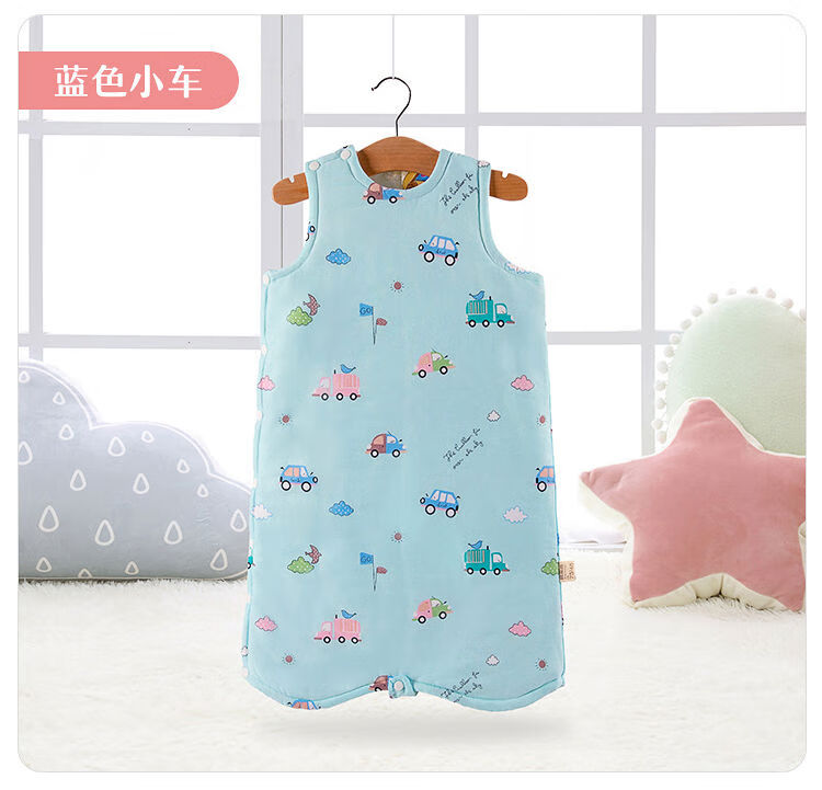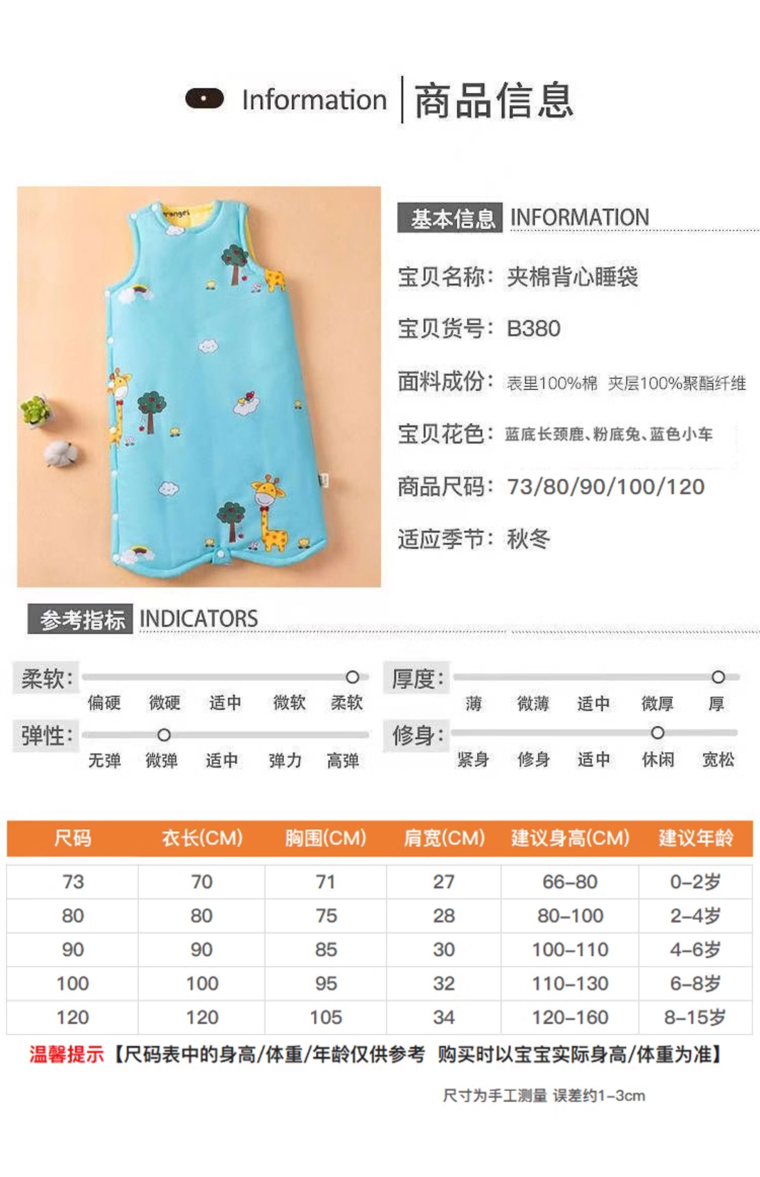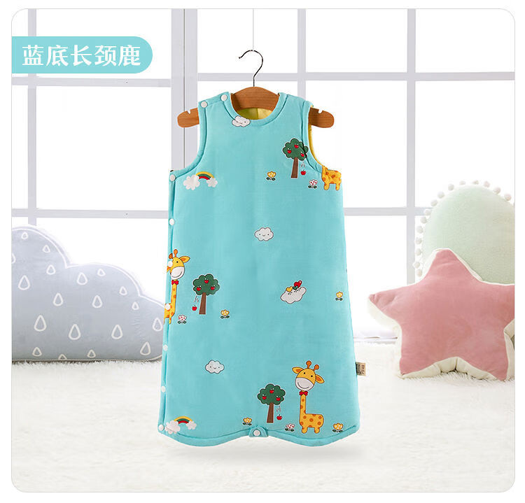 Padded vest style children's sleeping bag baby autumn and winter pajamas thickened nightgown warm baby anti-kicking quilt artifact blue background giraffe front and back cotton 90 yards - 4-6 years old clothing length 90cm