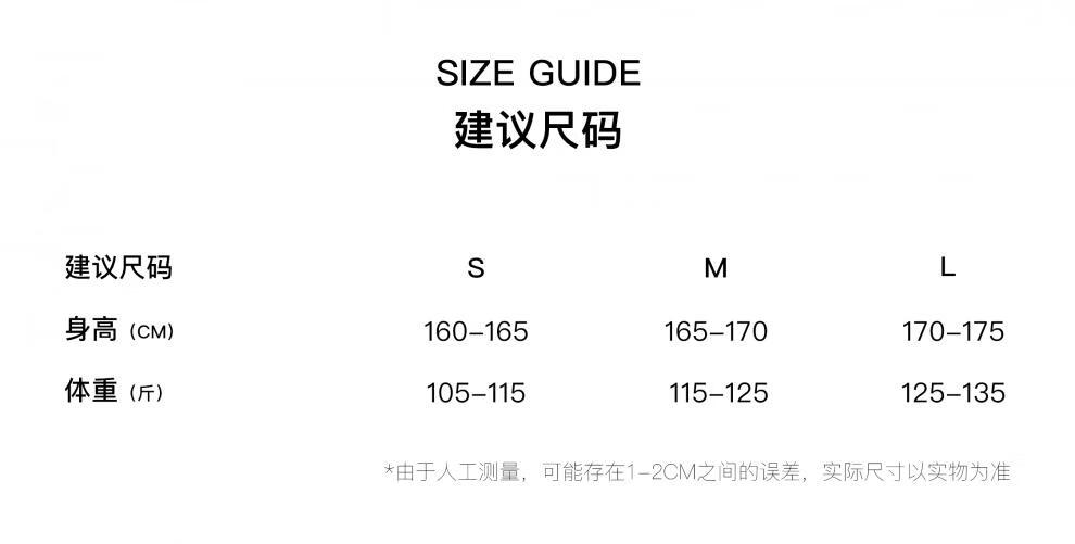 China (cm) 160-165/84-86 165-170 / 88-90 167-172 / 92-96 168-173 / 98-102 170-176 / 106-110