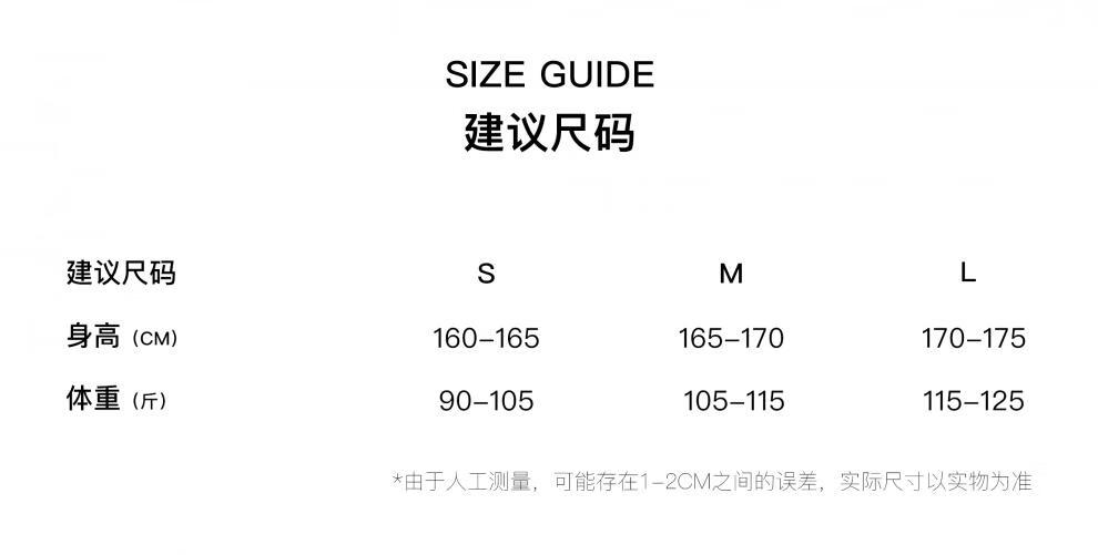 China (cm) 165 / 88-90 170 / 96-98 175 / 108-110 180 / 118-122 185 / 126-130