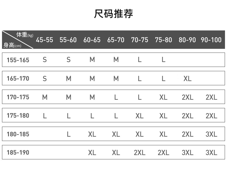 China (cm) 165 / 88-90 170 / 96-98 175 / 108-110 180 / 118-122 185 / 126-130
