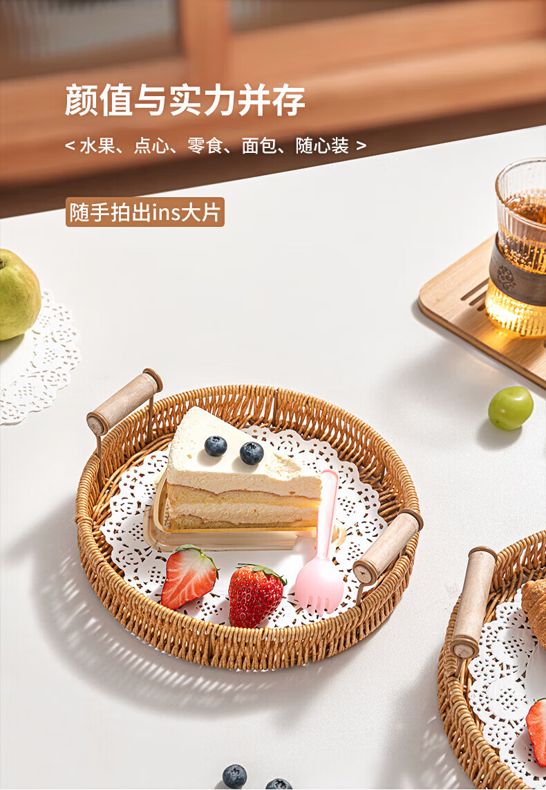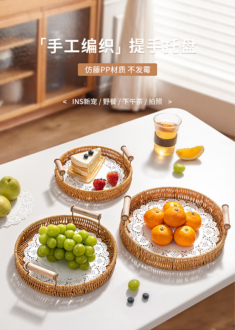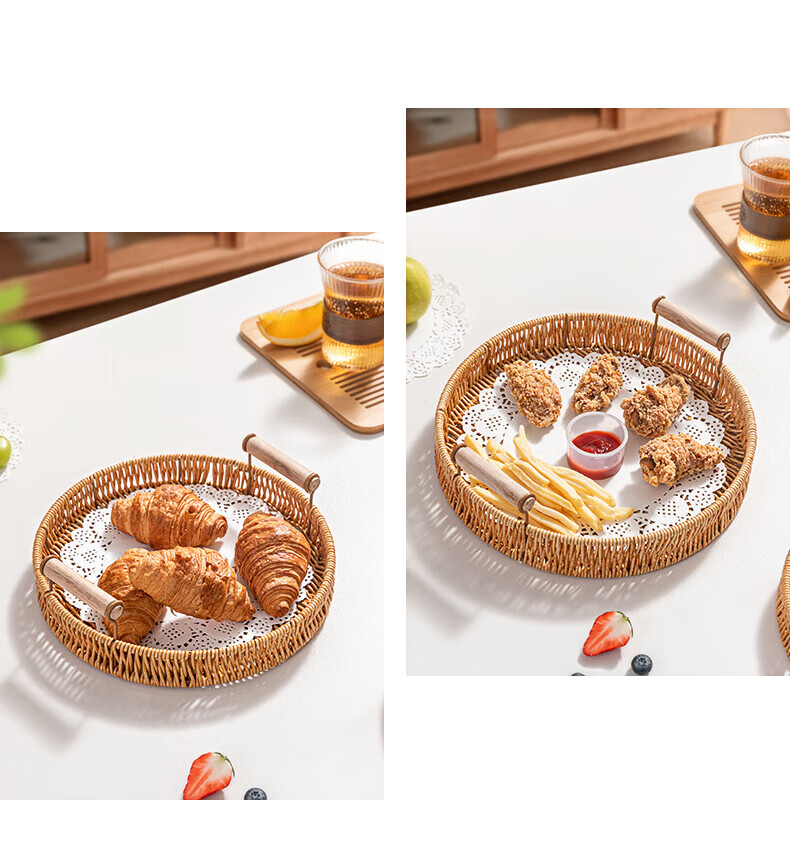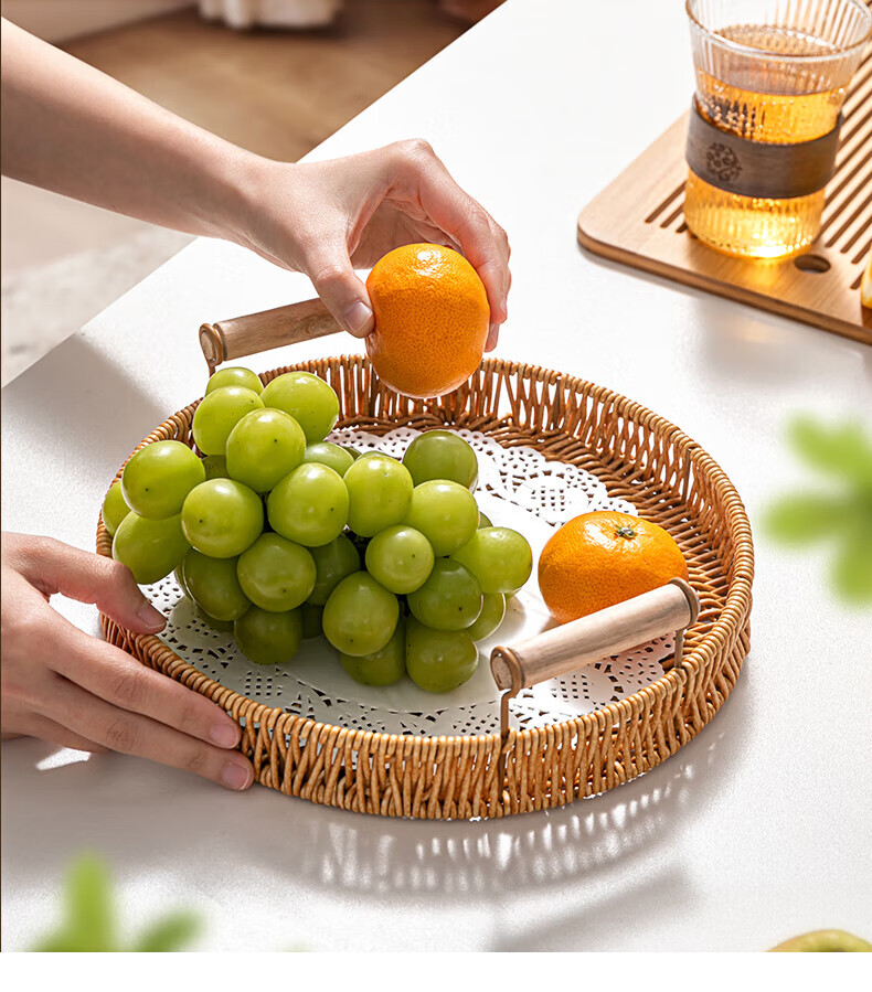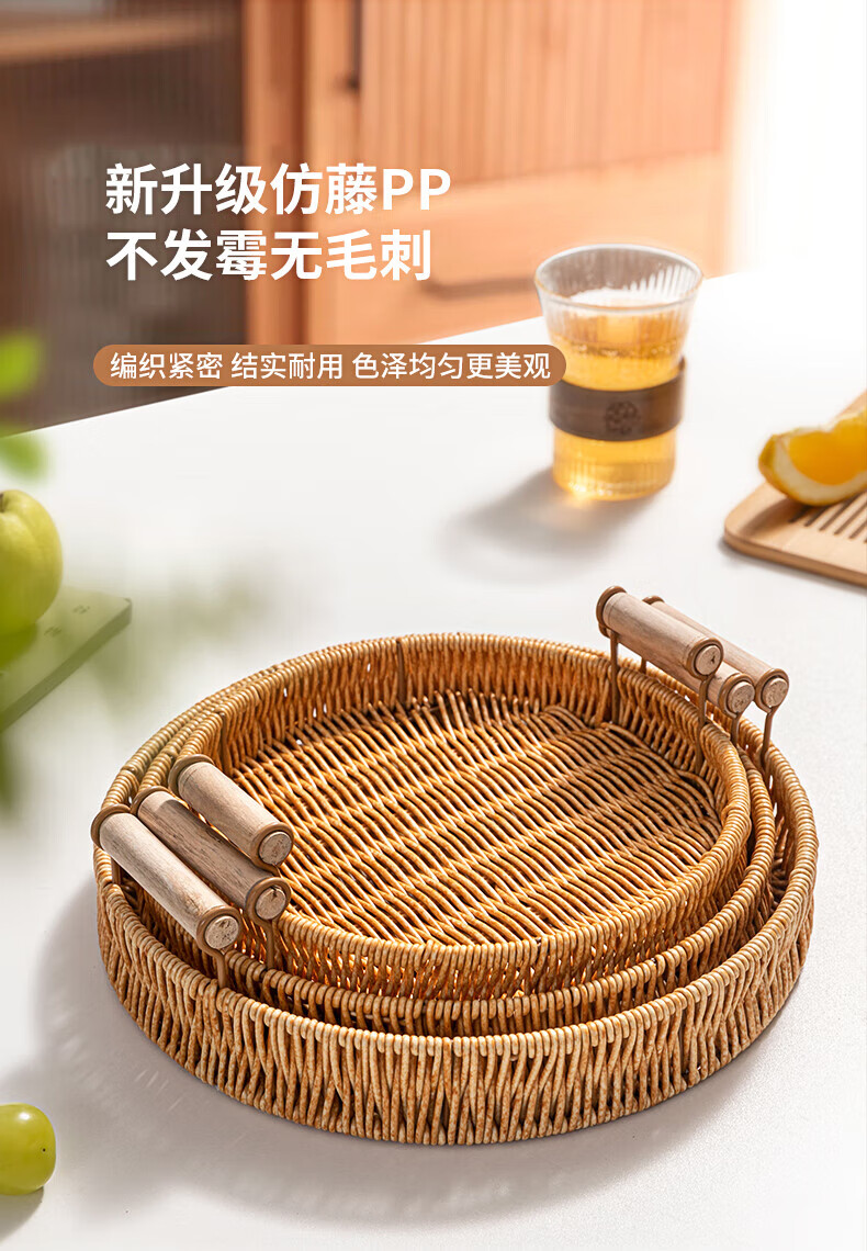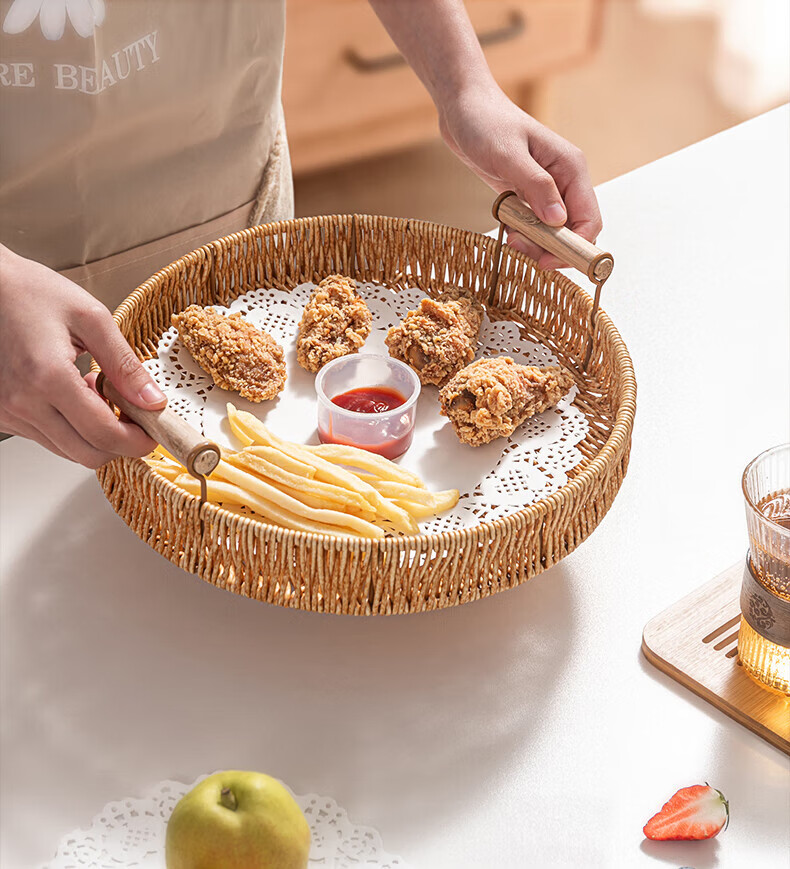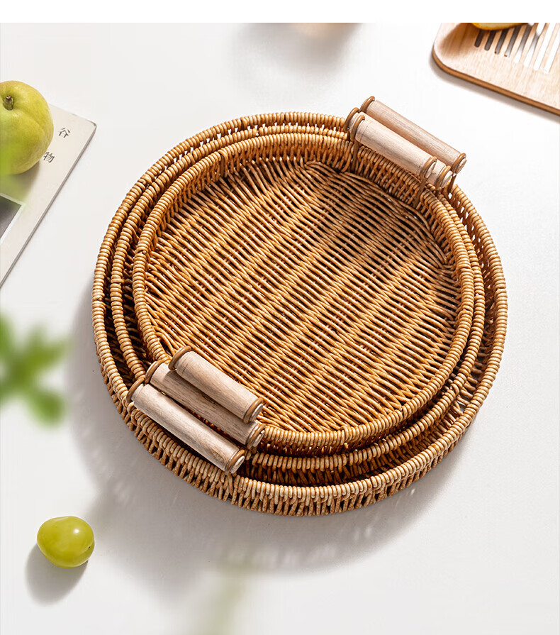 Jingxianju Bamboo Basket Bamboo Basket Bamboo Basket Fruit Plate Tray Steamed Bun Basket Small Desktop Snack Storage Box Vegetable Handmade Double-Ear Imitation Rattan Fruit Plate Medium Size