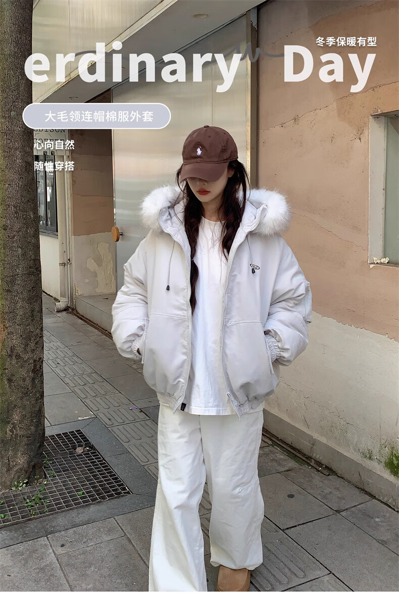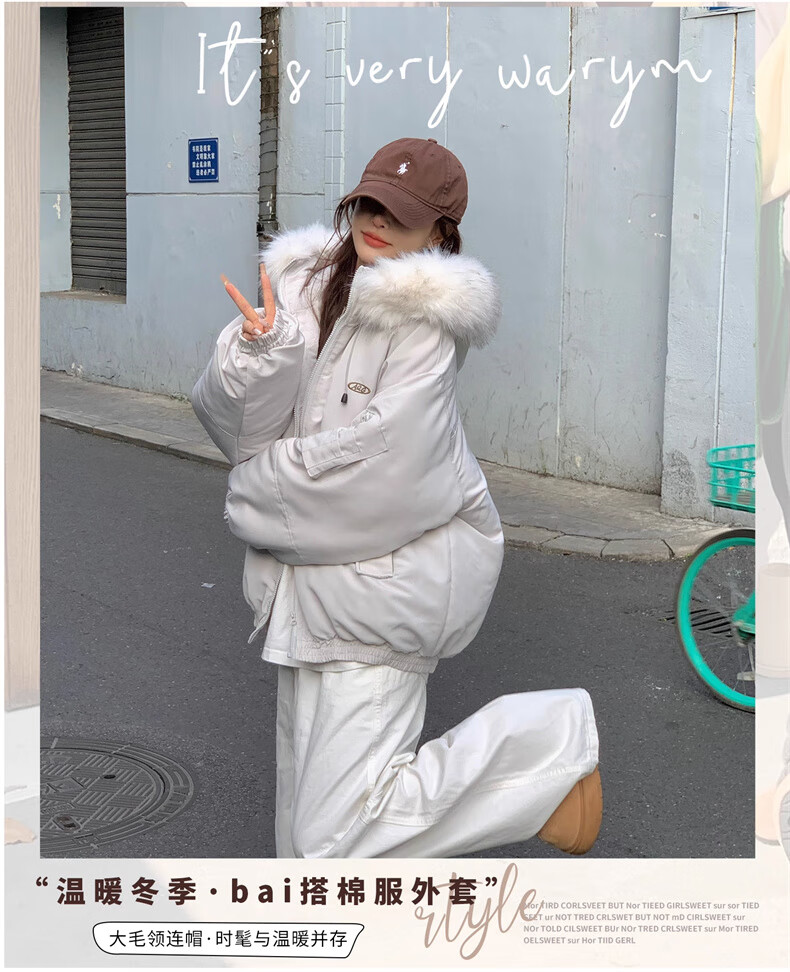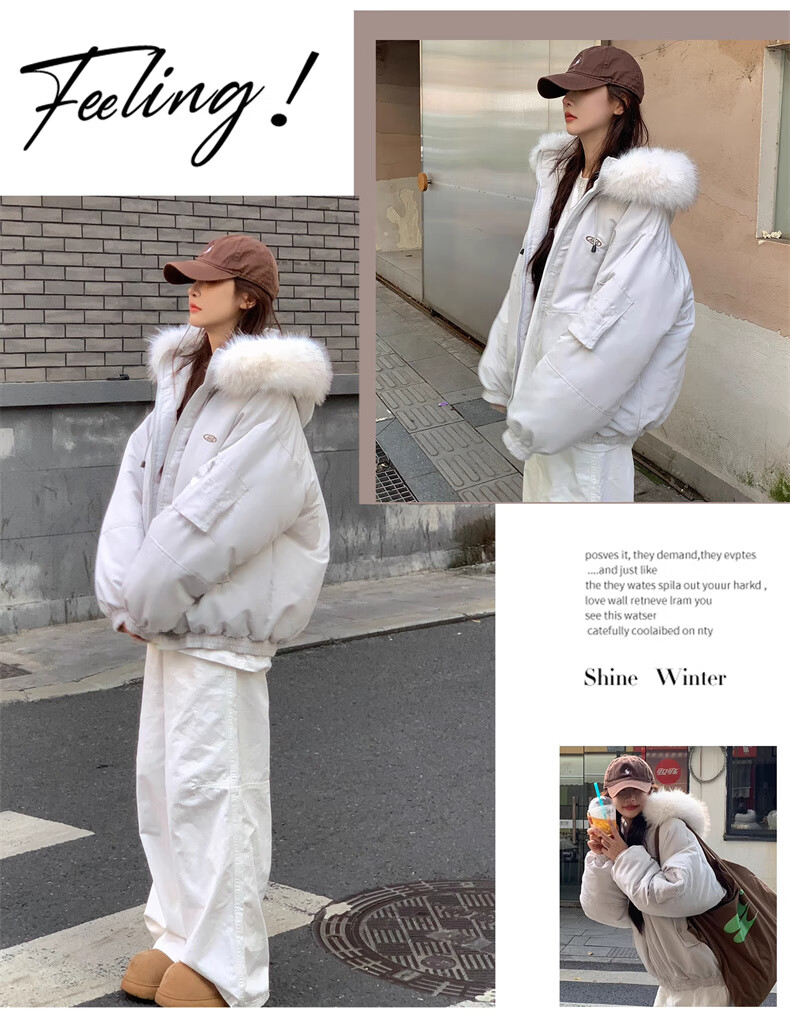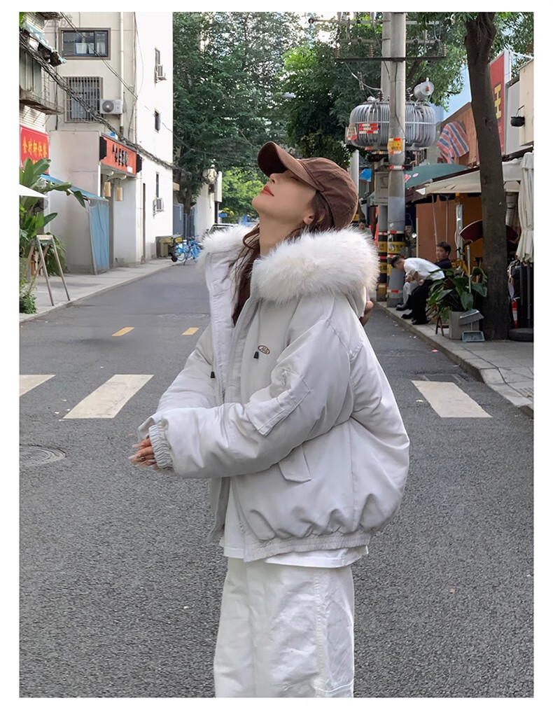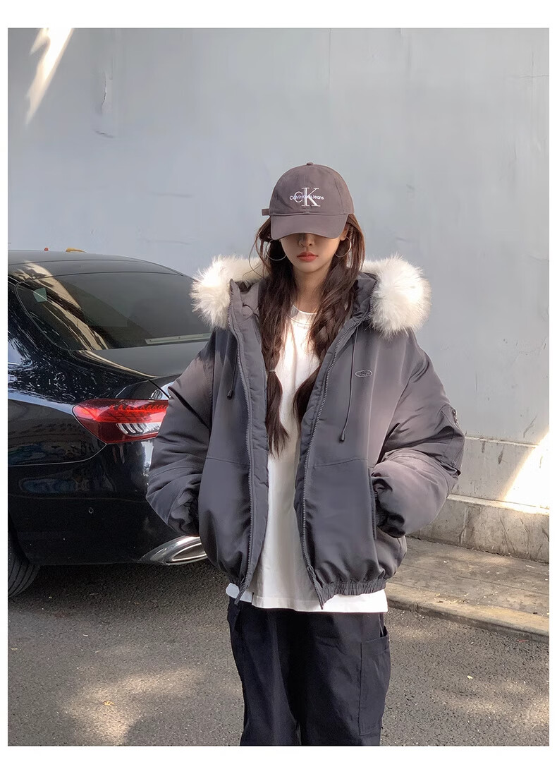 Cotton large fur collar parka cotton jacket for women in autumn and winter new style small cotton jacket loose down jacket down jacket cotton jacket Feng 516 white gray high quality M 105-120Jin Jin equals 0.5 kg