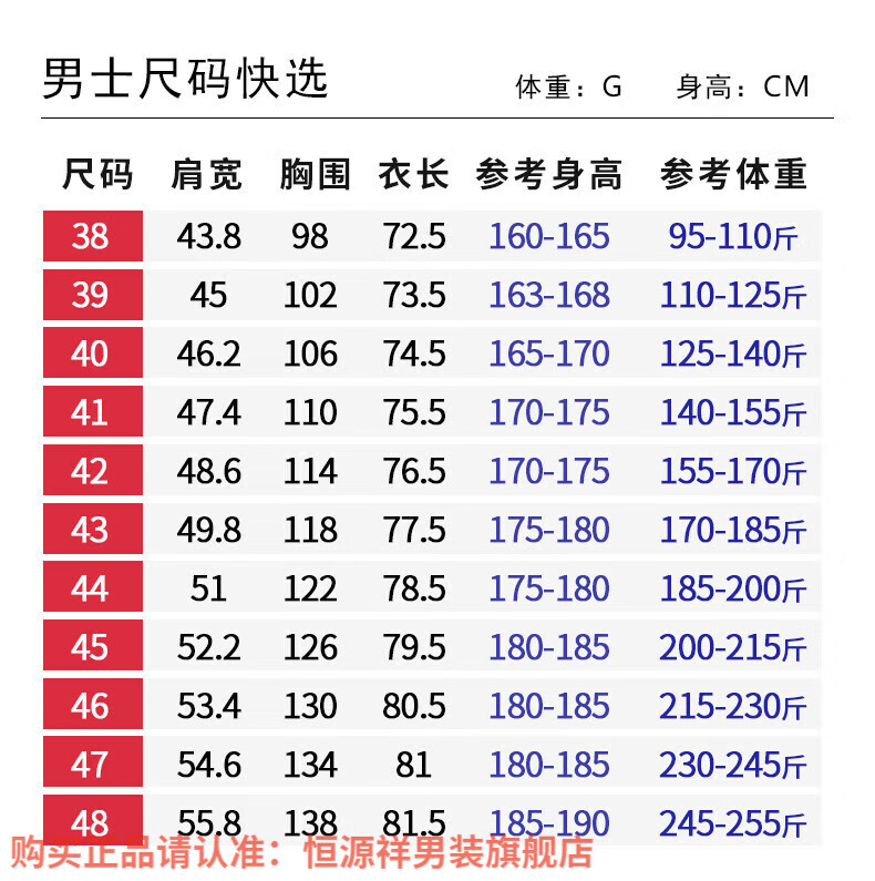 China (cm) 165 / 88-90 170 / 96-98 175 / 108-110 180 / 118-122 185 / 126-130