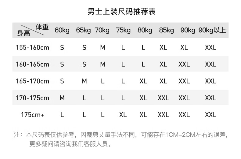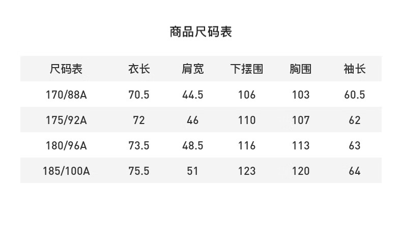 China (cm) 165 / 88-90 170 / 96-98 175 / 108-110 180 / 118-122 185 / 126-130