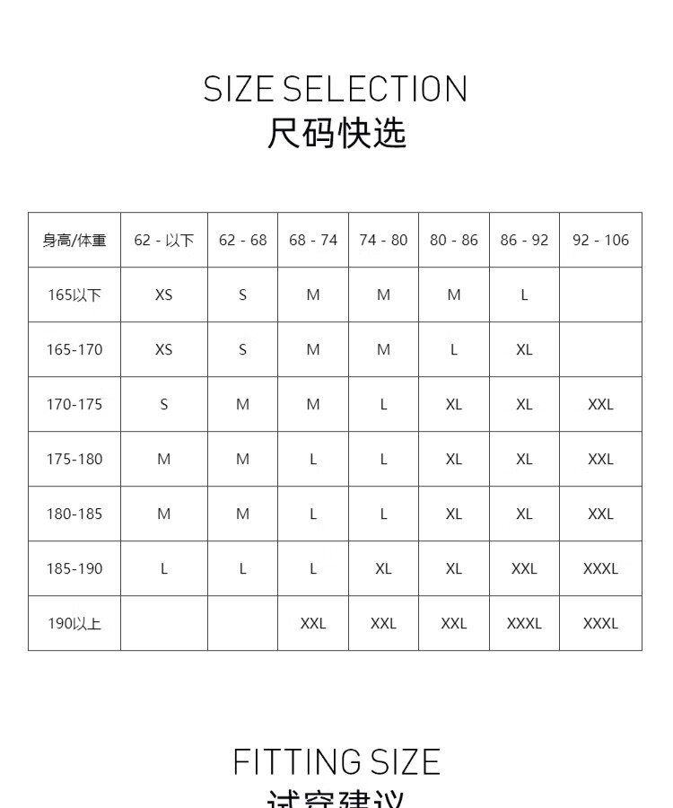 China (cm) 160-165/84-86 165-170 / 88-90 167-172 / 92-96 168-173 / 98-102 170-176 / 106-110