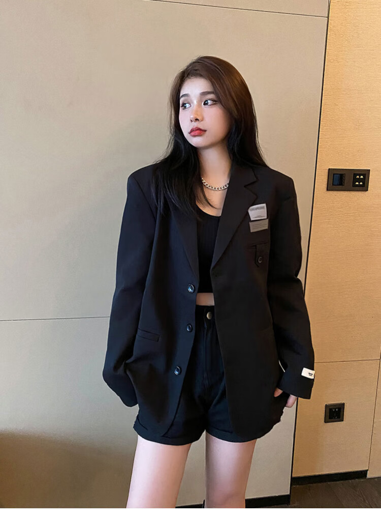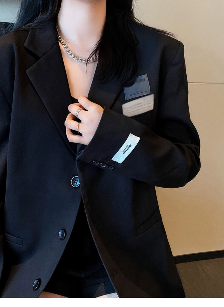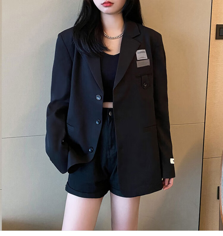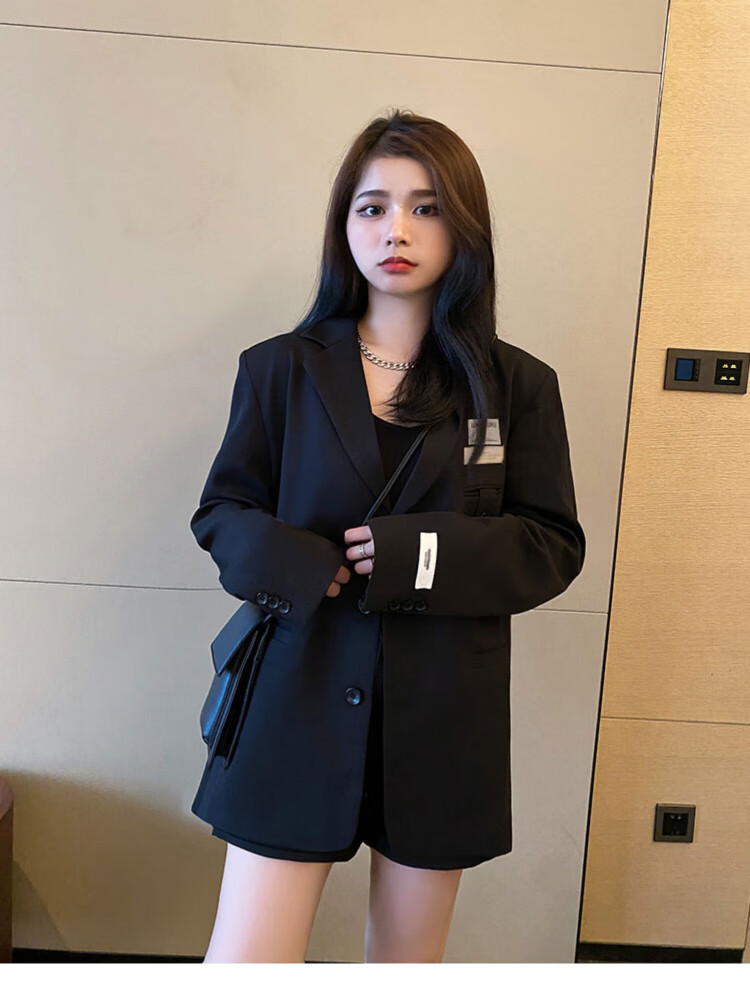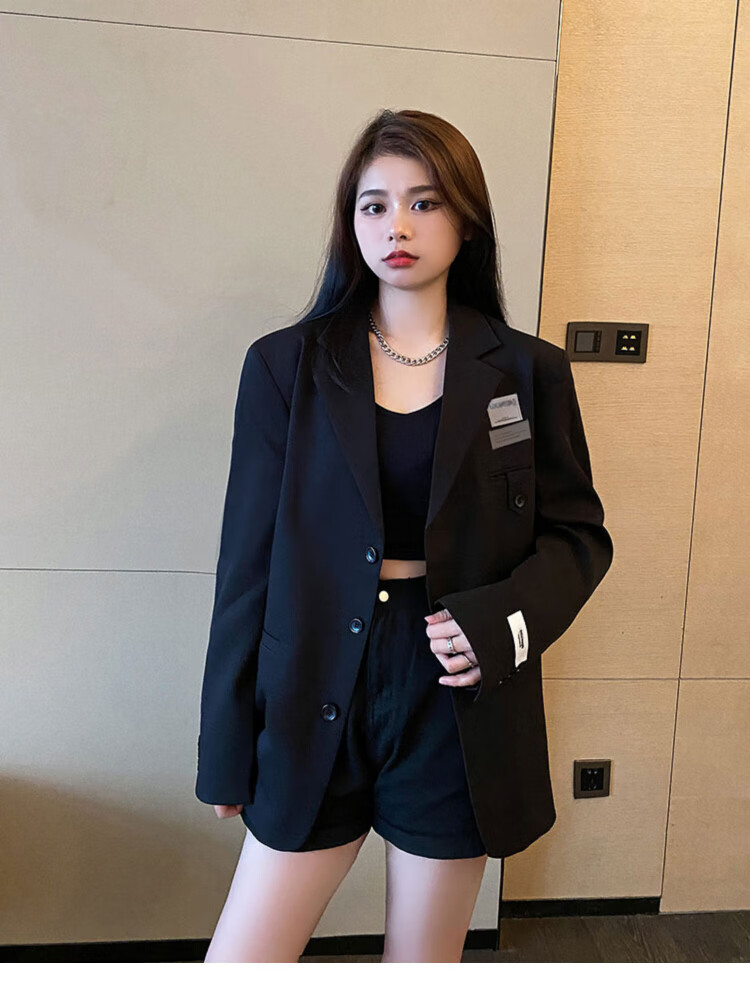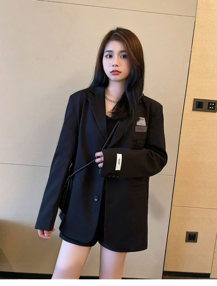 He Jiagong black suit jacket for women 2025 autumn small high-end casual loose Korean style interview suit top black L recommended 105-120 Jin Jin equals 0.5 kg