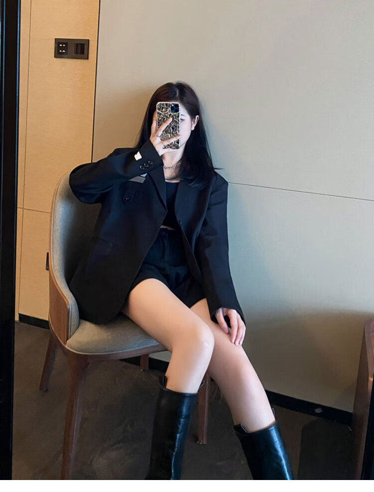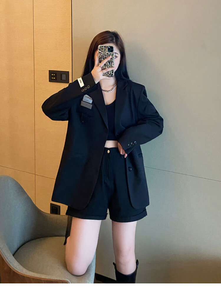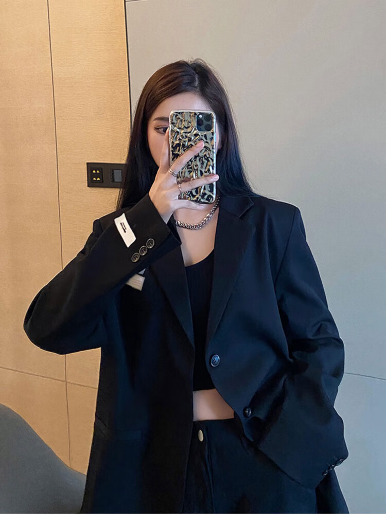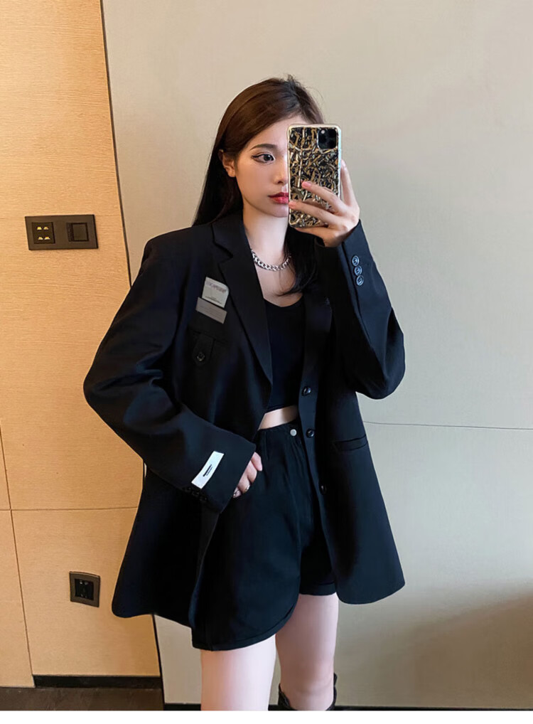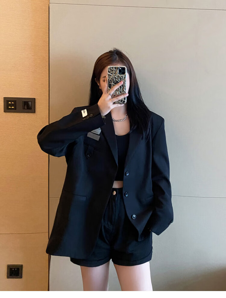 He Jiagong black suit jacket for women 2025 autumn small high-end casual loose Korean style interview suit top black L recommended 105-120 Jin Jin equals 0.5 kg