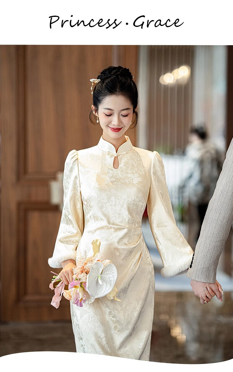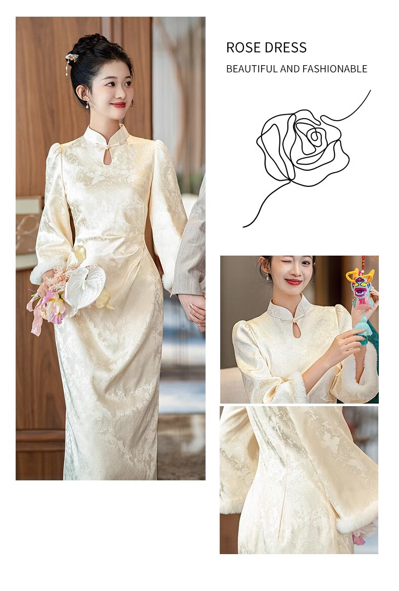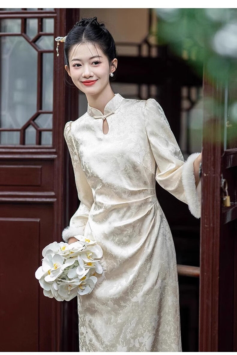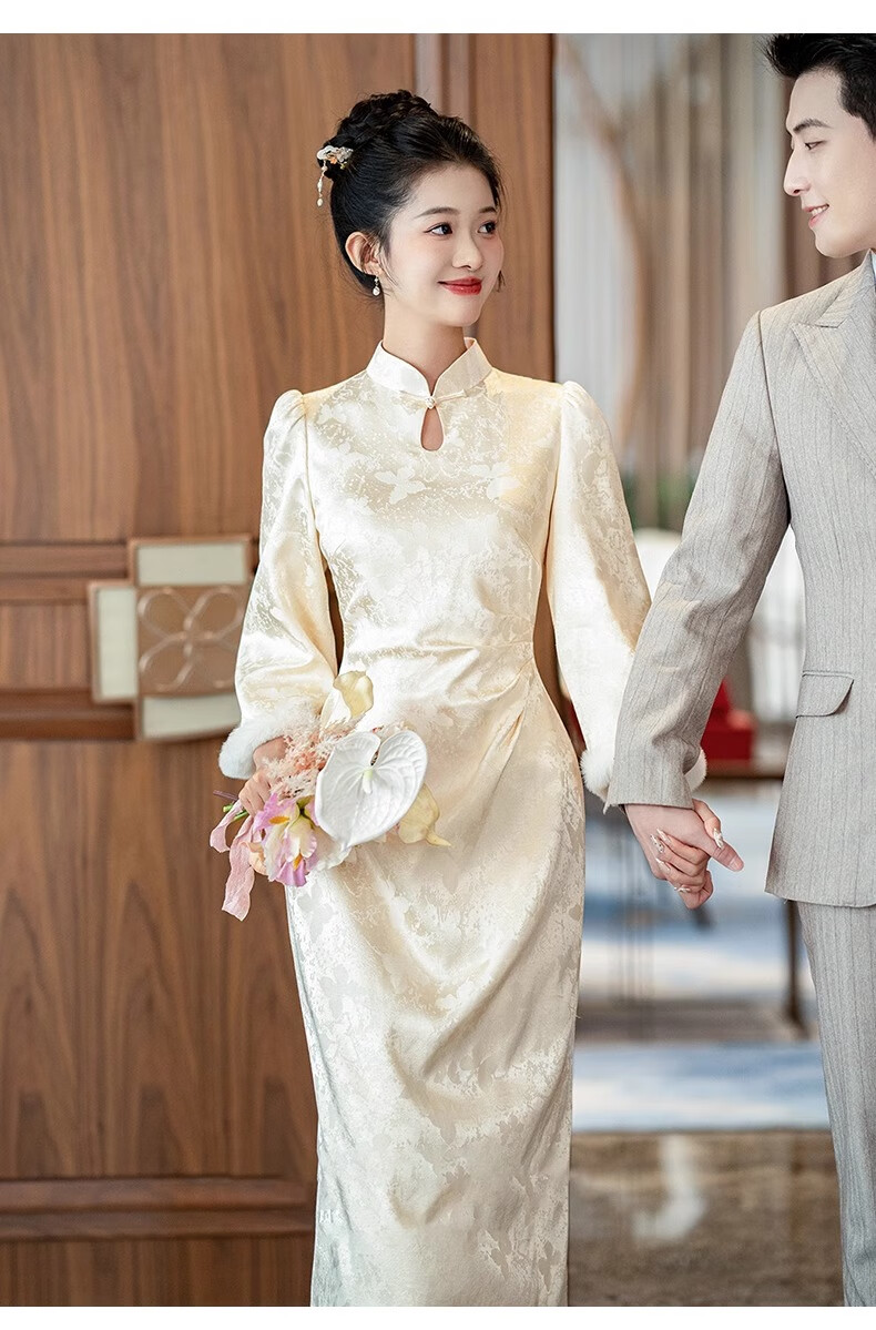 Jialong Mingxiu Plus Velvet Thickened New Chinese Style Cheongsam Autumn and Winter Bridal Dress Tang Suit Beige Velvet XL