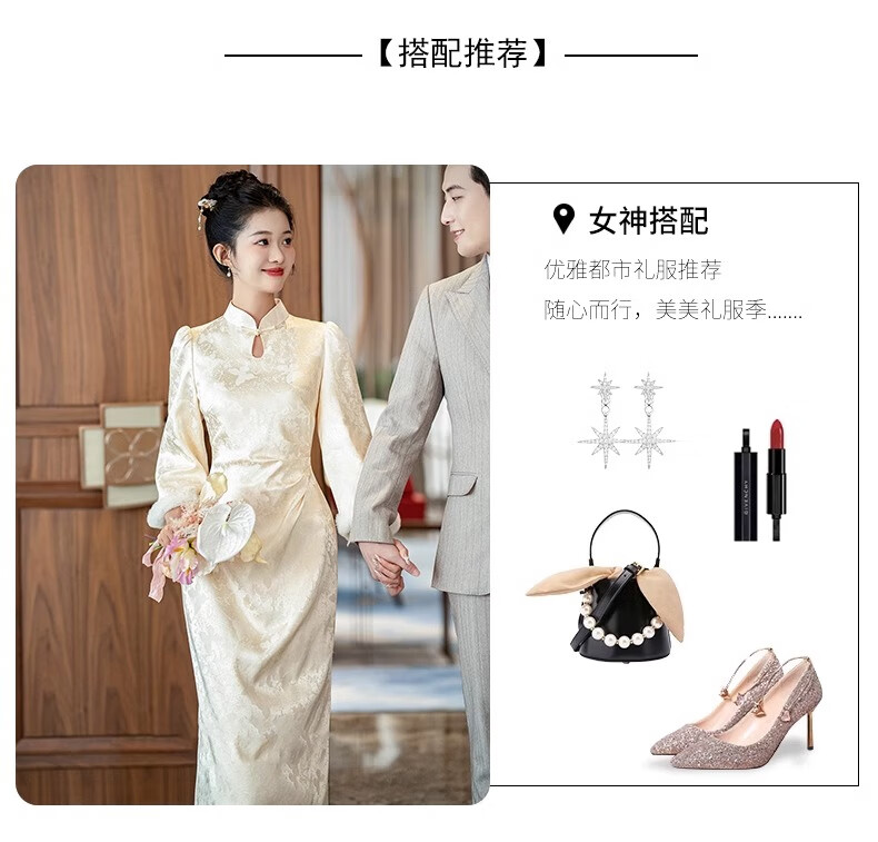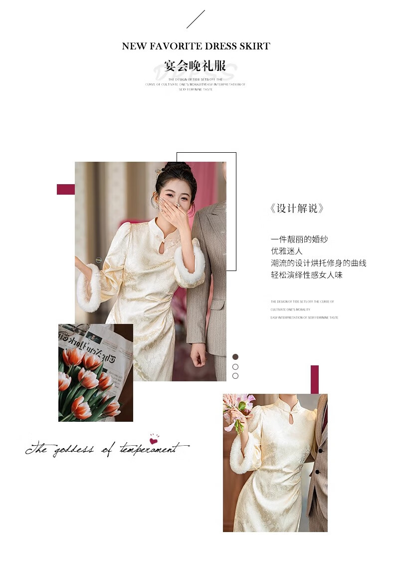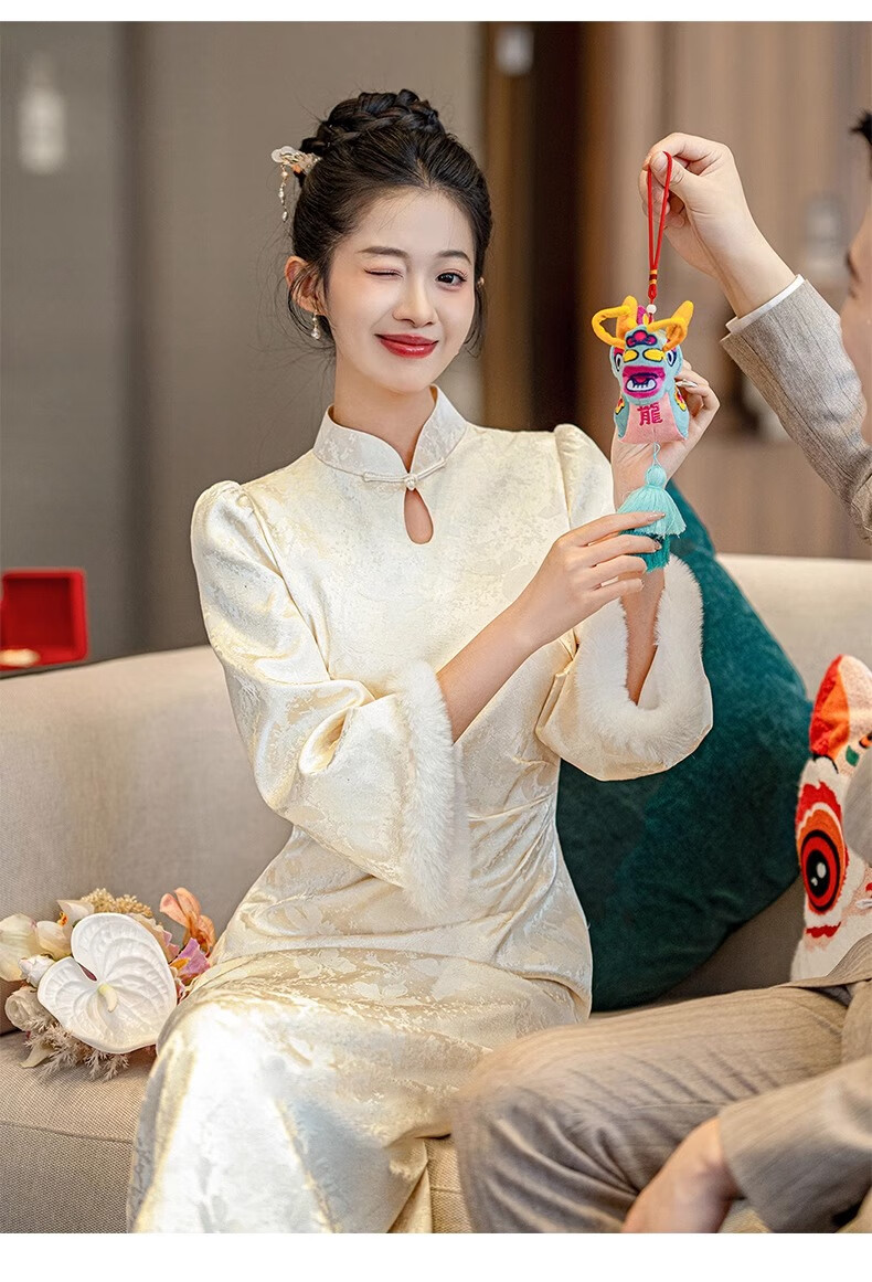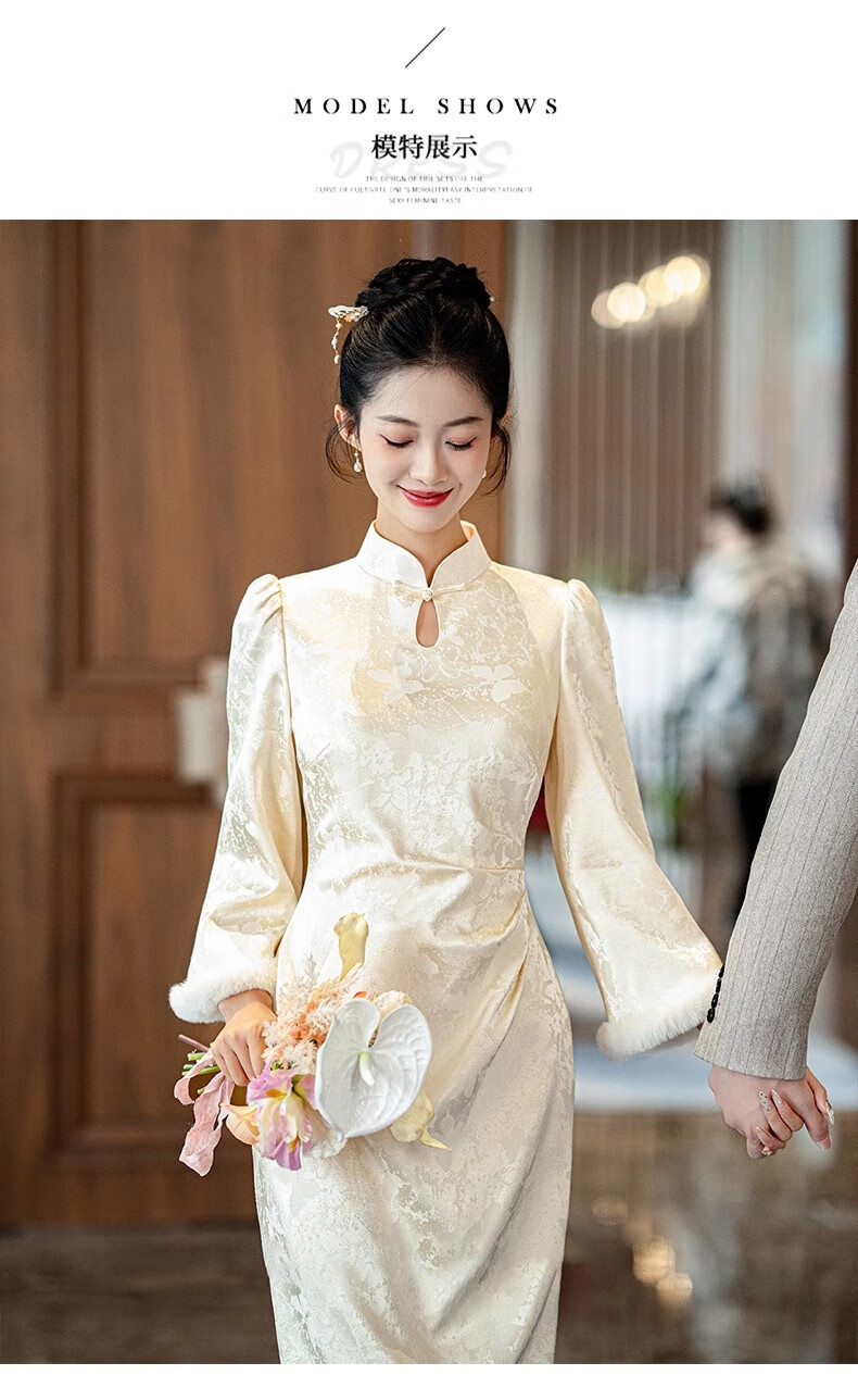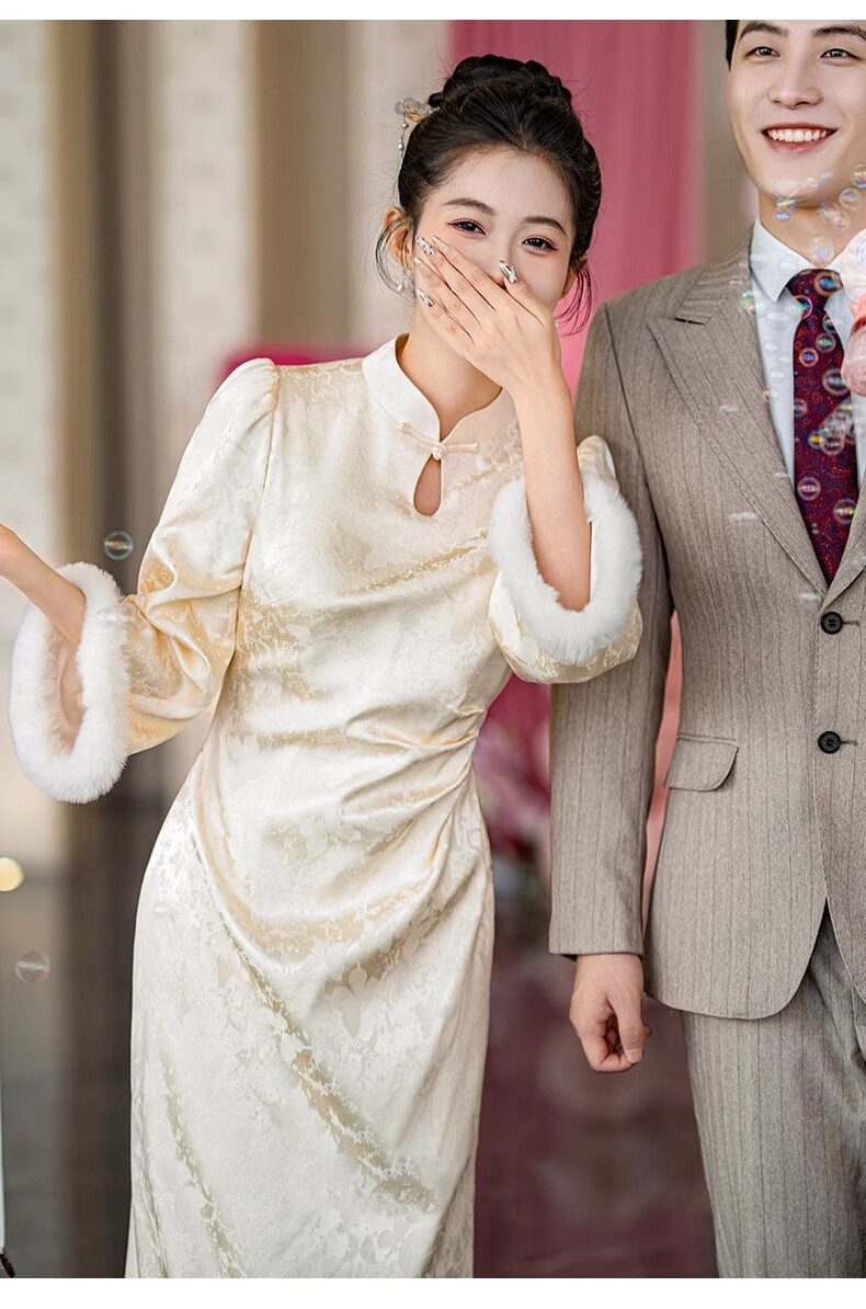 Jialong Mingxiu Plus Velvet Thickened New Chinese Style Cheongsam Autumn and Winter Bridal Dress Tang Suit Beige Velvet XL