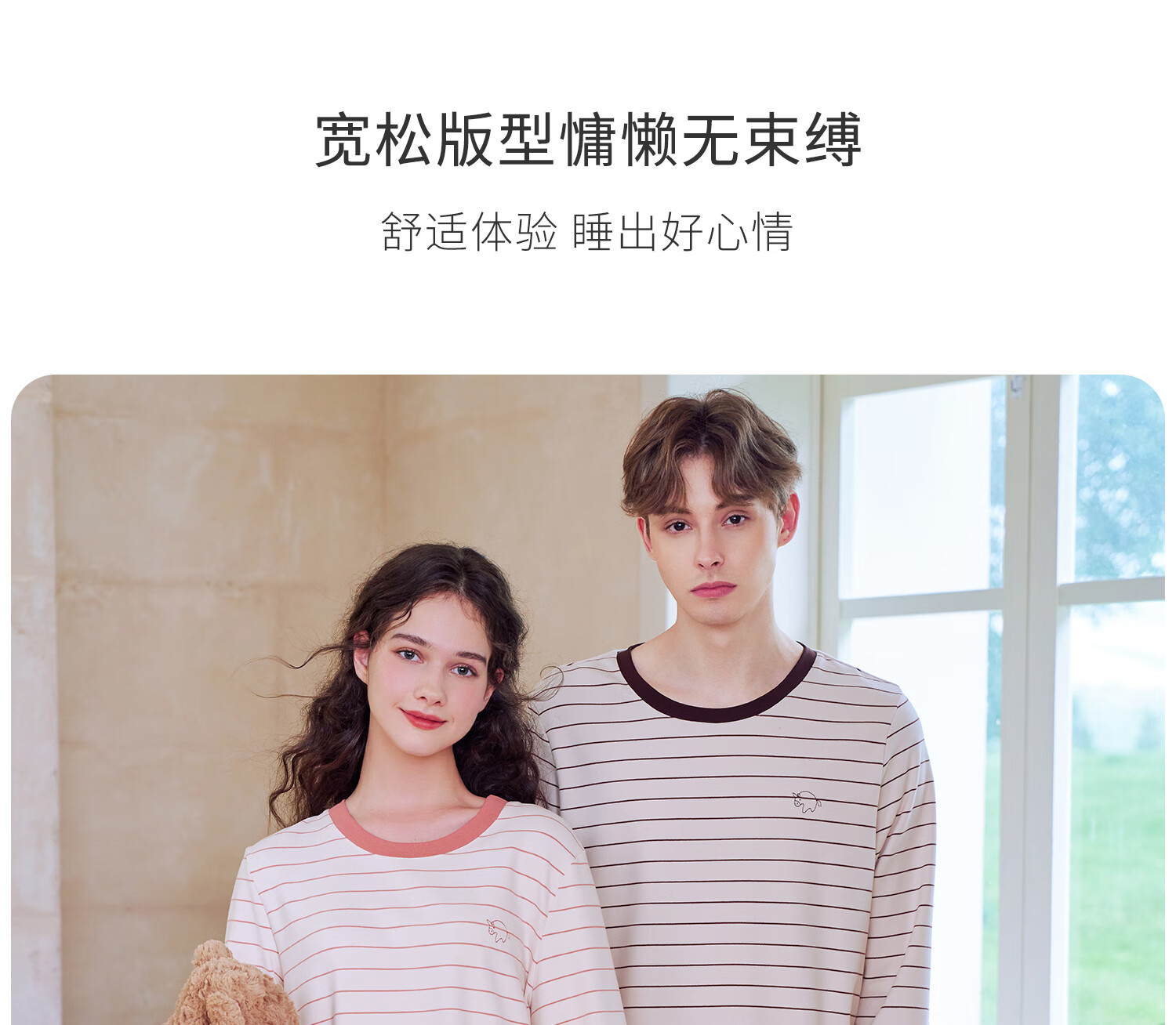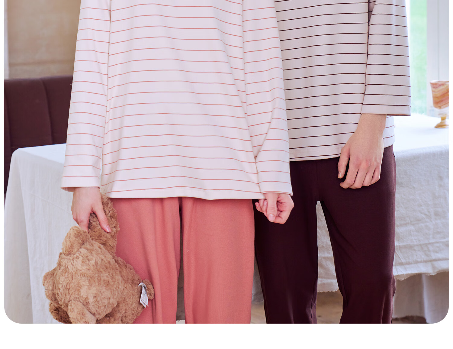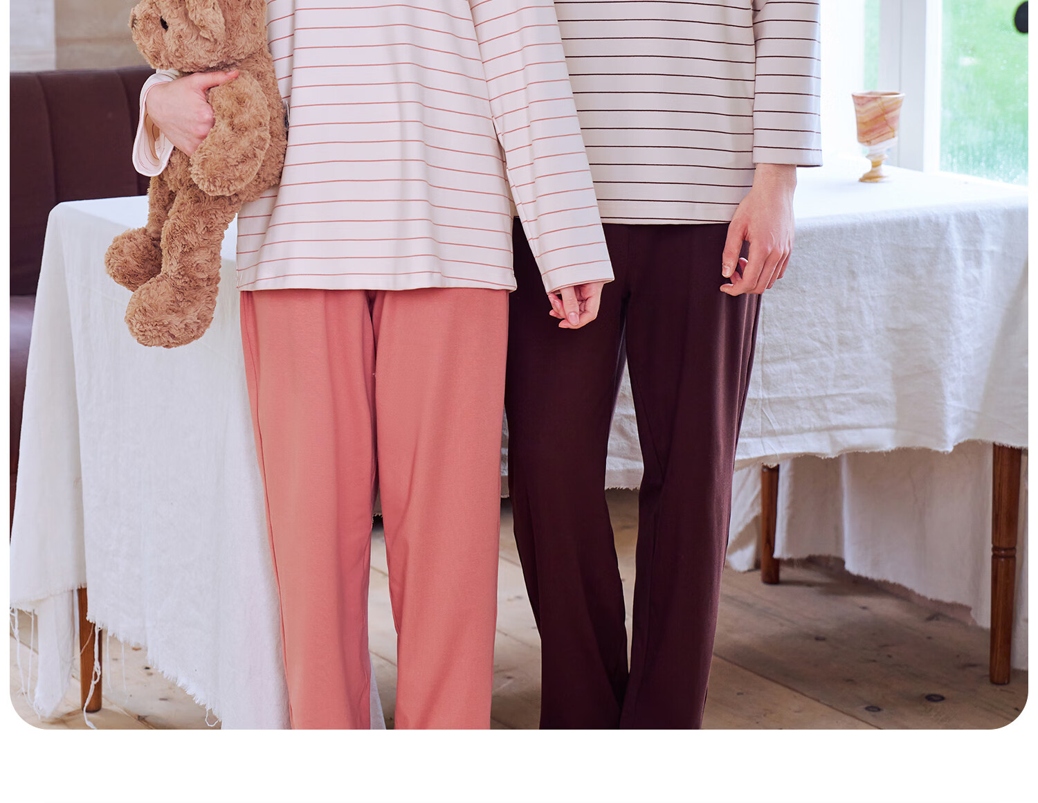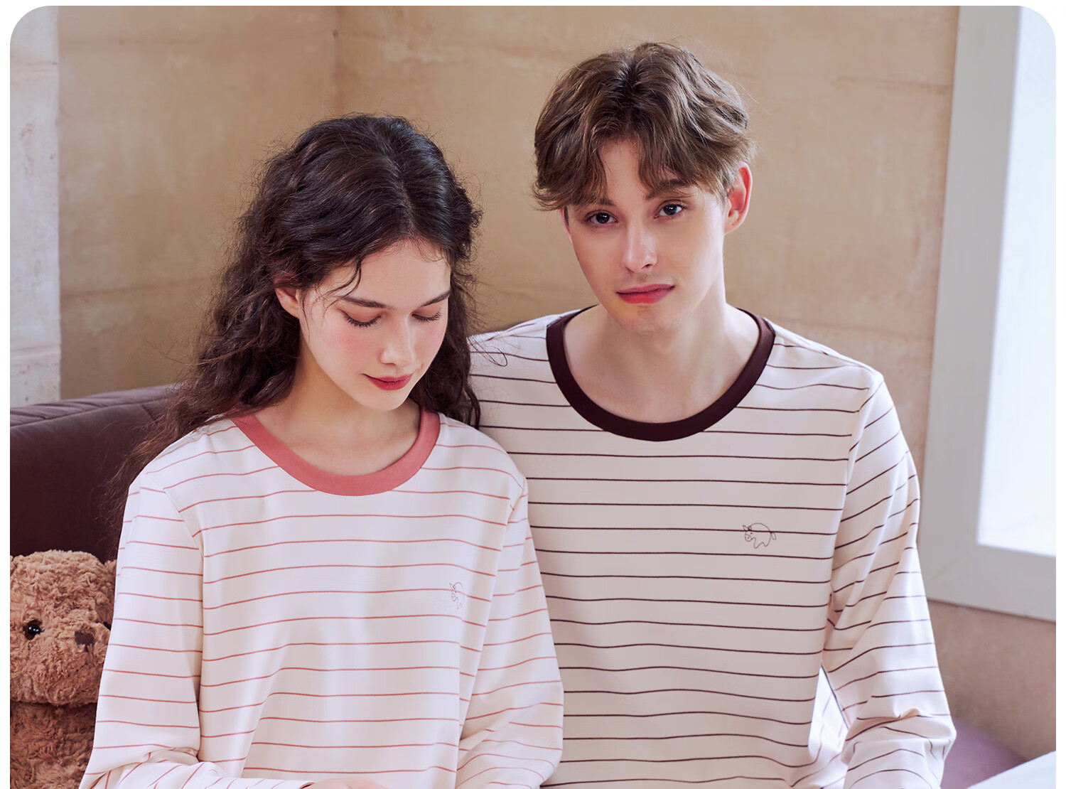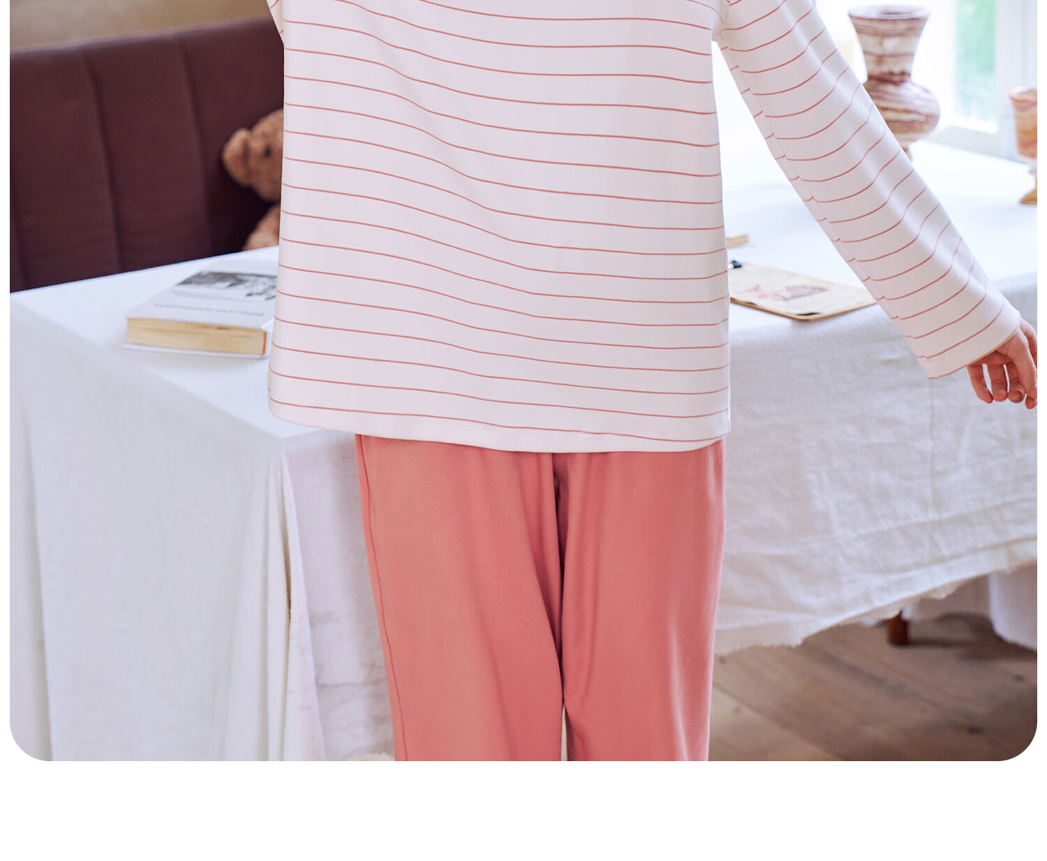 American Standard's new long-sleeved couple's soft cotton pajamas set for women in autumn and winter can be worn outside casual striped knitted cotton home clothes for men coral pink M