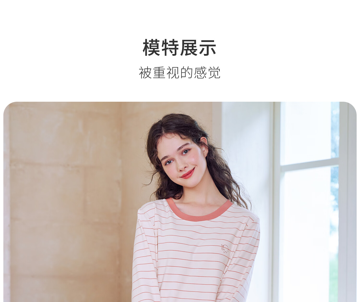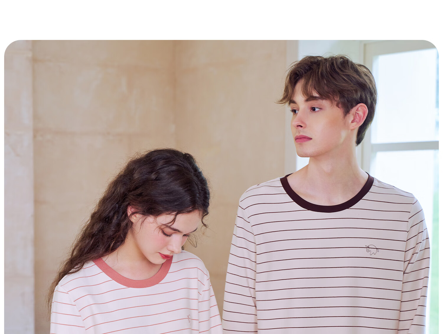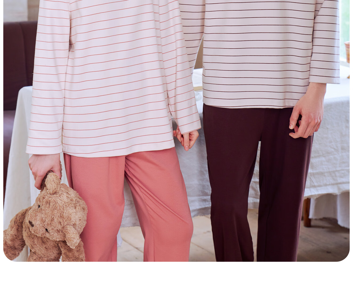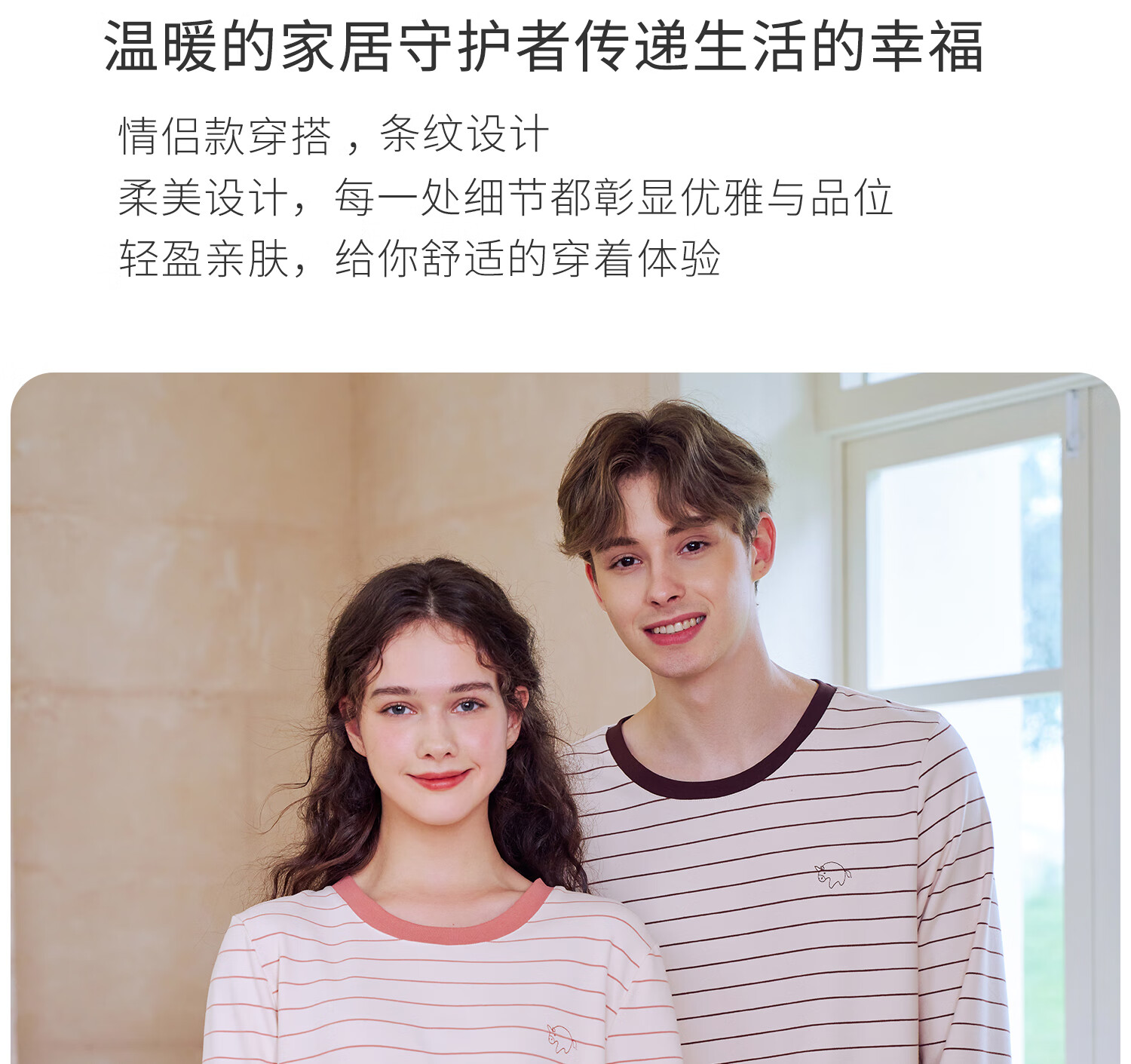 American Standard's new long-sleeved couple's soft cotton pajamas set for women in autumn and winter can be worn outside casual striped knitted cotton home clothes for men coral pink M