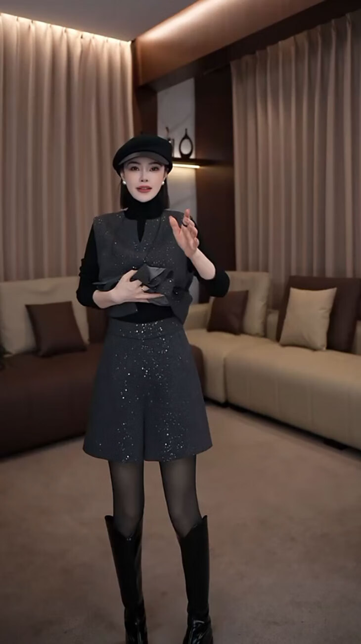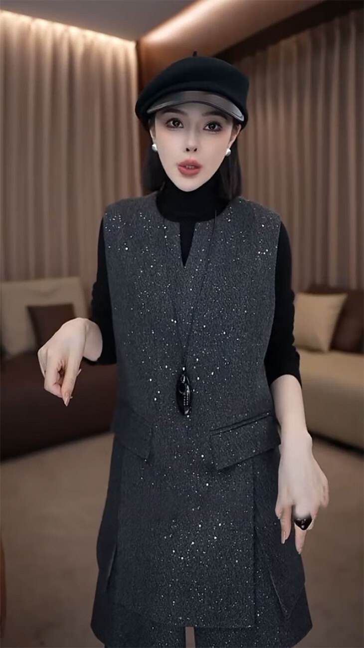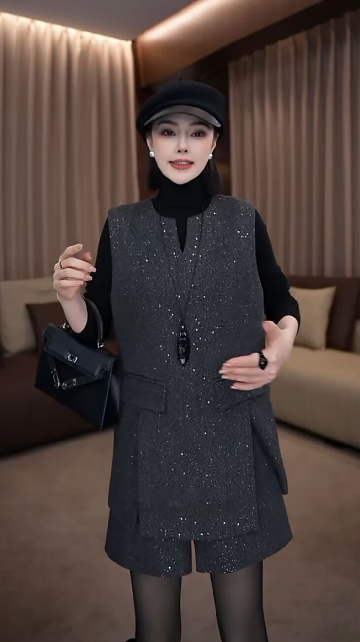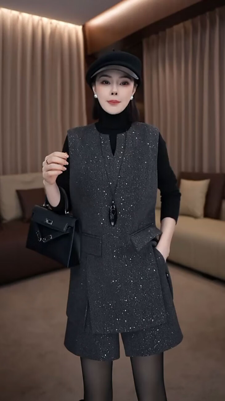 Pierre Cardin fashionable small fragrant vest set 2025 new women's autumn and winter mid-length sleeveless woolen jacket and shorts two-piece set gray vest + shorts S 85-95