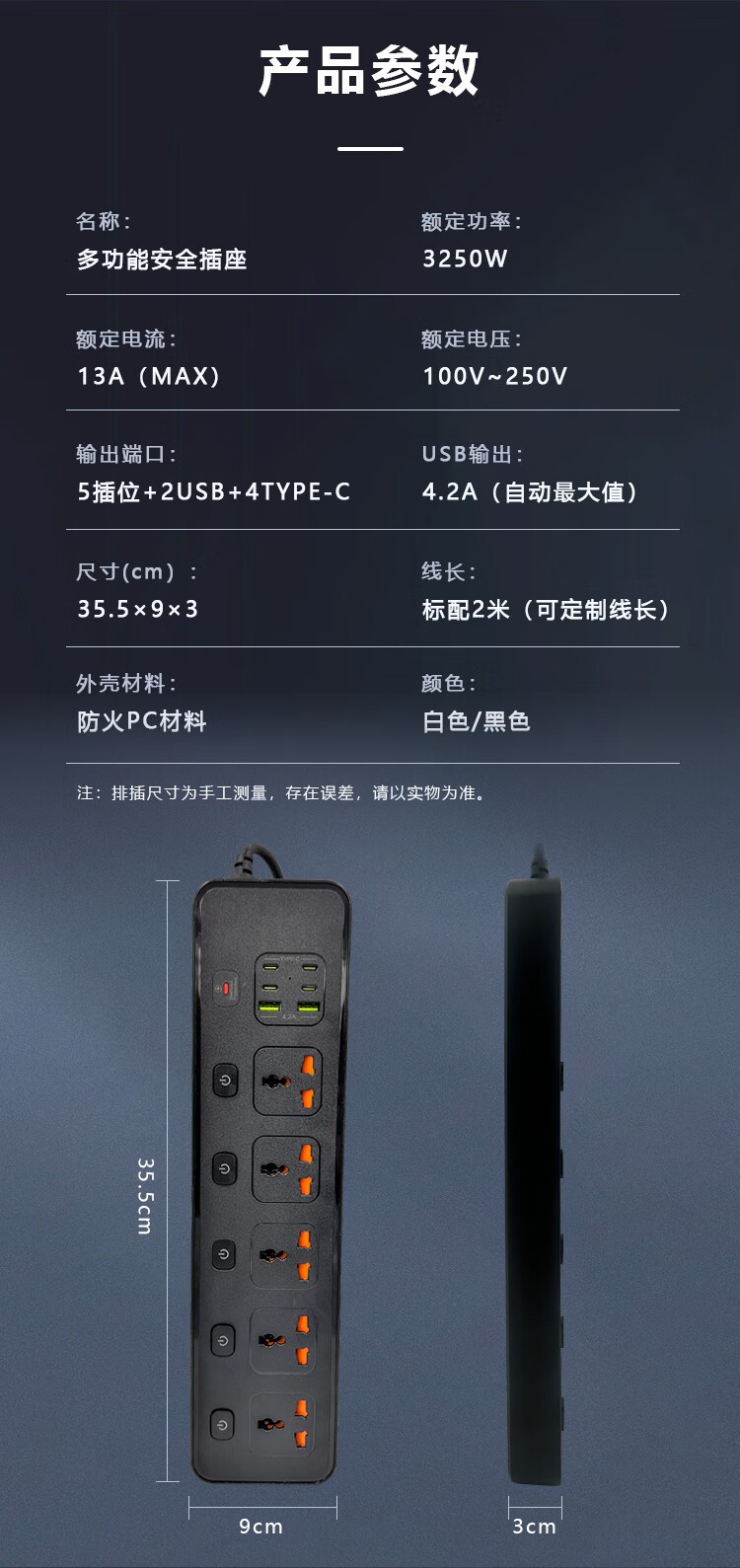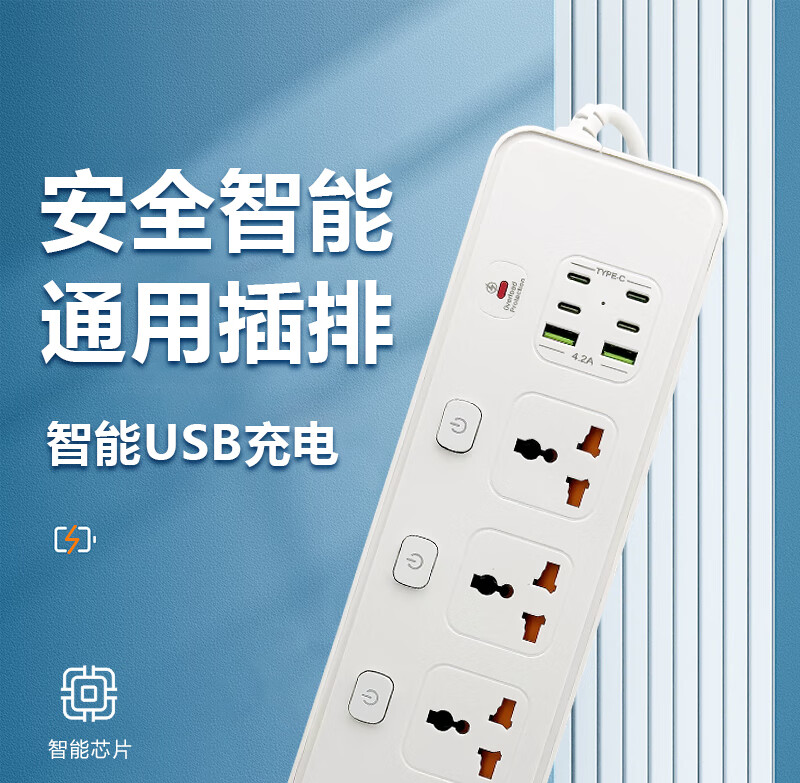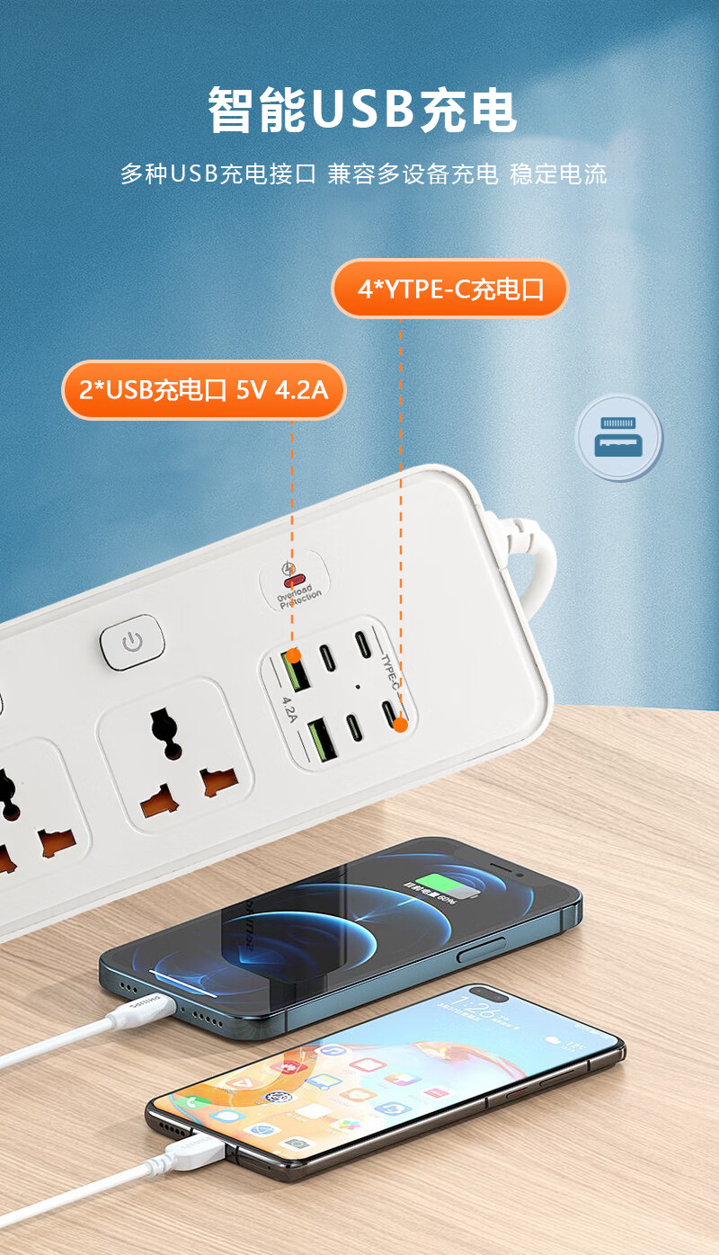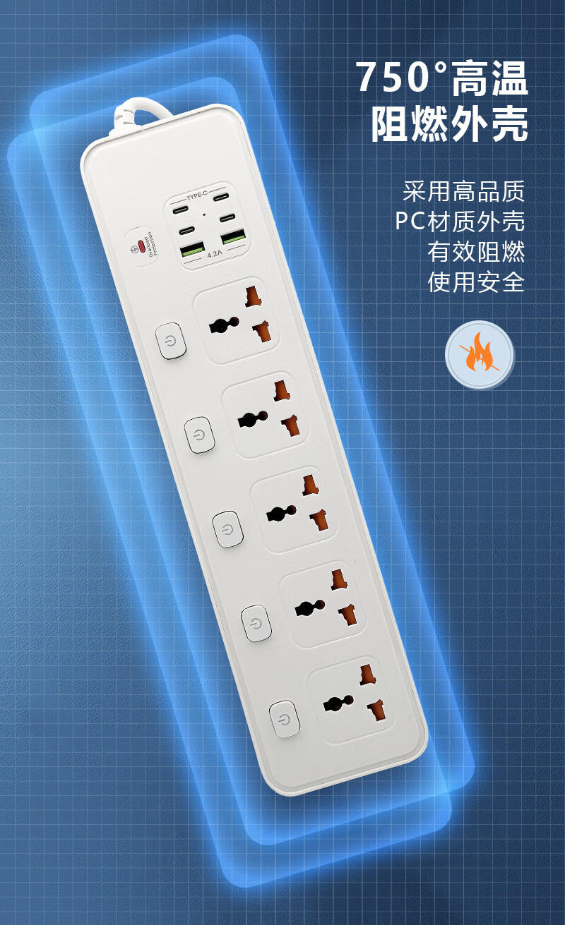 Hong Kong version British 13A British standard USB universal converter strip socket European standard American standard universal wiring board Australian standard plug with overload protection 5-digit international smart 2USB+4PD white