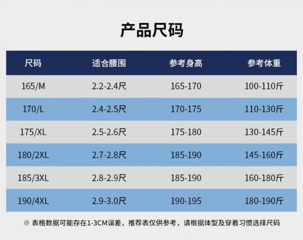China (cm) 165 / 88-90 170 / 96-98 175 / 108-110 180 / 118-122 185 / 126-130