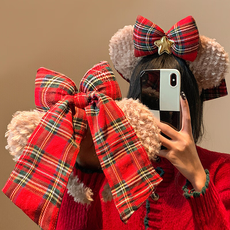 Beautifully made Christmas bow, red bear ears, plush headband, female amusement park photo, face wash, makeup, headband, cute bear headband, 1 piece