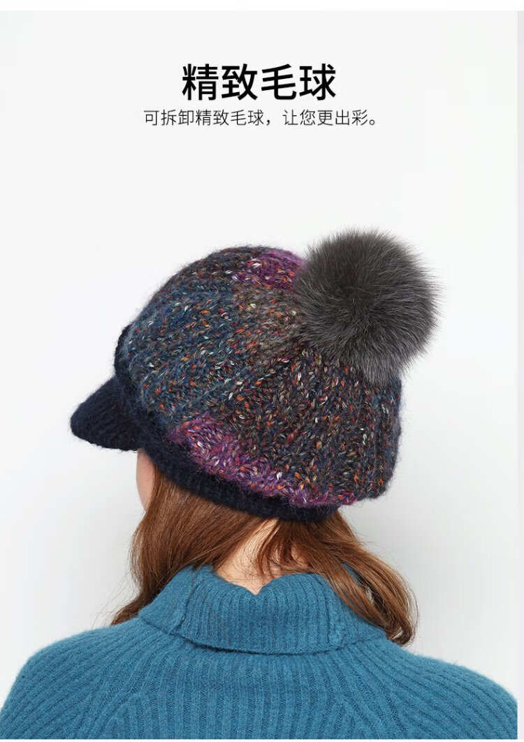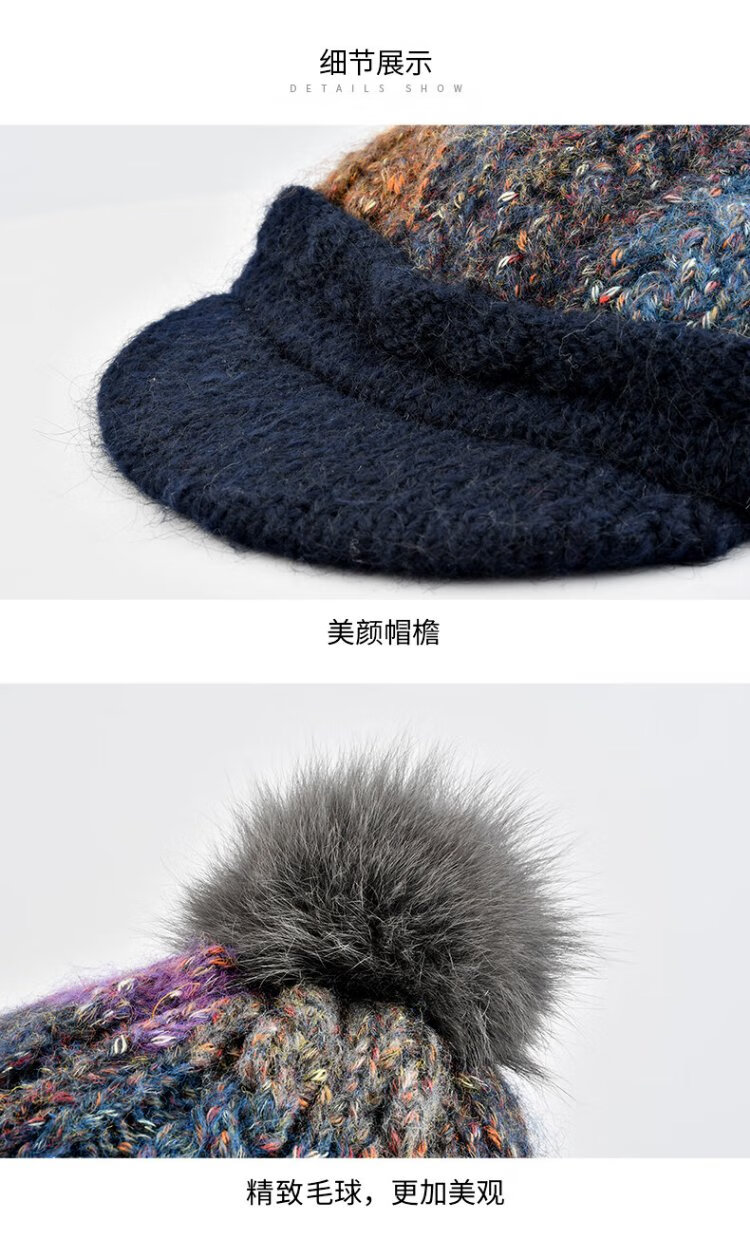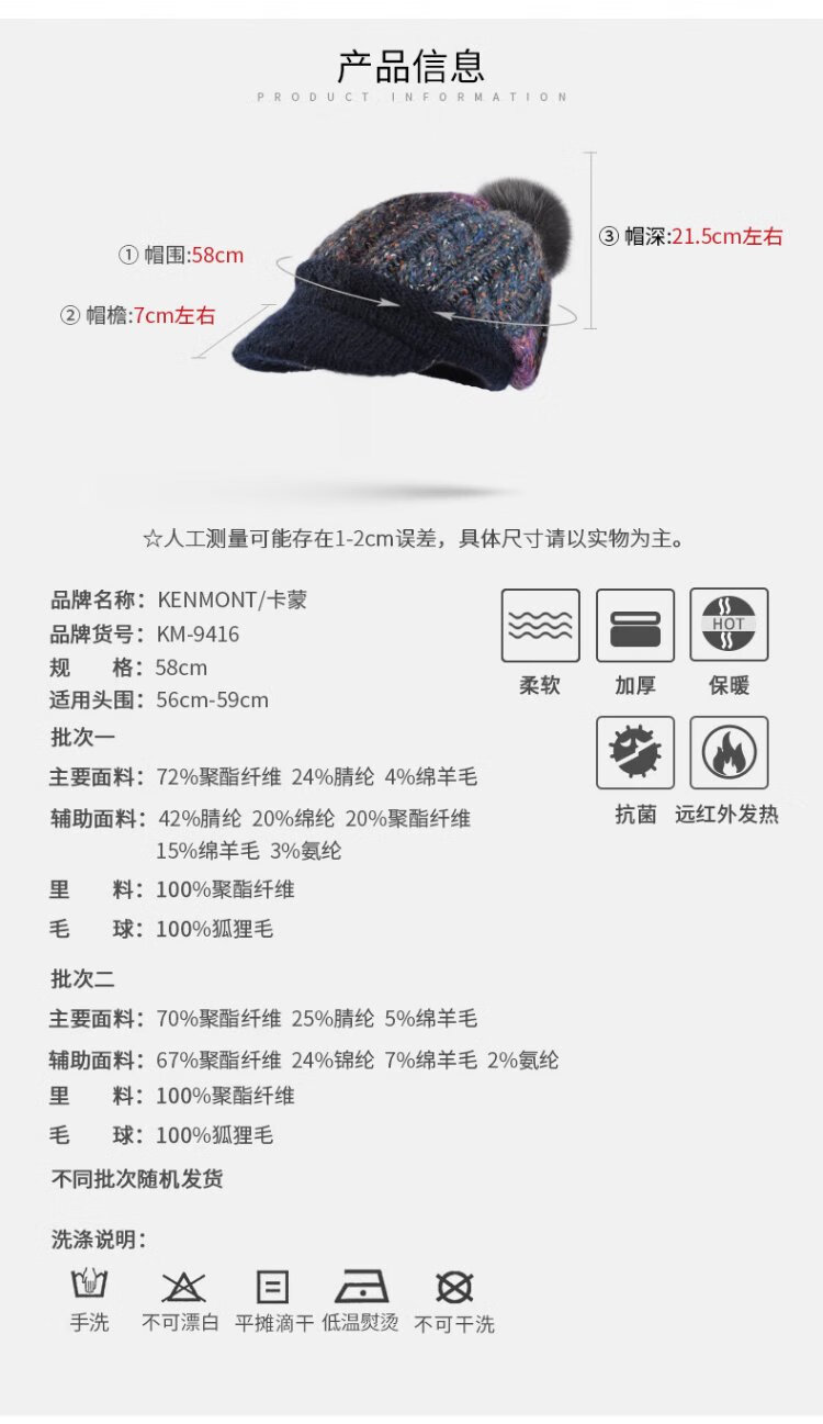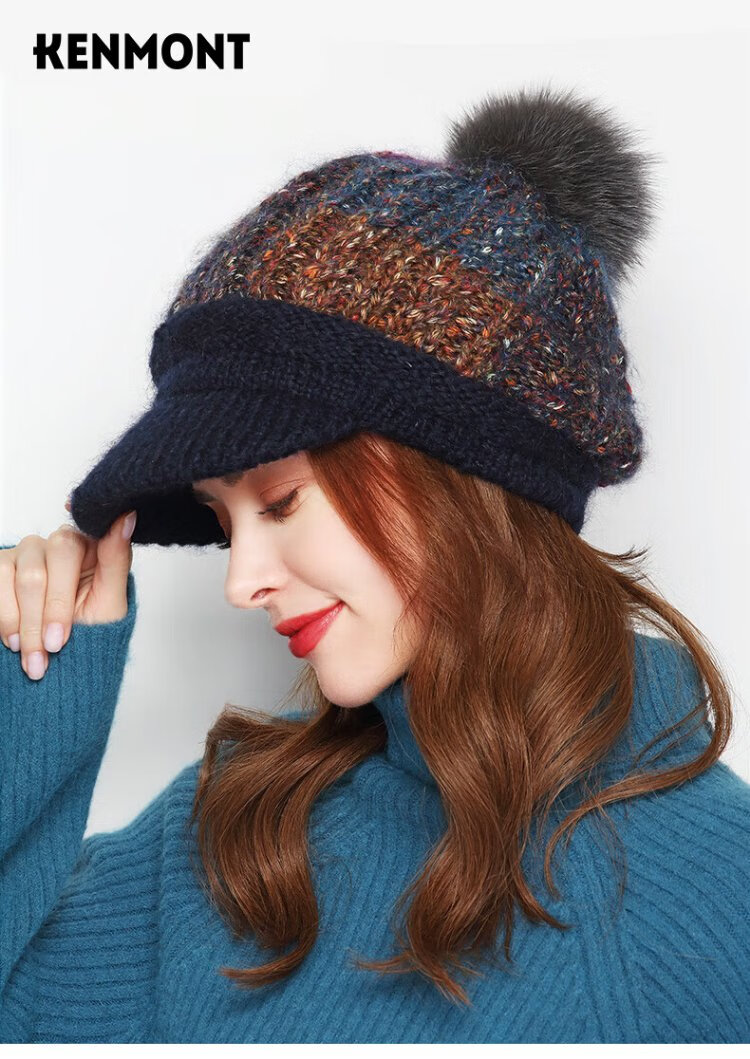 Kenmont Fever Antibacterial Wool Hat Beret Women's Winter Korean Knitted Hat Versatile Back Hat Fox Fur Ball 9416 Navy Hat + Mask One Size 58cm
