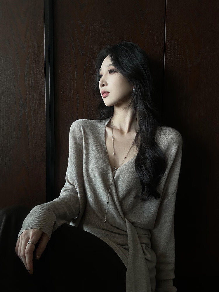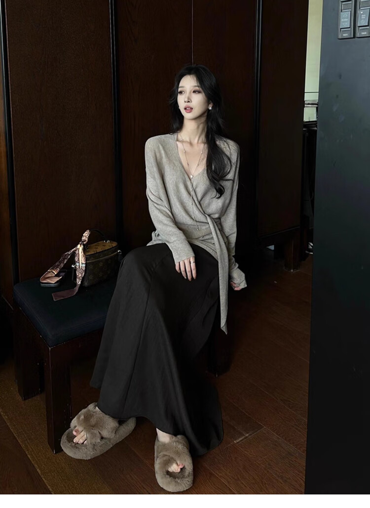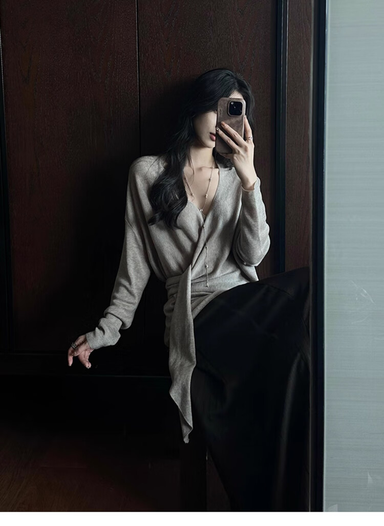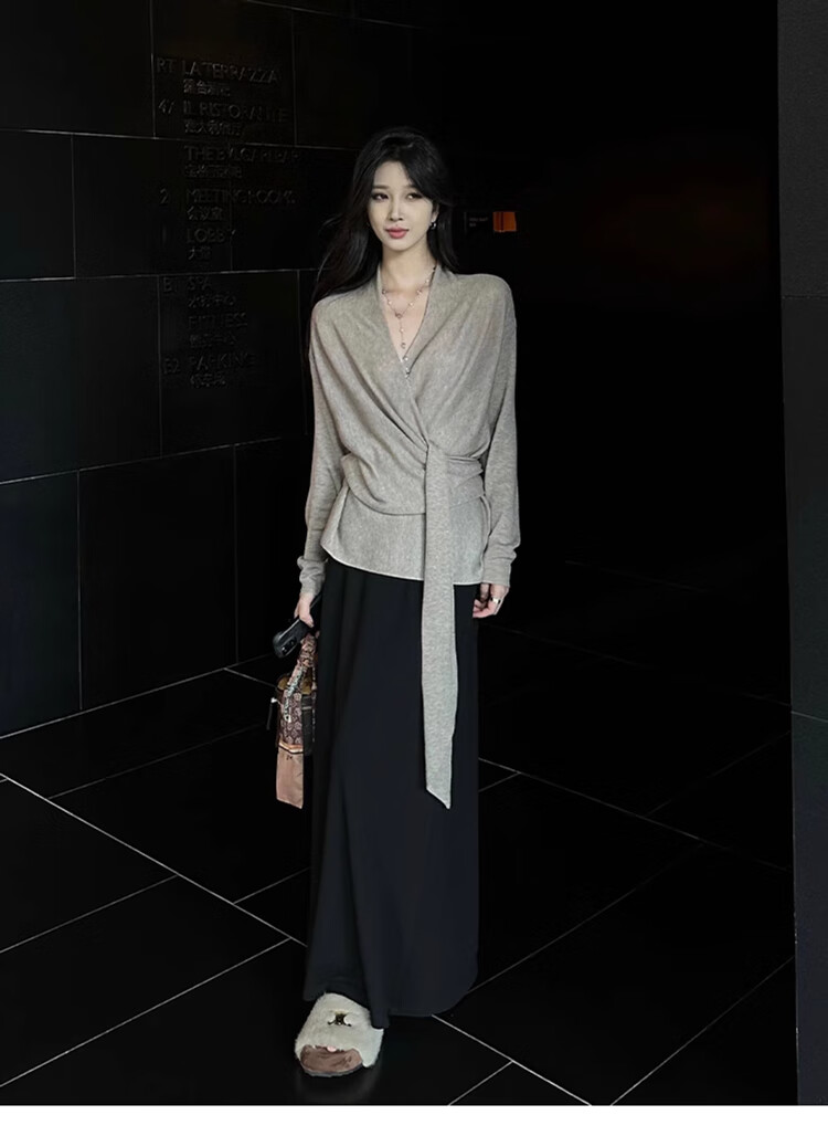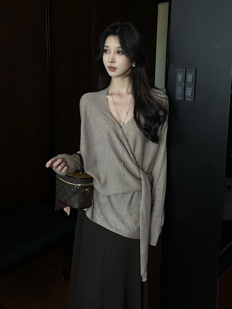 Su Yuwei old money style lazy high-end cross v-neck knitted bottoming shirt for women autumn and winter waist strap sweater inner top oatmeal color follow the store - free shipping insurance S (80-95Jin Jin is equal to 0.5 kg)