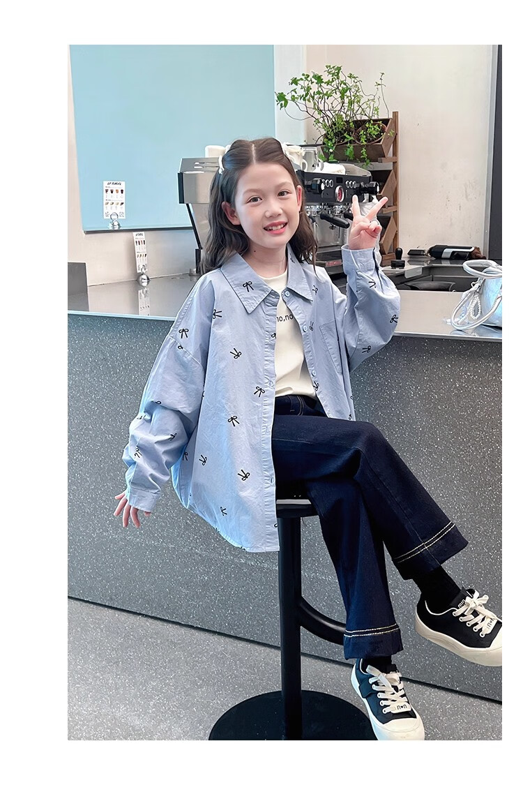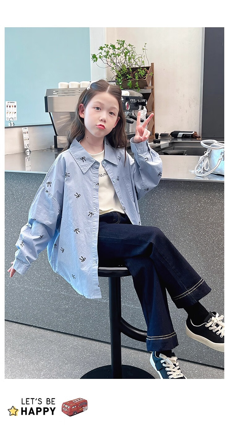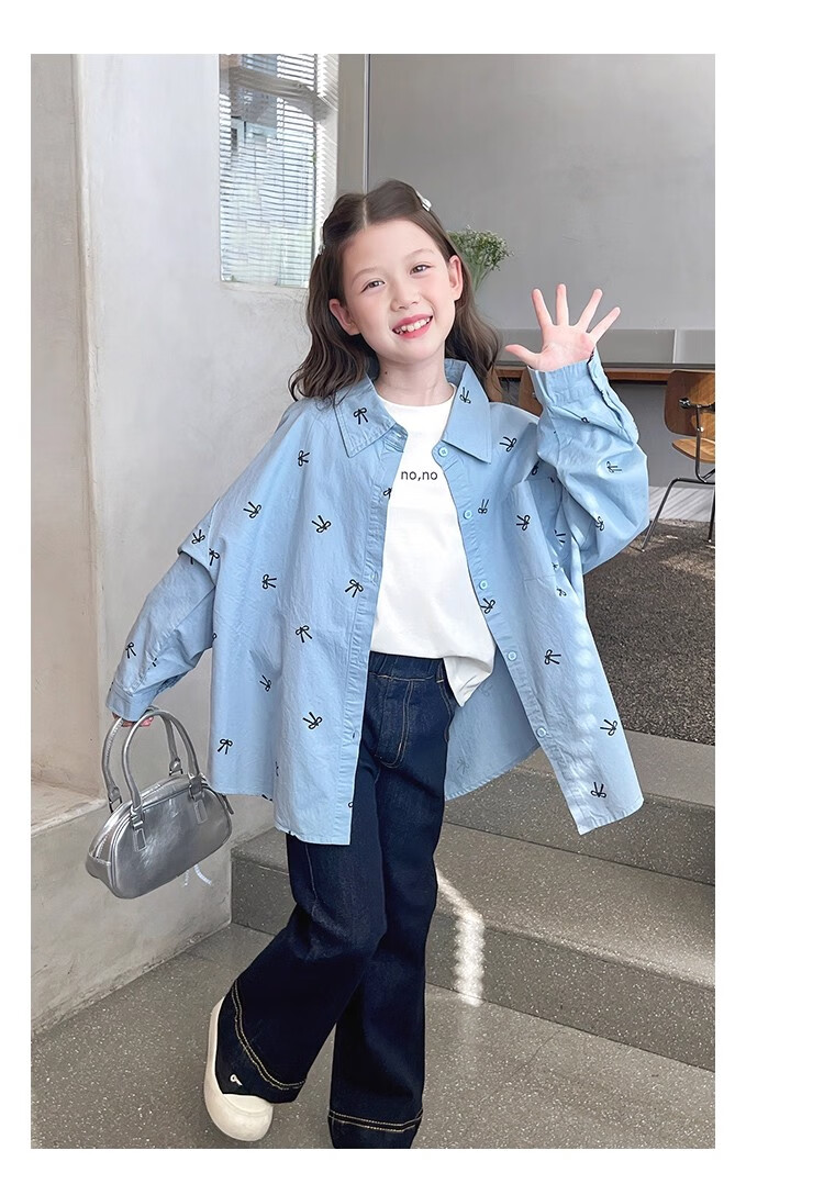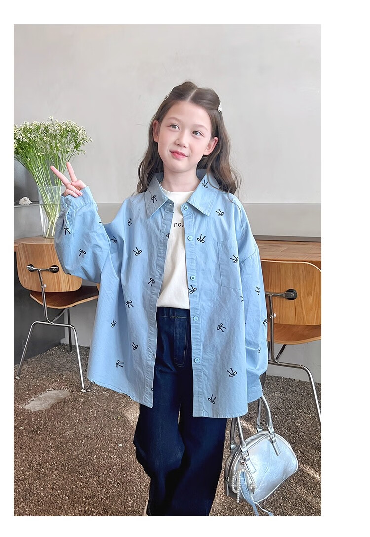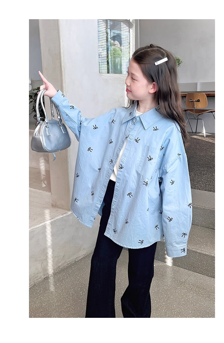 Girls' loose trendy mid-length shirts children's fashionable Internet celebrity shirts big children's tops 2025 spring and autumn new style blue 160