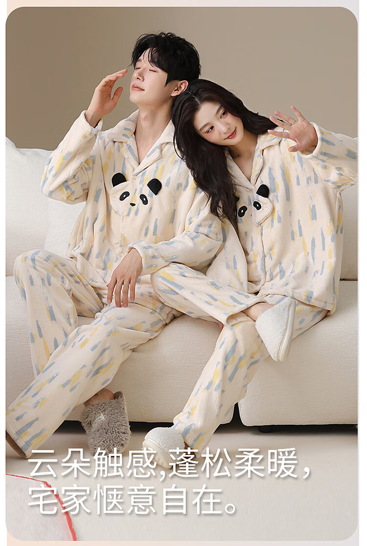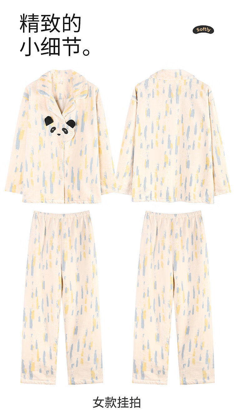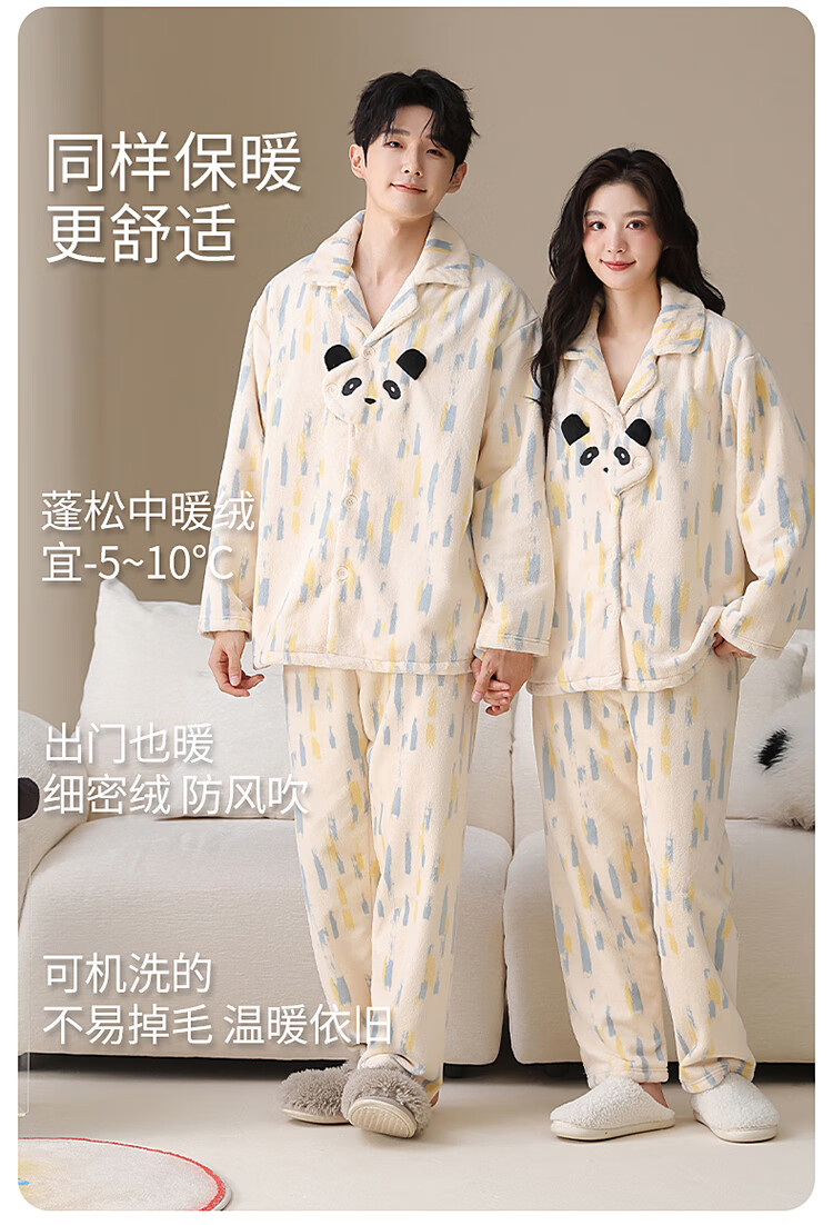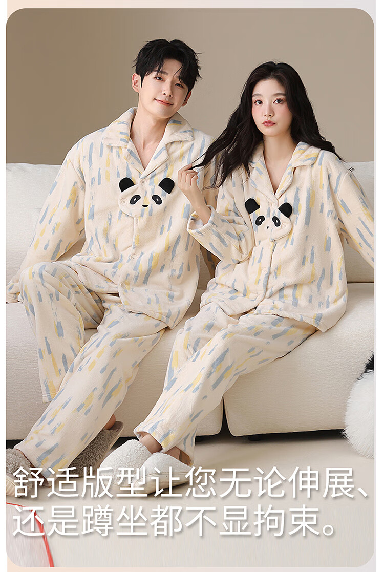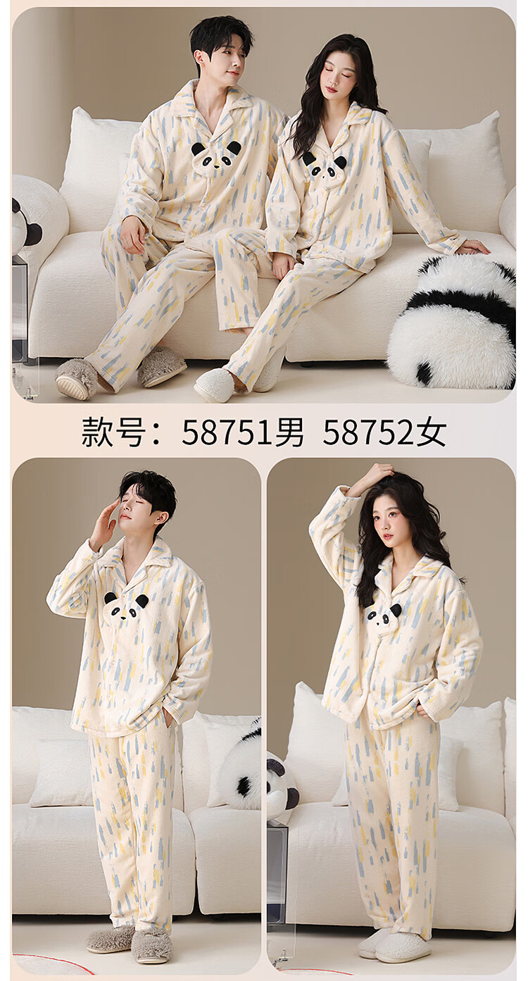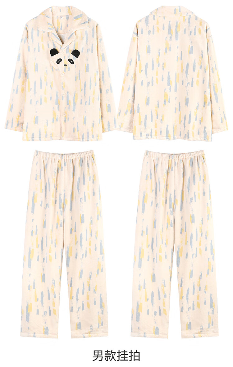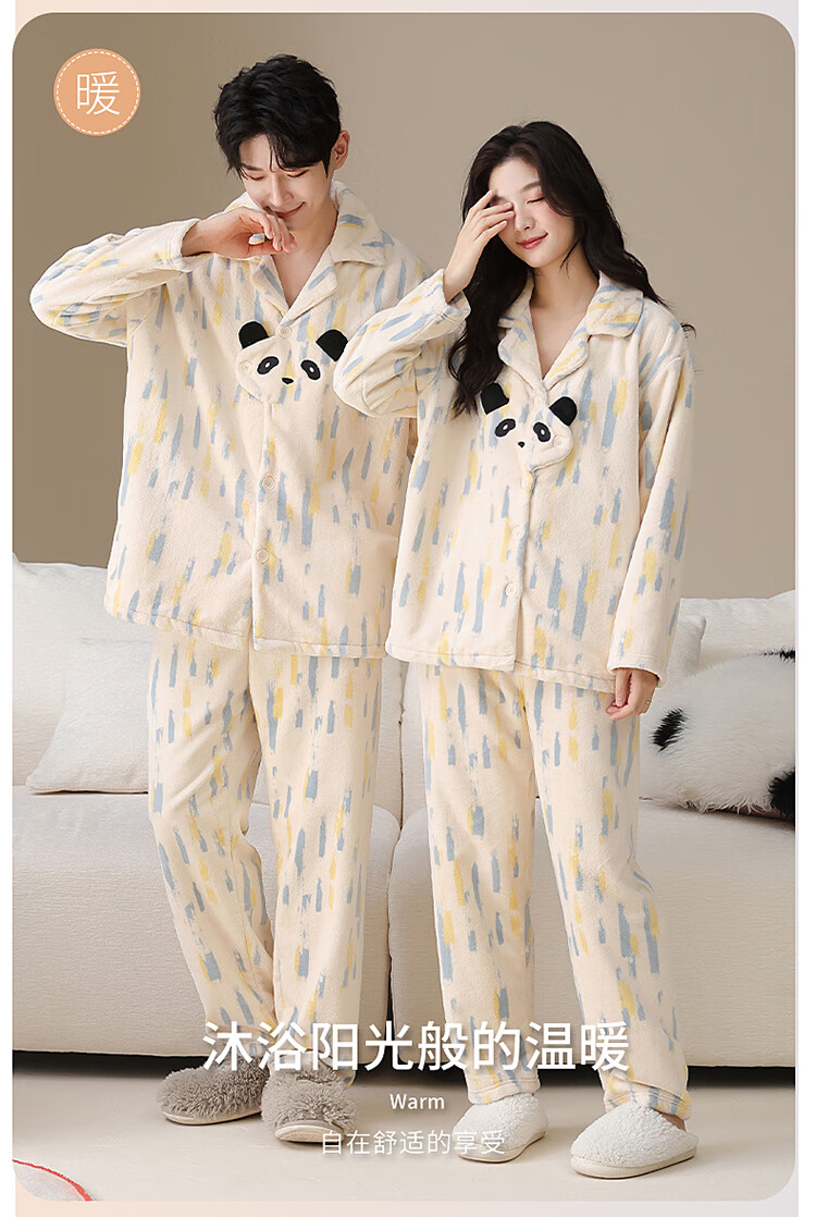 LangSha coral velvet couple pajamas for men and women in autumn and winter plus velvet thickened warm flannel cute cartoon home clothes cartoon bear women's L