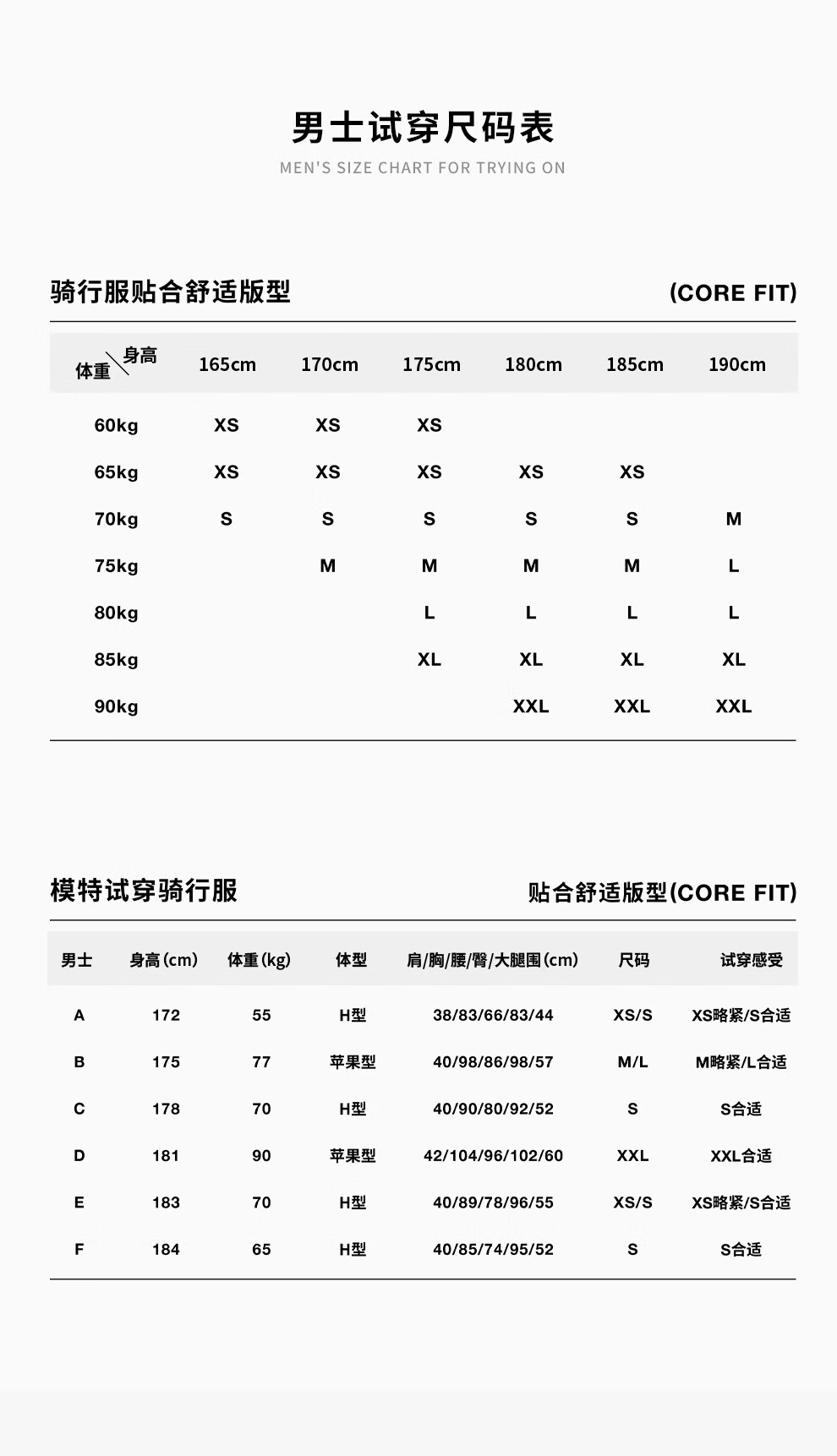 China (cm) 160-165/84-86 165-170 / 88-90 167-172 / 92-96 168-173 / 98-102 170-176 / 106-110