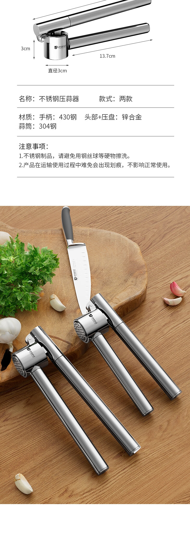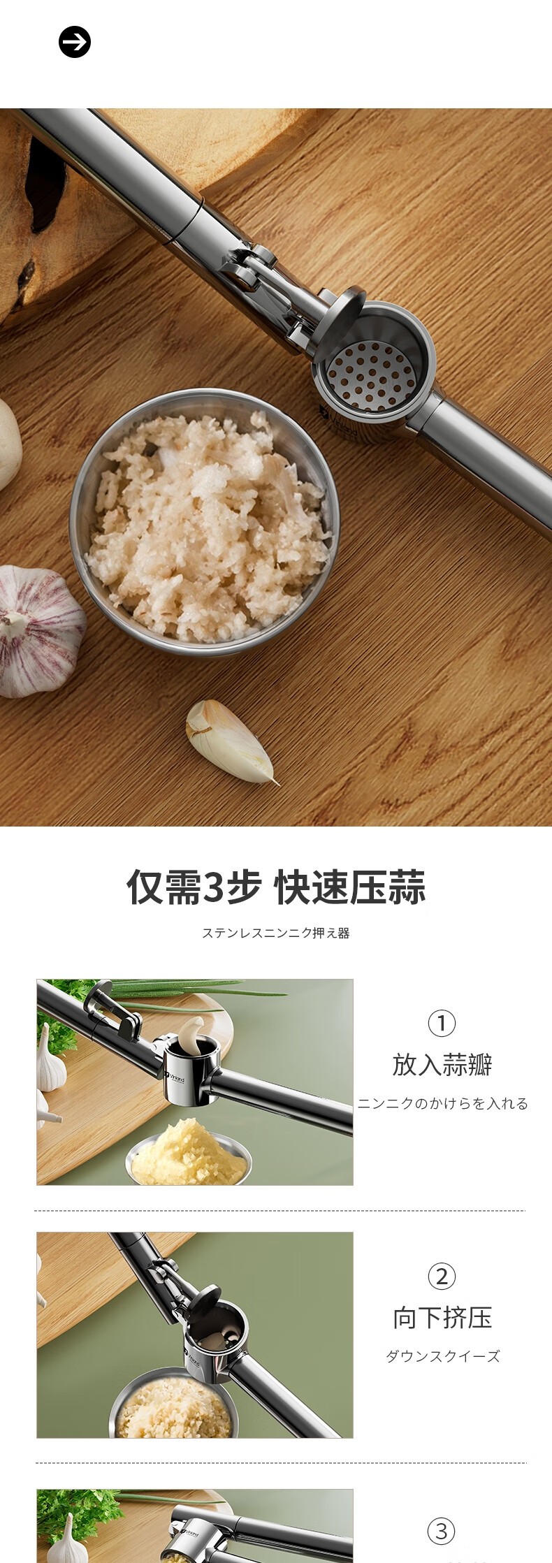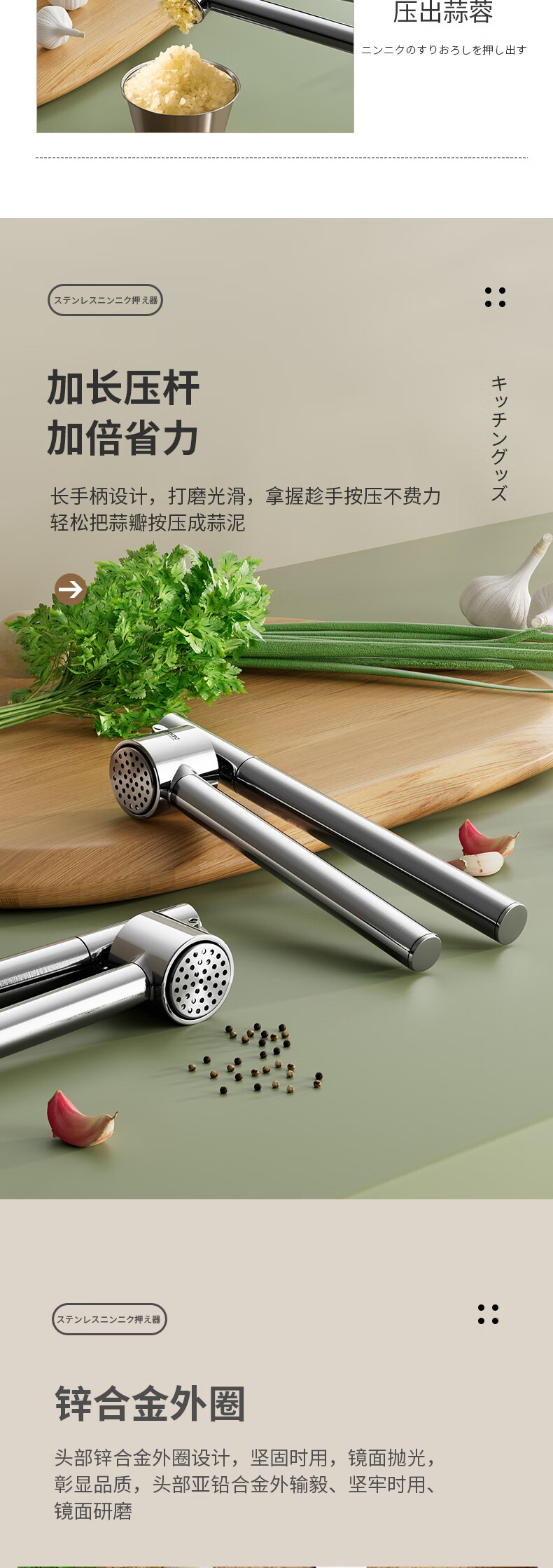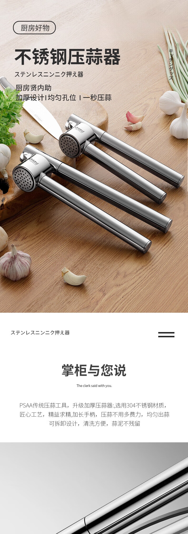Fat Donglai's same style garlic press artifact 304 stainless steel Japanese 304 stainless steel manual garlic clamping, peeling and punching garlic. First generation 304 stainless steel garlic press-extended and larger model. Can press 1 at a time.