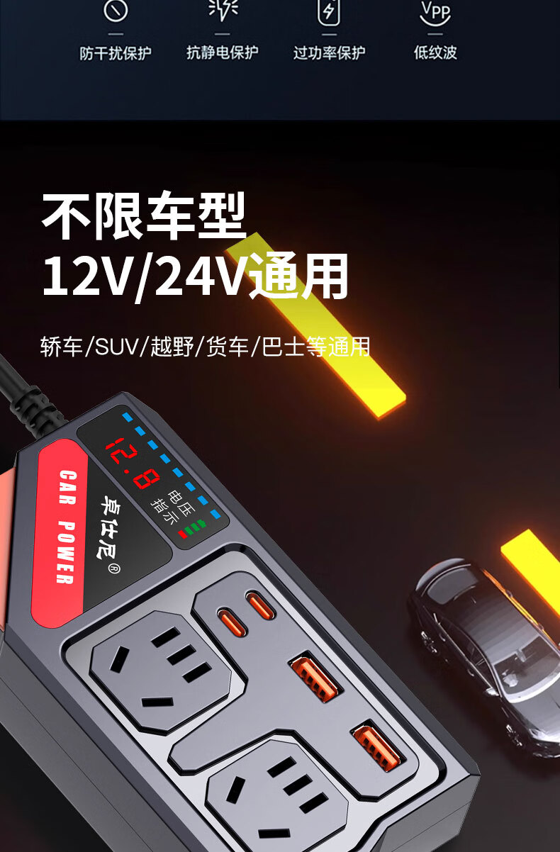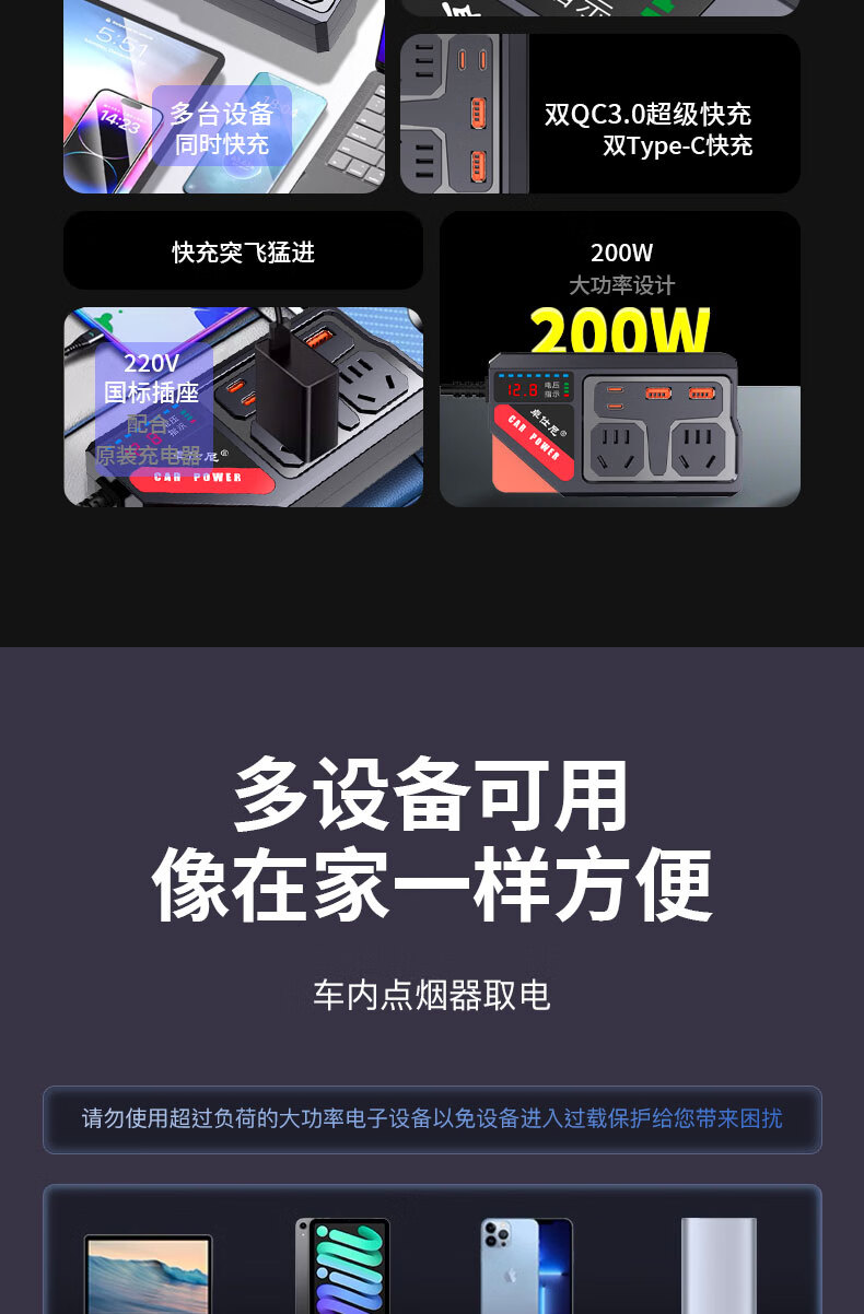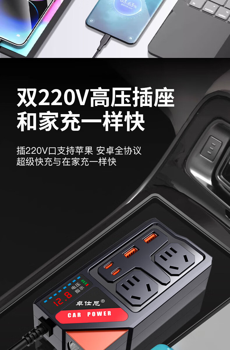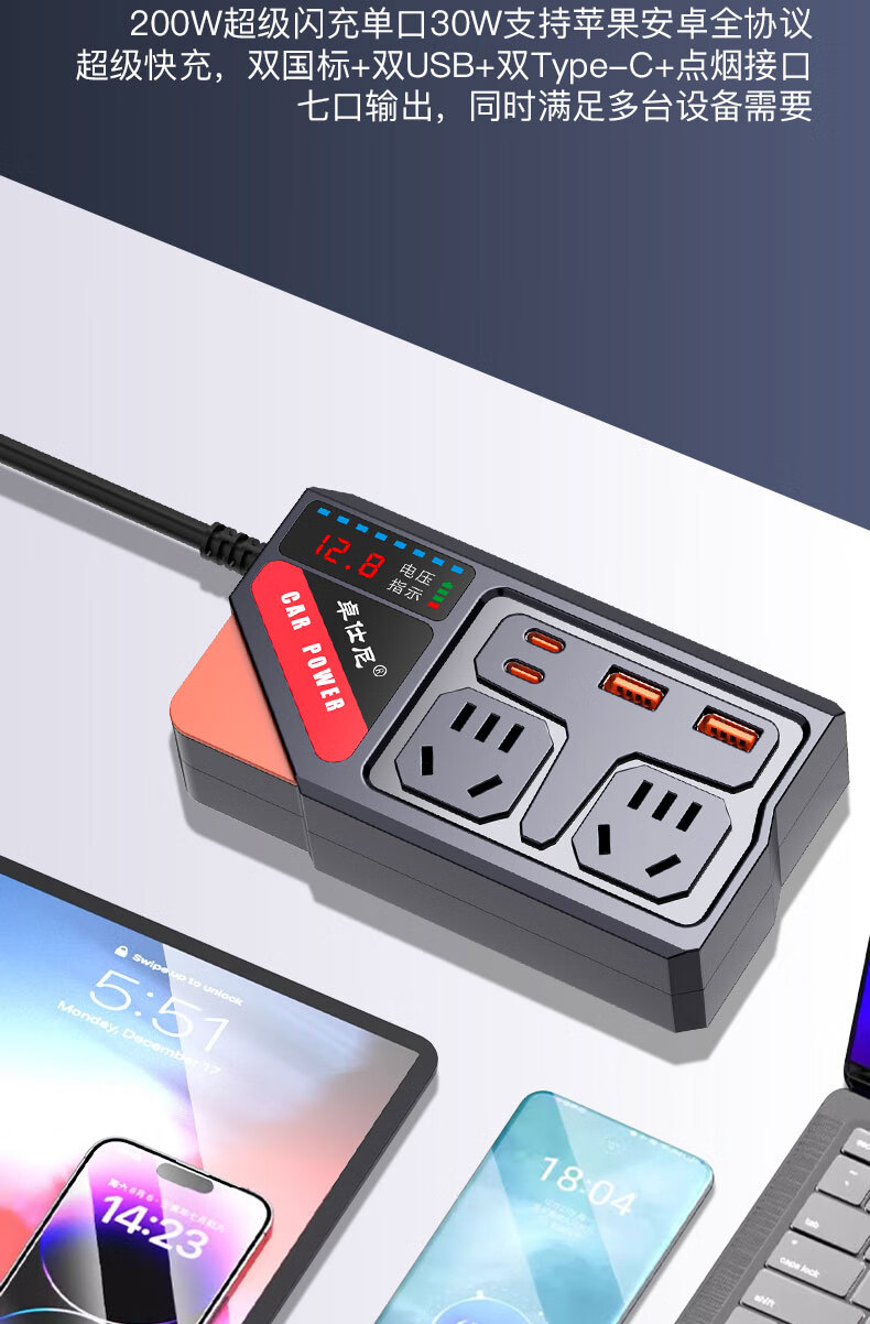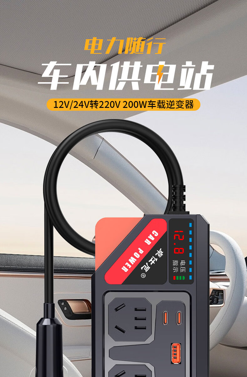Car charger 12V24V to 220V multifunctional inverter cigarette lighter super fast charging source conversion socket 200W high power countless displays porous fast charging + one to three data lines continuous output