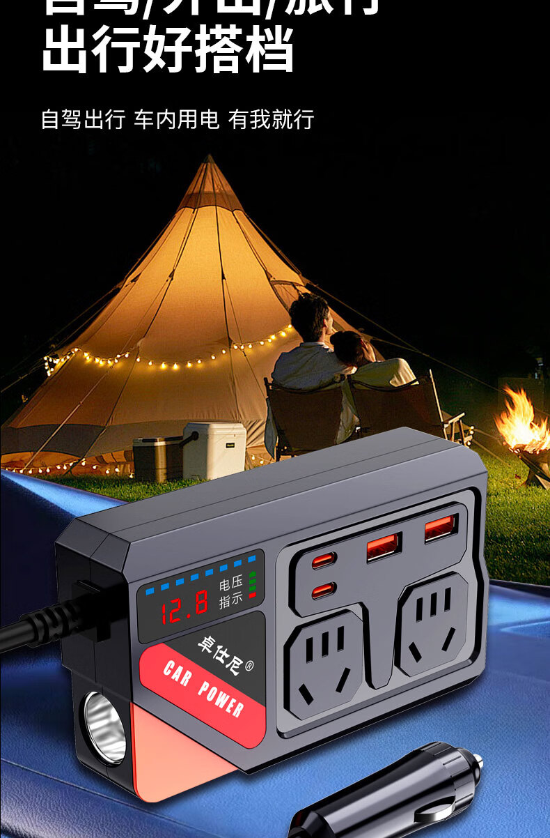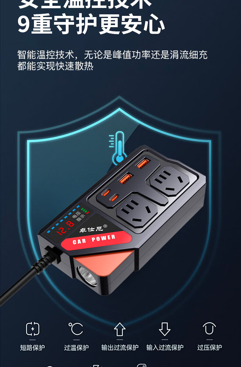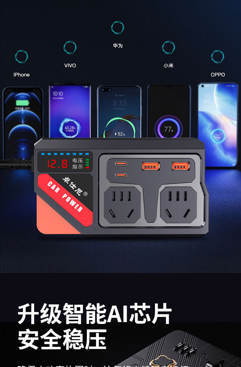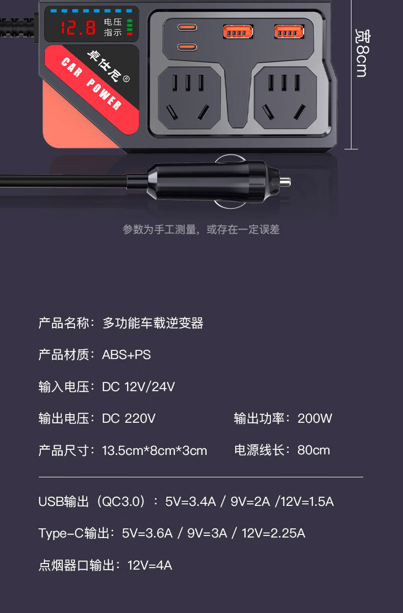 Car charger 12V24V to 220V multifunctional inverter cigarette lighter super fast charging source conversion socket 200W high power countless displays porous fast charging + one to three data lines continuous output