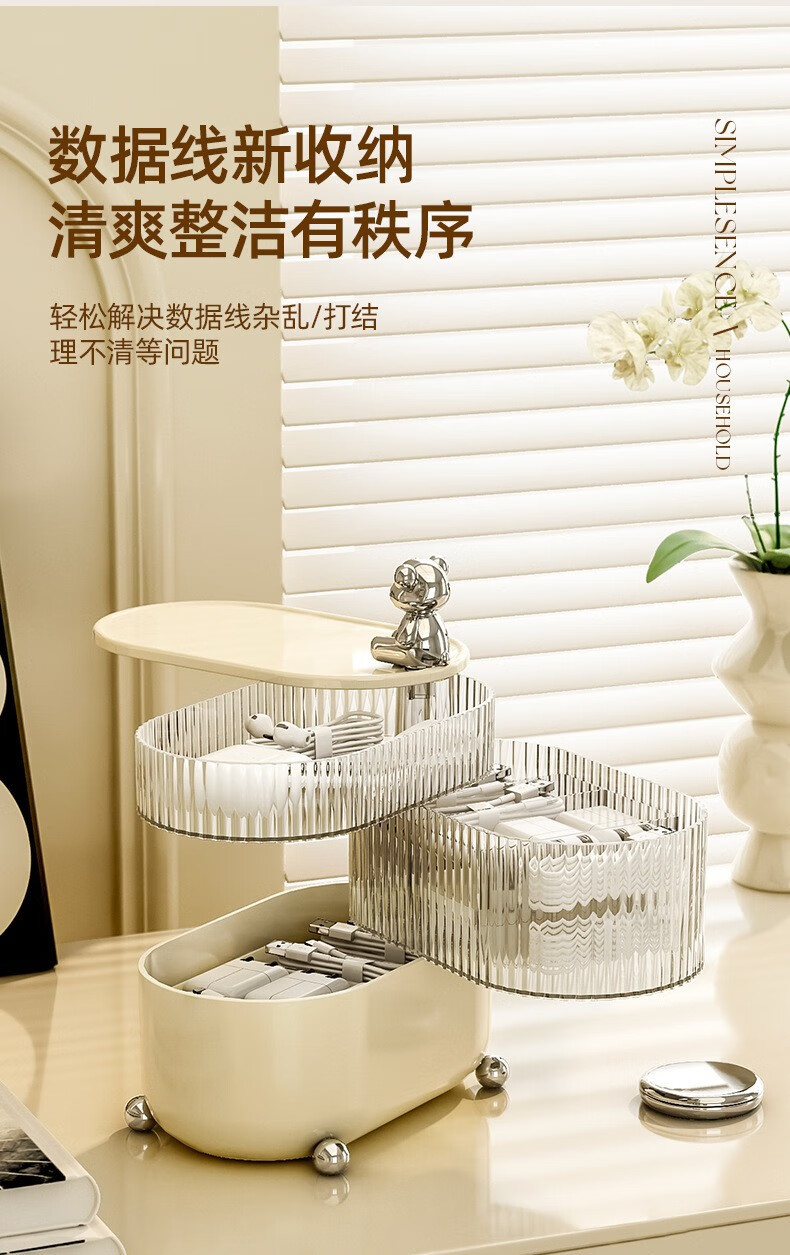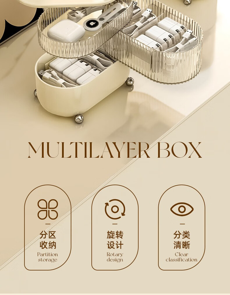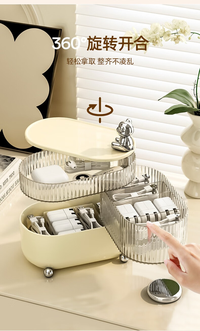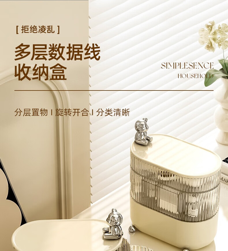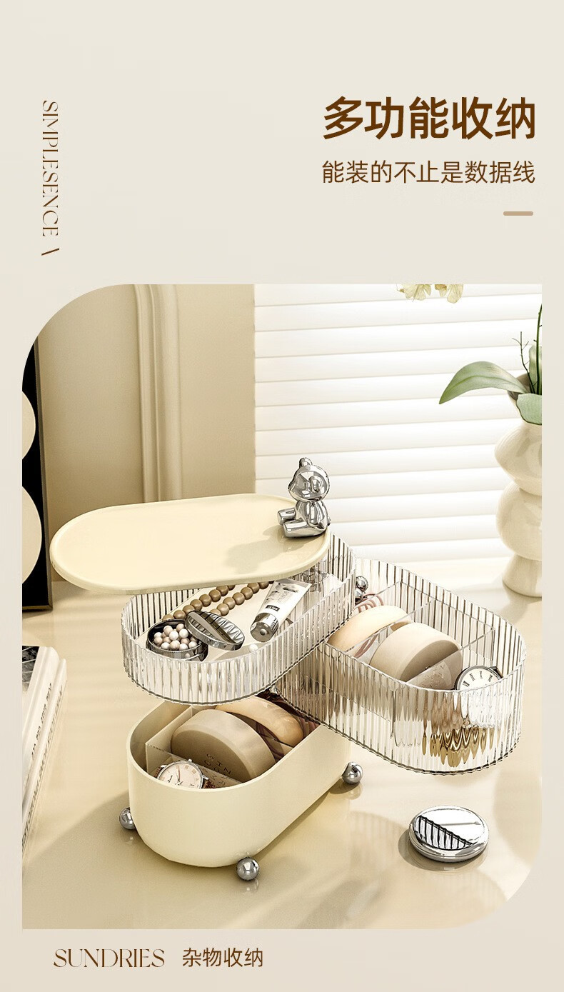 Mi Ling ins style rotating storage box for cosmetics and jewelry transparent compartment storage box desktop data line defense three layers - bear cream white