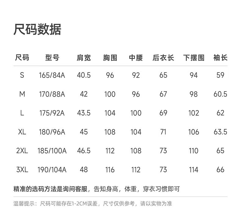 China (cm) 165 / 88-90 170 / 96-98 175 / 108-110 180 / 118-122 185 / 126-130