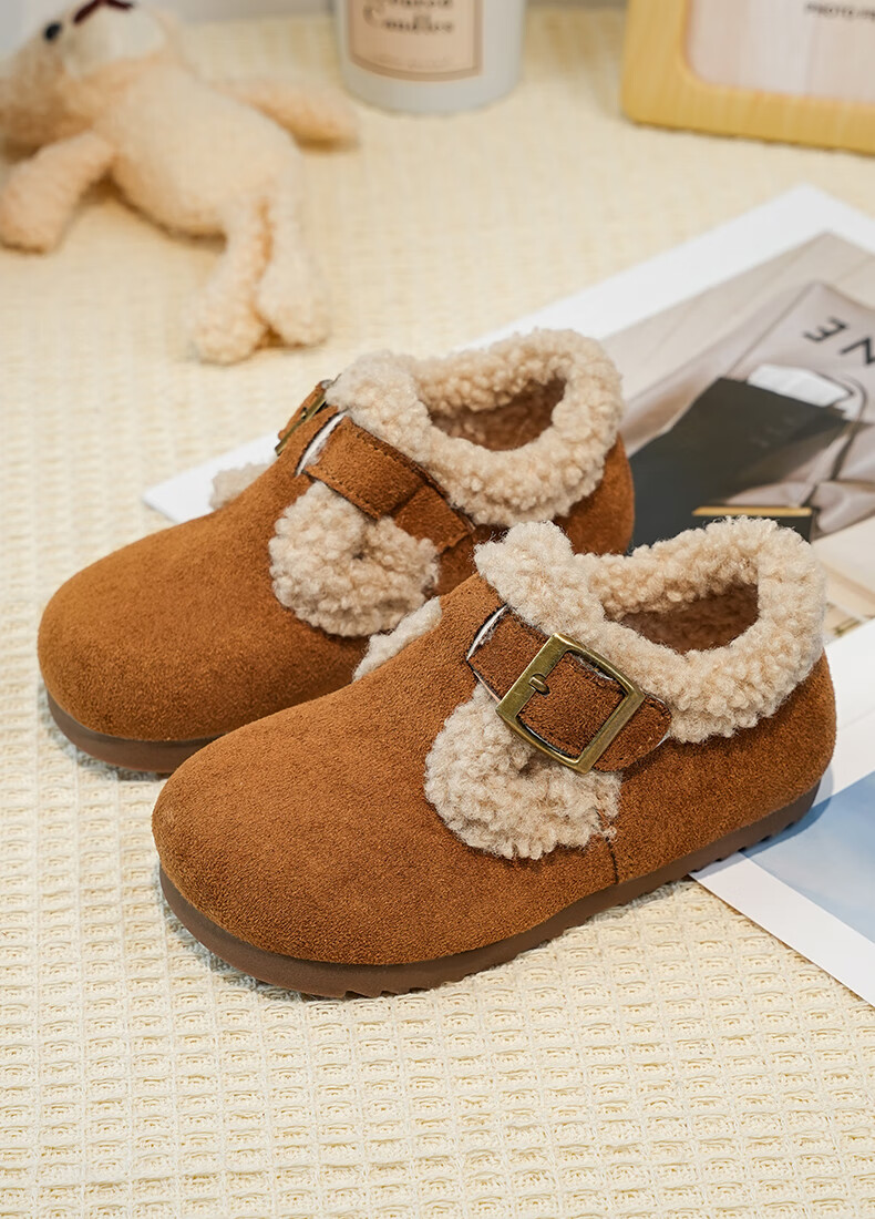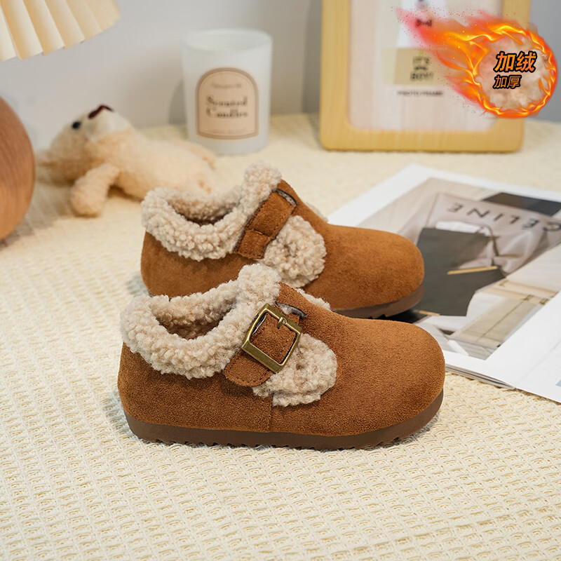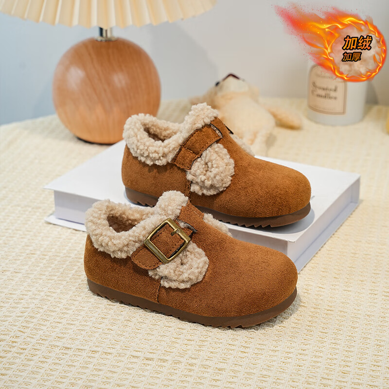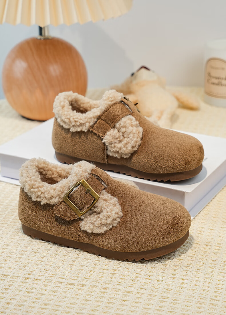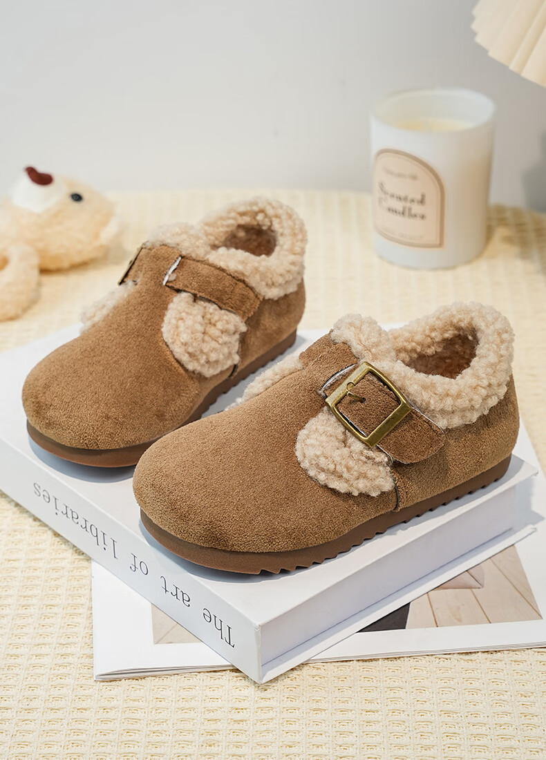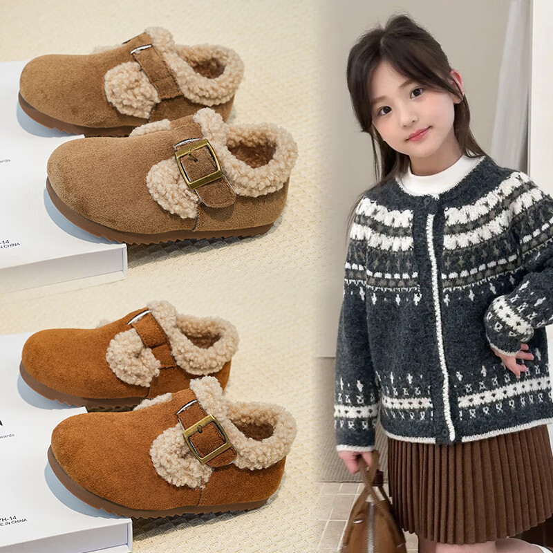Girls' Birkenstock shoes plus velvet children's shoes 2025 winter new little girl's cotton shoes autumn and winter edamame shoes khaki color size 34 inner length 20.8cm
