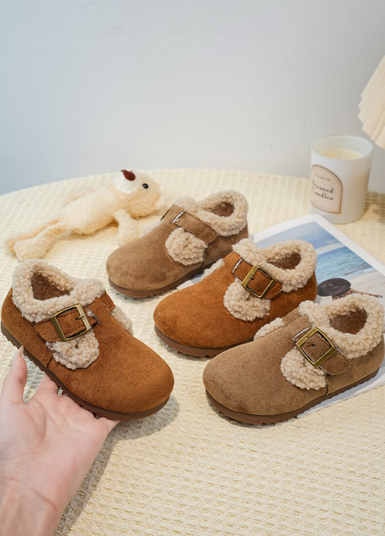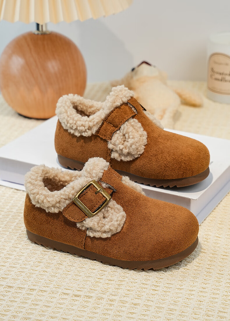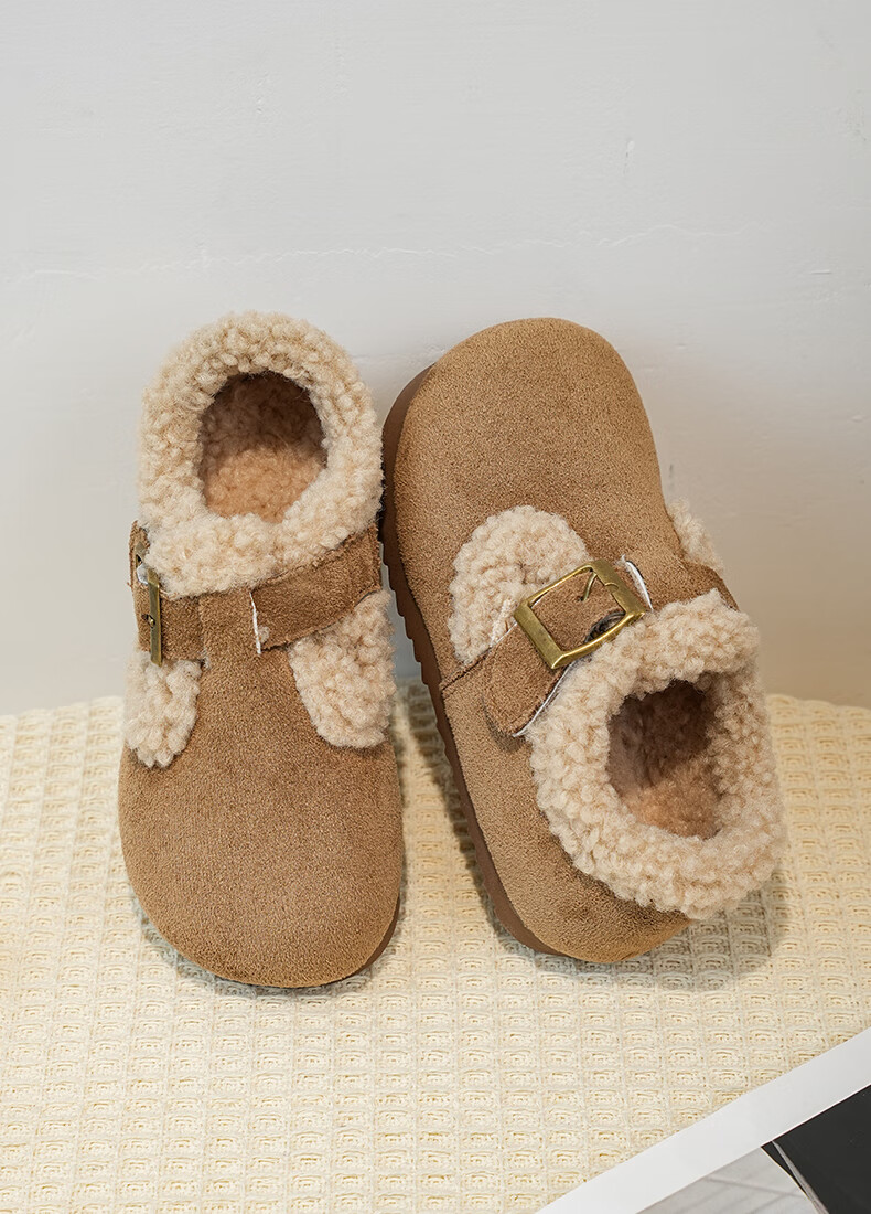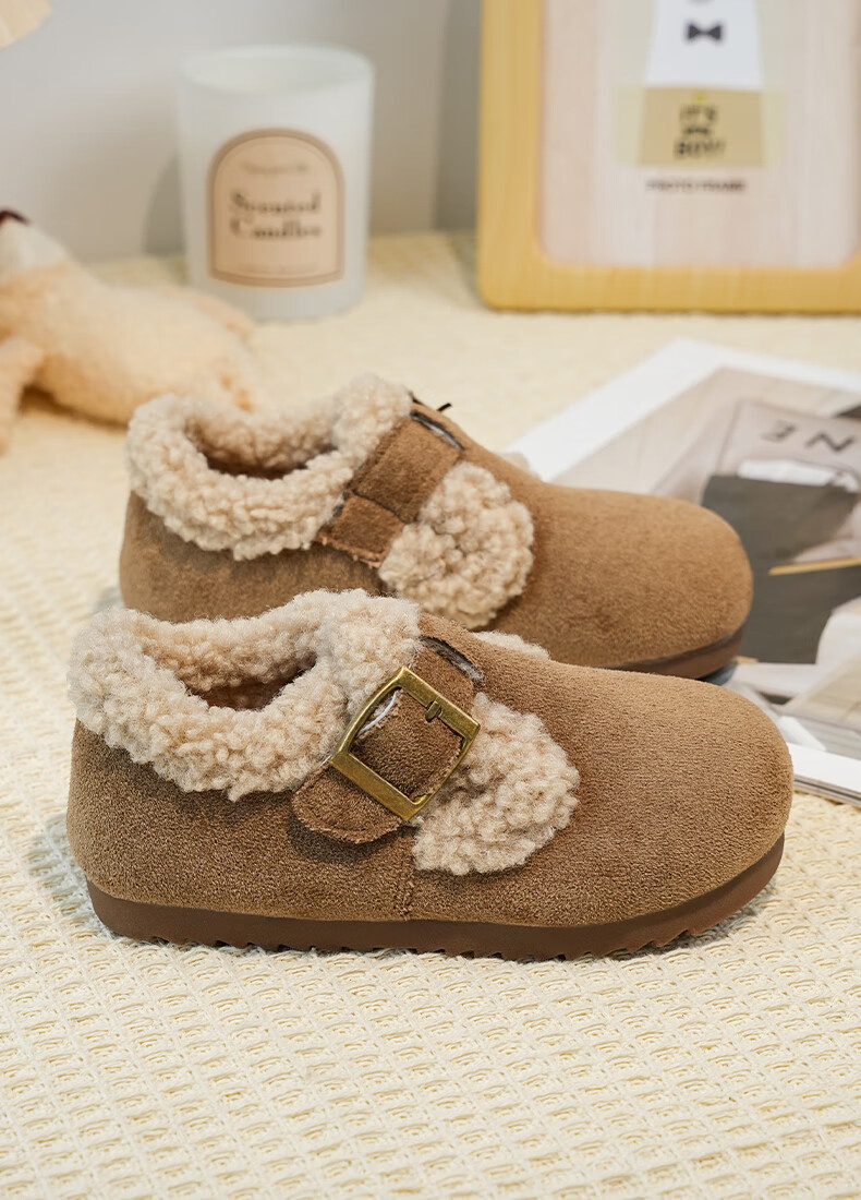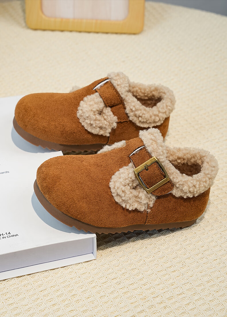 Girls' Birkenstock shoes plus velvet children's shoes 2025 winter new little girl's cotton shoes autumn and winter edamame shoes khaki color size 34 inner length 20.8cm