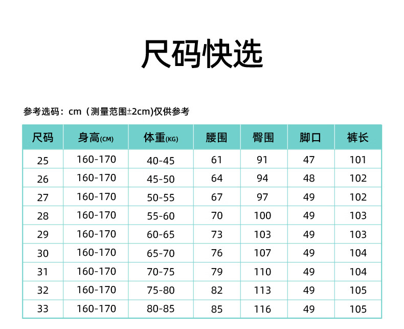 Outseam (cm) 99 cm 101.5 cm 104 cm 106.5 cm 109 cm